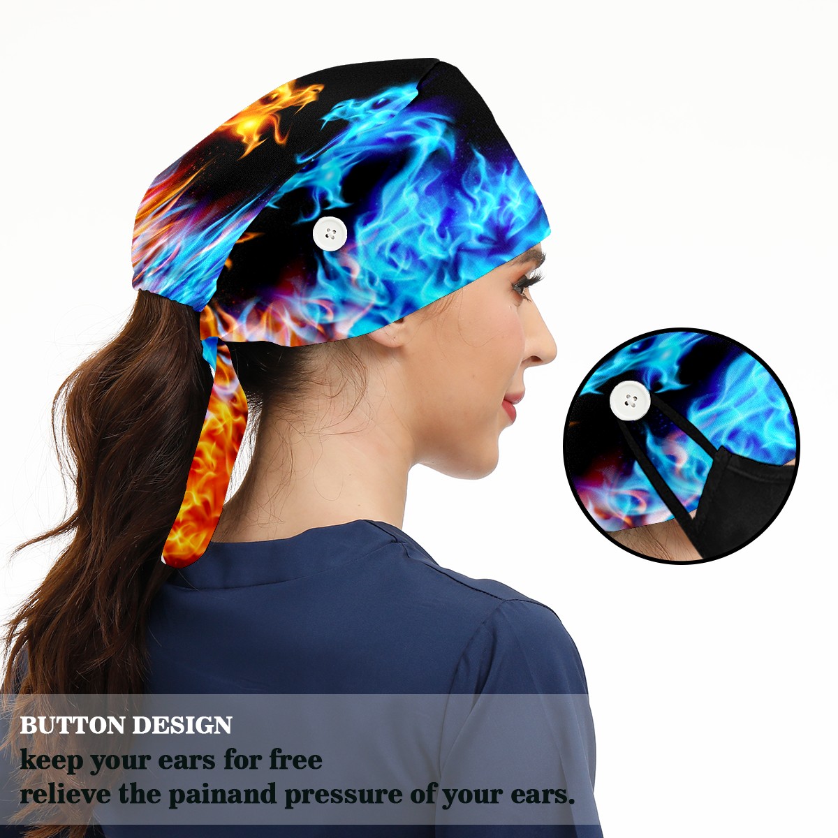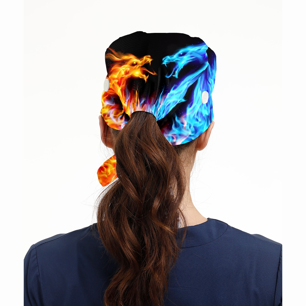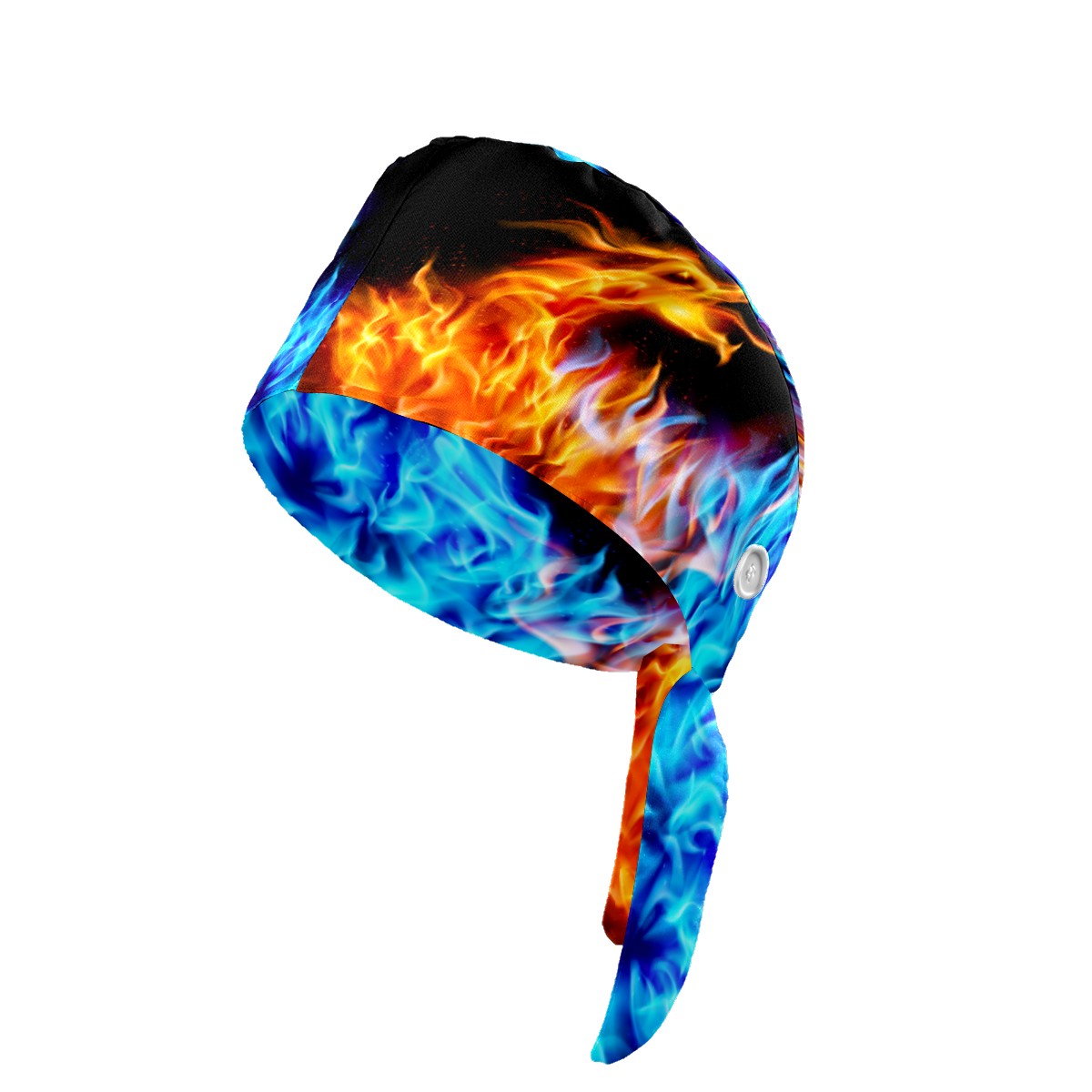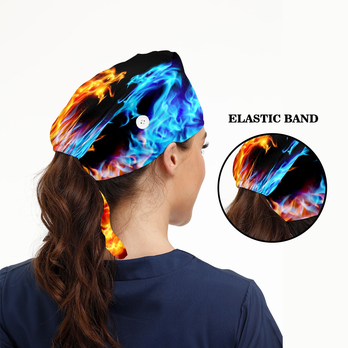 Red Blue Fire Dragon Working Cap Button and Sweatband Adjustable Elastic Head Cover Hair Tie Back Work Hats for Women Men