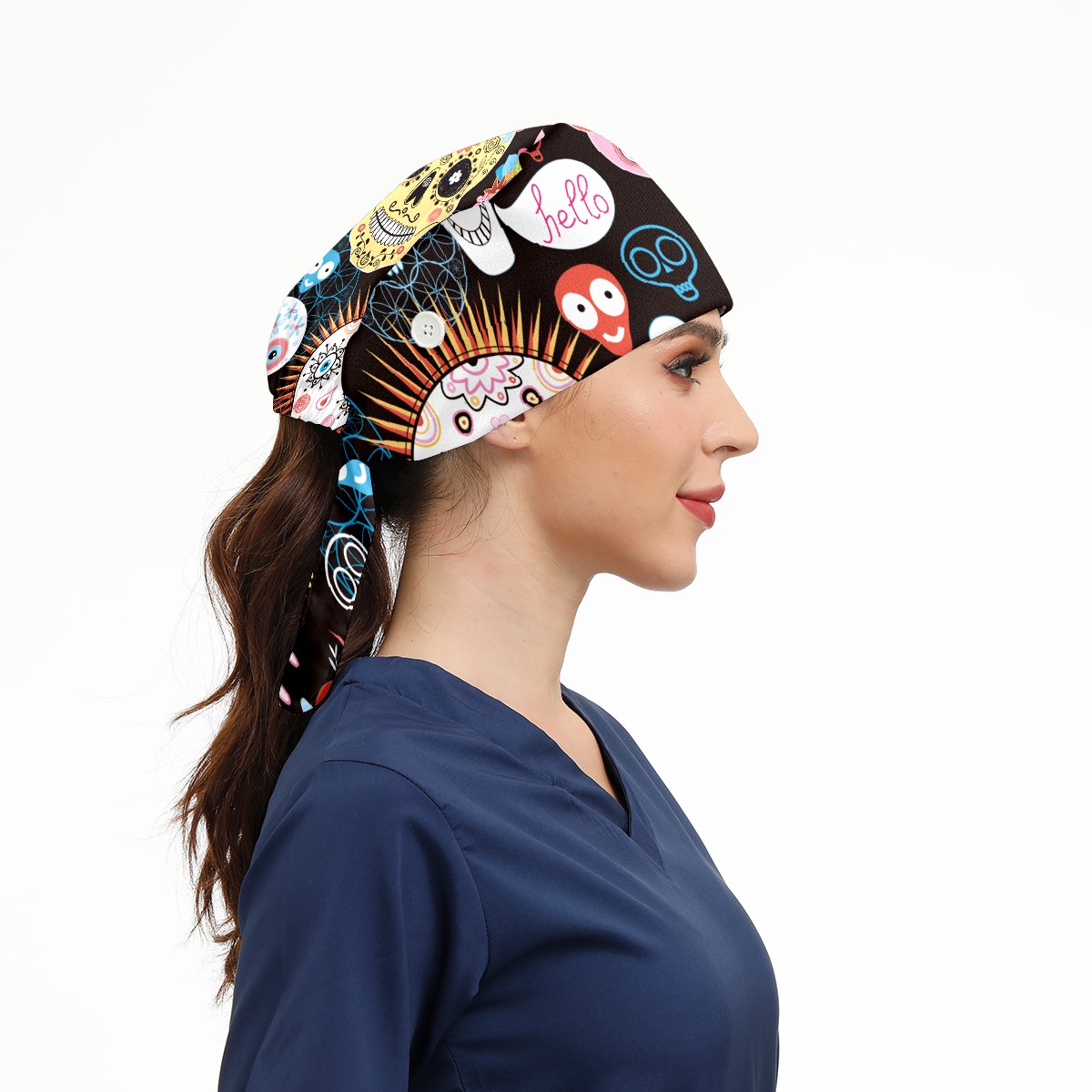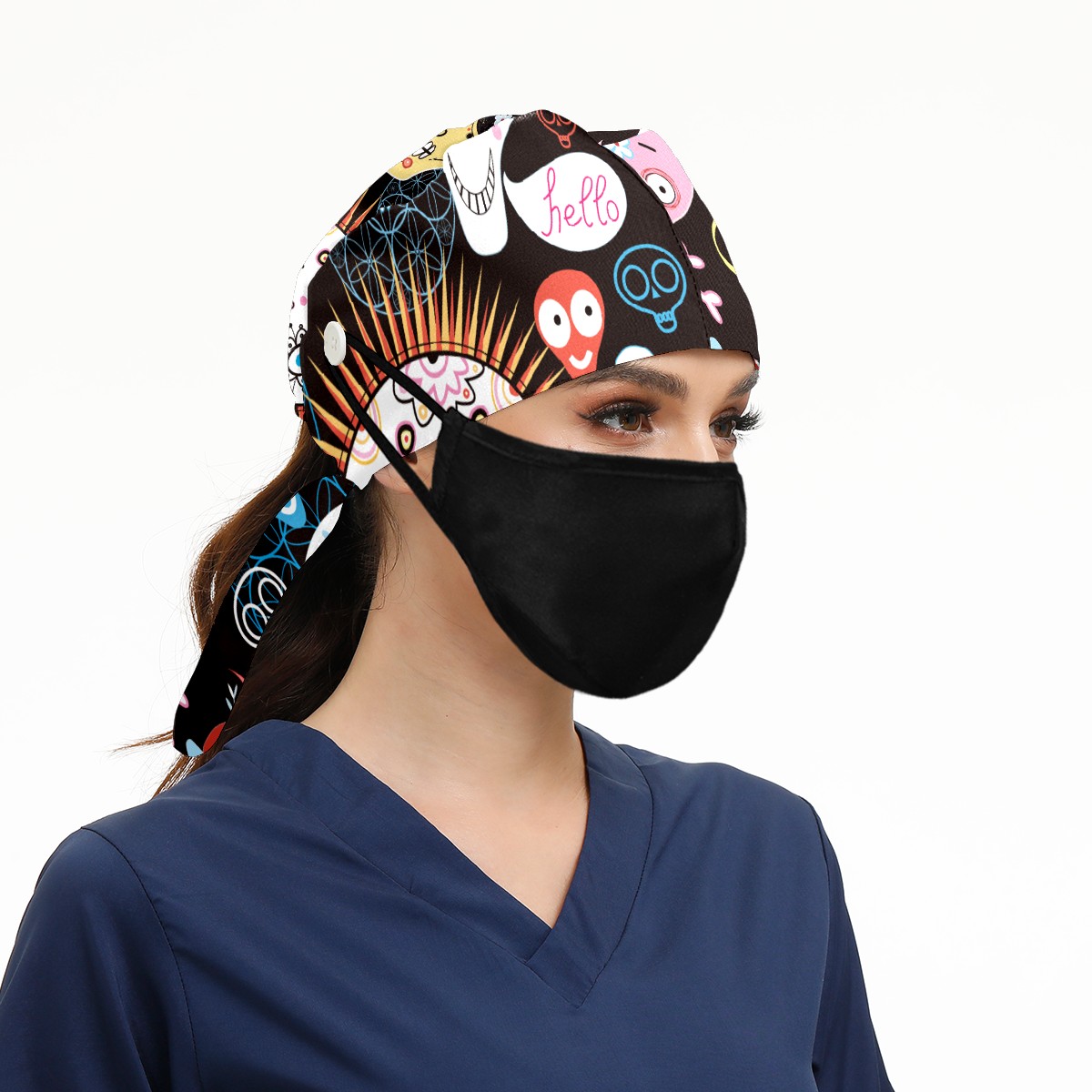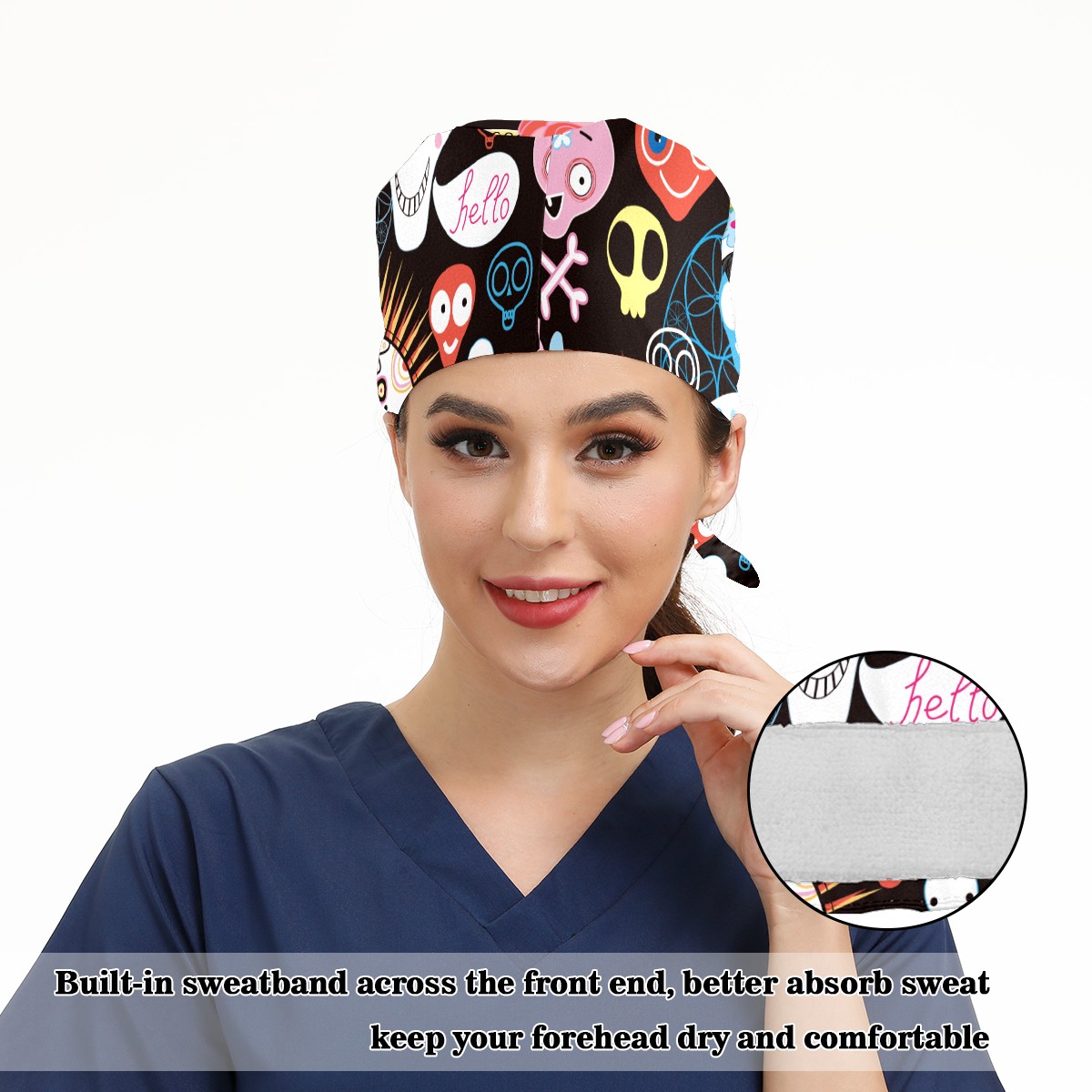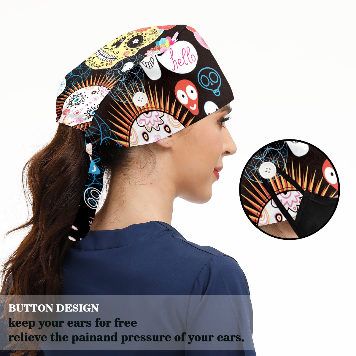 <p>Working cap with Sweatband and Button for Women Men</p><p>Material&nbsp;: 50% cotton+50% polyester</p><p>Size:&nbsp;One size fits most,&nbsp;suitable for both men and women.</p><p>Working Cap with Buttons Design:special&nbsp;design with buttons to protect ears for those who are wearing ma-sk. These new styles hats will allow you to put the straps around the buttons instead of your ears, make you feel more comfortable.</p><p>Sweat-absorbent towel cloth inside: Built-in&nbsp;100% cotton sweatband, keep the forehead clean after long time working.</p><p>Widely occasion: Widely used in beauty spa, house cleaning, cooking, sleeping, or for cos-play&nbsp;party.</p><p>Lovely pattern: lovely&nbsp;3D printed&nbsp;pattern,&nbsp;it's perfect for gift to you family&nbsp;and friends.</p>