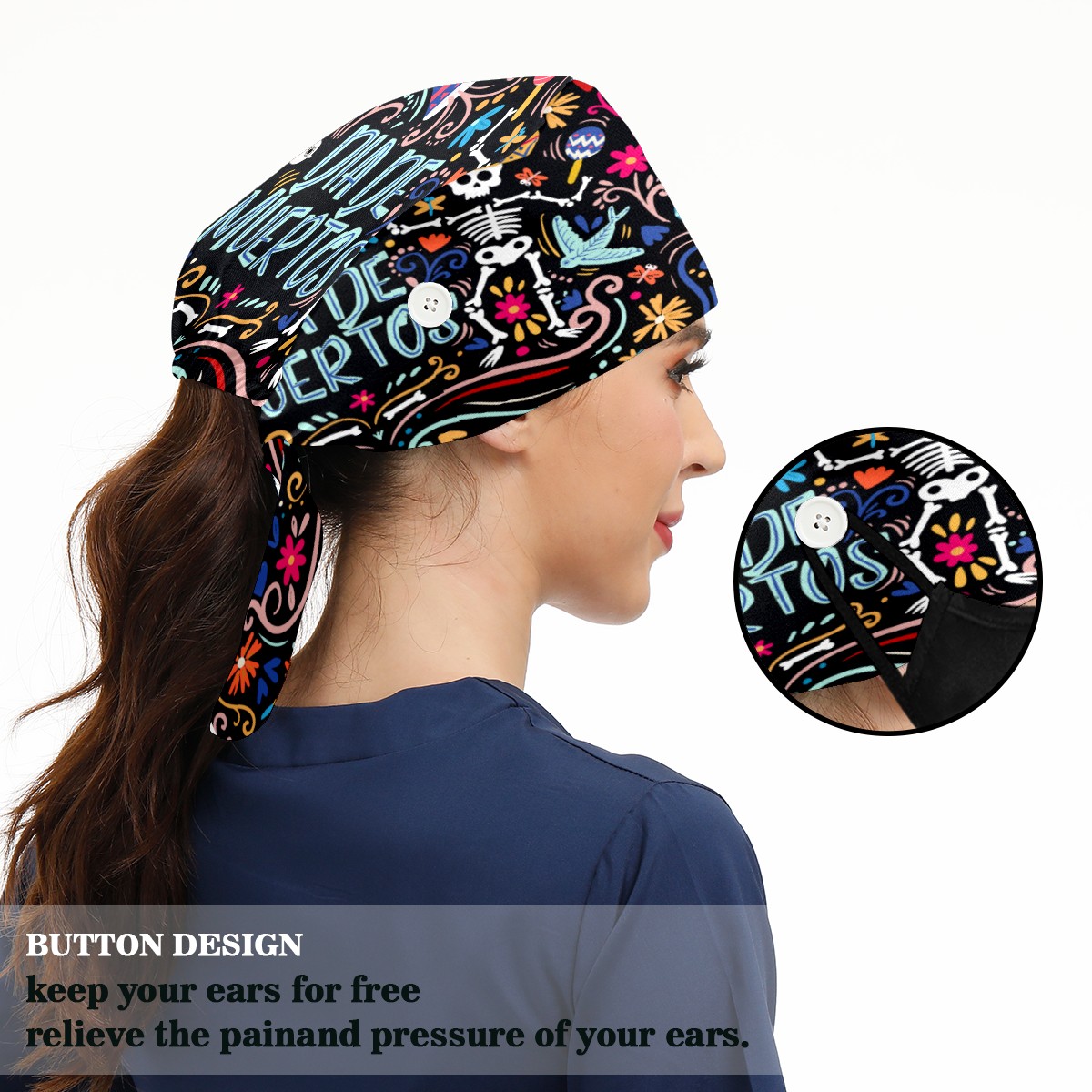 <p>Working cap with Sweatband and Button for Women Men</p><p>Material&nbsp;: 50% cotton+50% polyester</p><p>Size:&nbsp;One size fits most,&nbsp;suitable for both men and women.</p><p>Working Cap with Buttons Design:special&nbsp;design with buttons to protect ears for those who are wearing ma-sk. These new styles hats will allow you to put the straps around the buttons instead of your ears, make you feel more comfortable.</p><p>Sweat-absorbent towel cloth inside: Built-in&nbsp;100% cotton sweatband, keep the forehead clean after long time working.</p><p>Widely occasion: Widely used in beauty spa, house cleaning, cooking, sleeping, or for cos-play&nbsp;party.</p><p>Lovely pattern: lovely&nbsp;3D printed&nbsp;pattern,&nbsp;it's perfect for gift to you family&nbsp;and friends.</p>