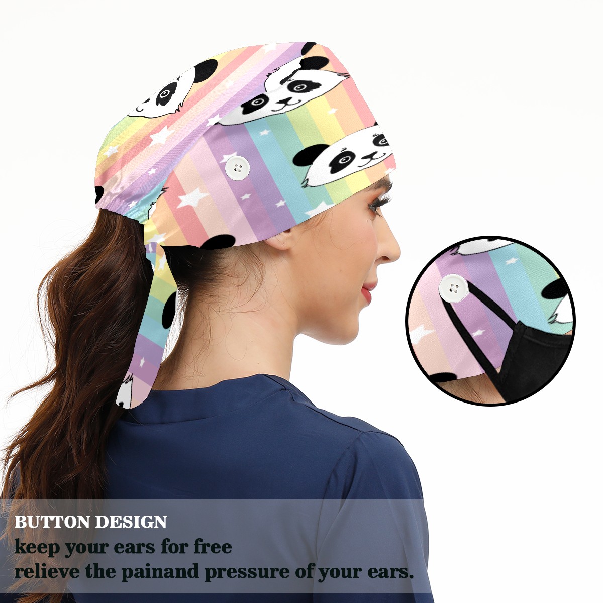<p>Working cap with Sweatband and Button for Women Men</p><p>Material&nbsp;: 50% cotton+50% polyester</p><p>Size:&nbsp;One size fits most,&nbsp;suitable for both men and women.</p><p>Working Cap with Buttons Design:special&nbsp;design with buttons to protect ears for those who are wearing ma-sk. These new styles hats will allow you to put the straps around the buttons instead of your ears, make you feel more comfortable.</p><p>Sweat-absorbent towel cloth inside: Built-in&nbsp;100% cotton sweatband, keep the forehead clean after long time working.</p><p>Widely occasion: Widely used in beauty spa, house cleaning, cooking, sleeping, or for cos-play&nbsp;party.</p><p>Lovely pattern: lovely&nbsp;3D printed&nbsp;pattern,&nbsp;it's perfect for gift to you family&nbsp;and friends.</p>