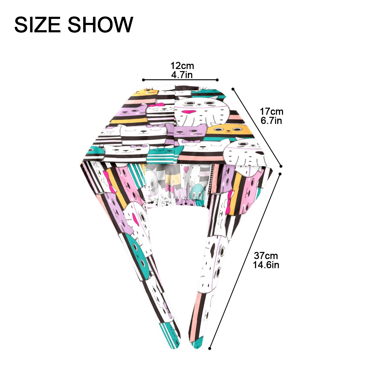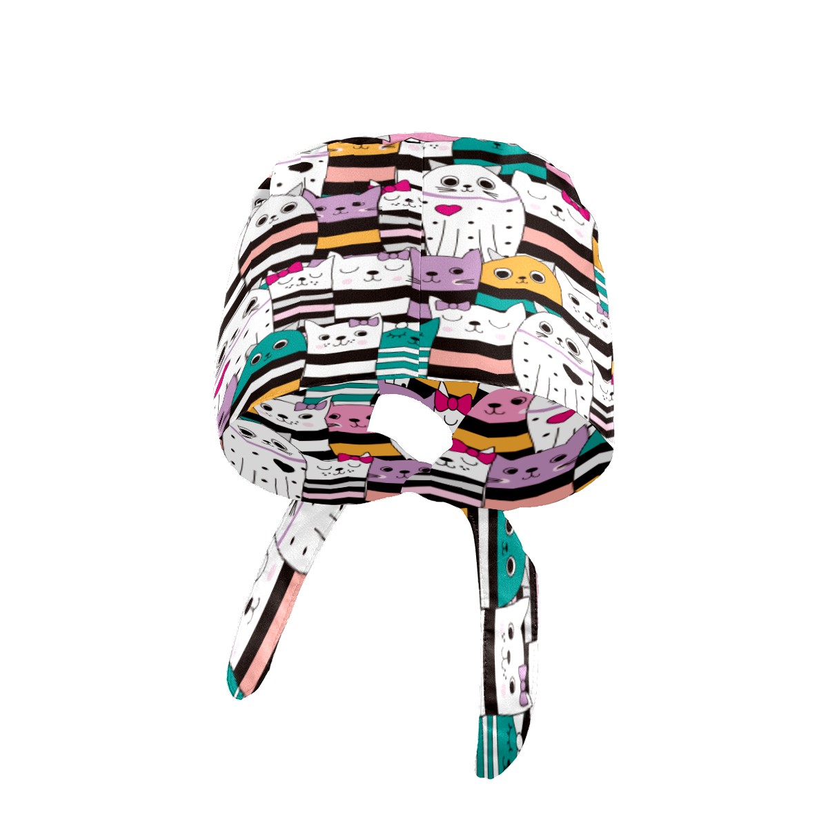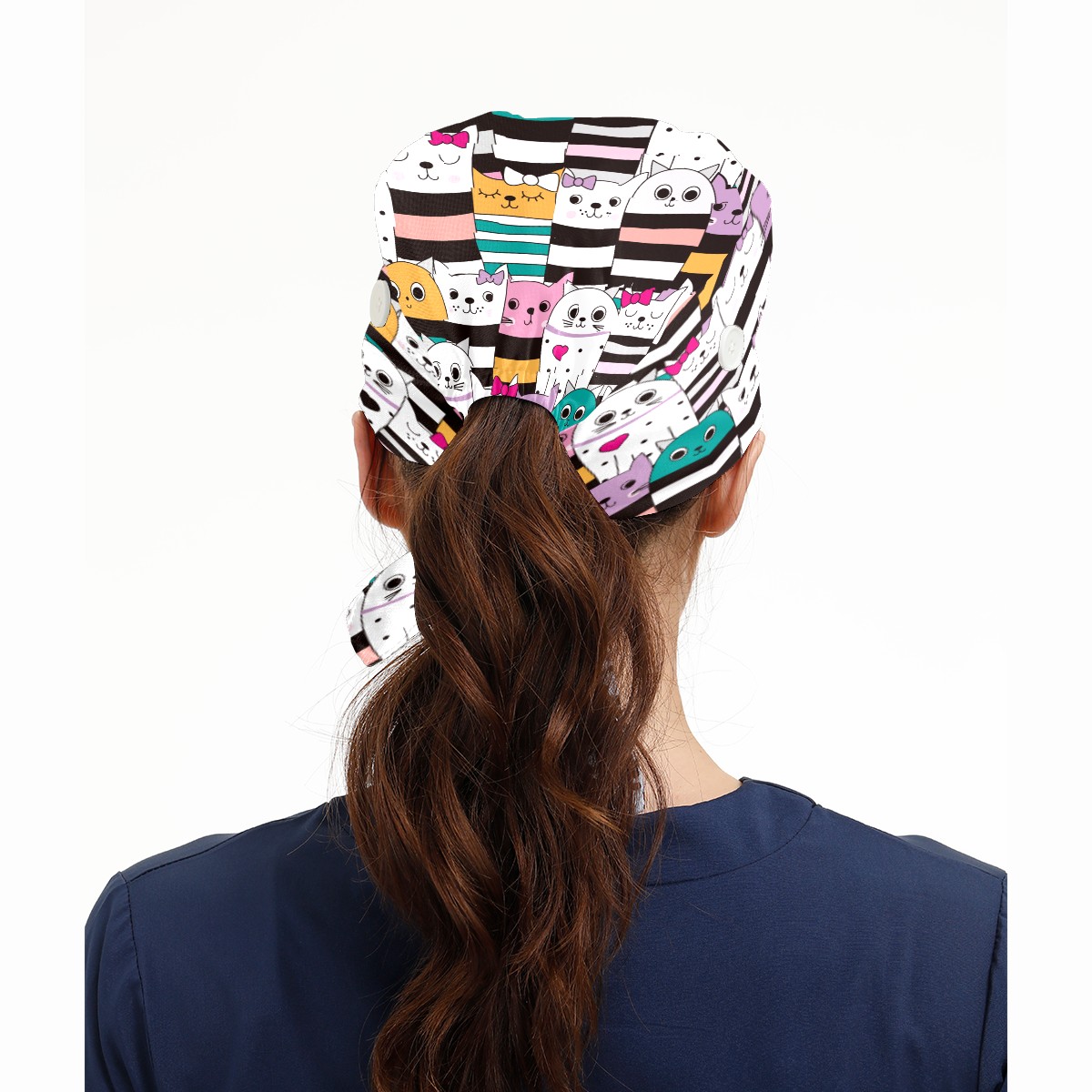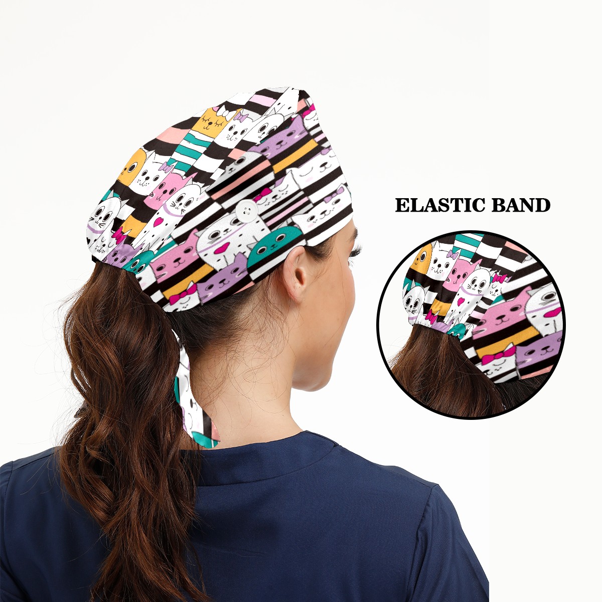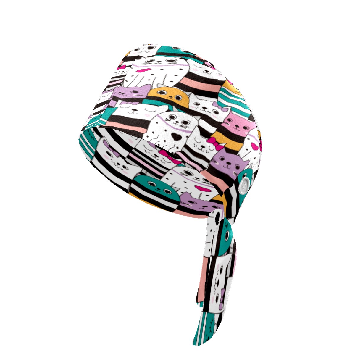 Colorful Hipster Cats Bow Heart Pattern Working Cap Button and Sweatband Adjustable Elastic Head Cover Hair Tie Back Work Hats for Women Men