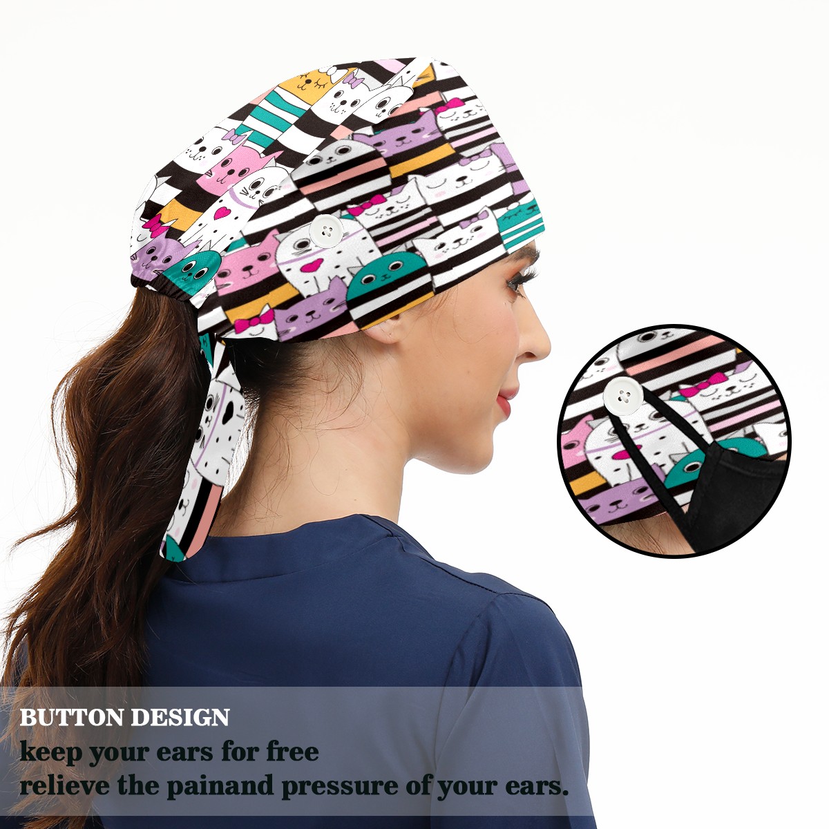 <p>Working cap with Sweatband and Button for Women Men</p><p>Material&nbsp;: 50% cotton+50% polyester</p><p>Size:&nbsp;One size fits most,&nbsp;suitable for both men and women.</p><p>Working Cap with Buttons Design:special&nbsp;design with buttons to protect ears for those who are wearing ma-sk. These new styles hats will allow you to put the straps around the buttons instead of your ears, make you feel more comfortable.</p><p>Sweat-absorbent towel cloth inside: Built-in&nbsp;100% cotton sweatband, keep the forehead clean after long time working.</p><p>Widely occasion: Widely used in beauty spa, house cleaning, cooking, sleeping, or for cos-play&nbsp;party.</p><p>Lovely pattern: lovely&nbsp;3D printed&nbsp;pattern,&nbsp;it's perfect for gift to you family&nbsp;and friends.</p>