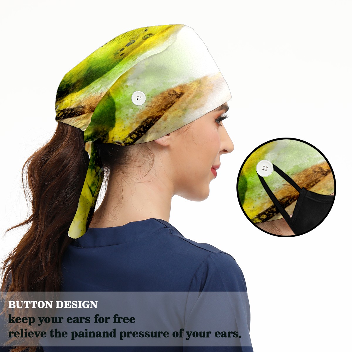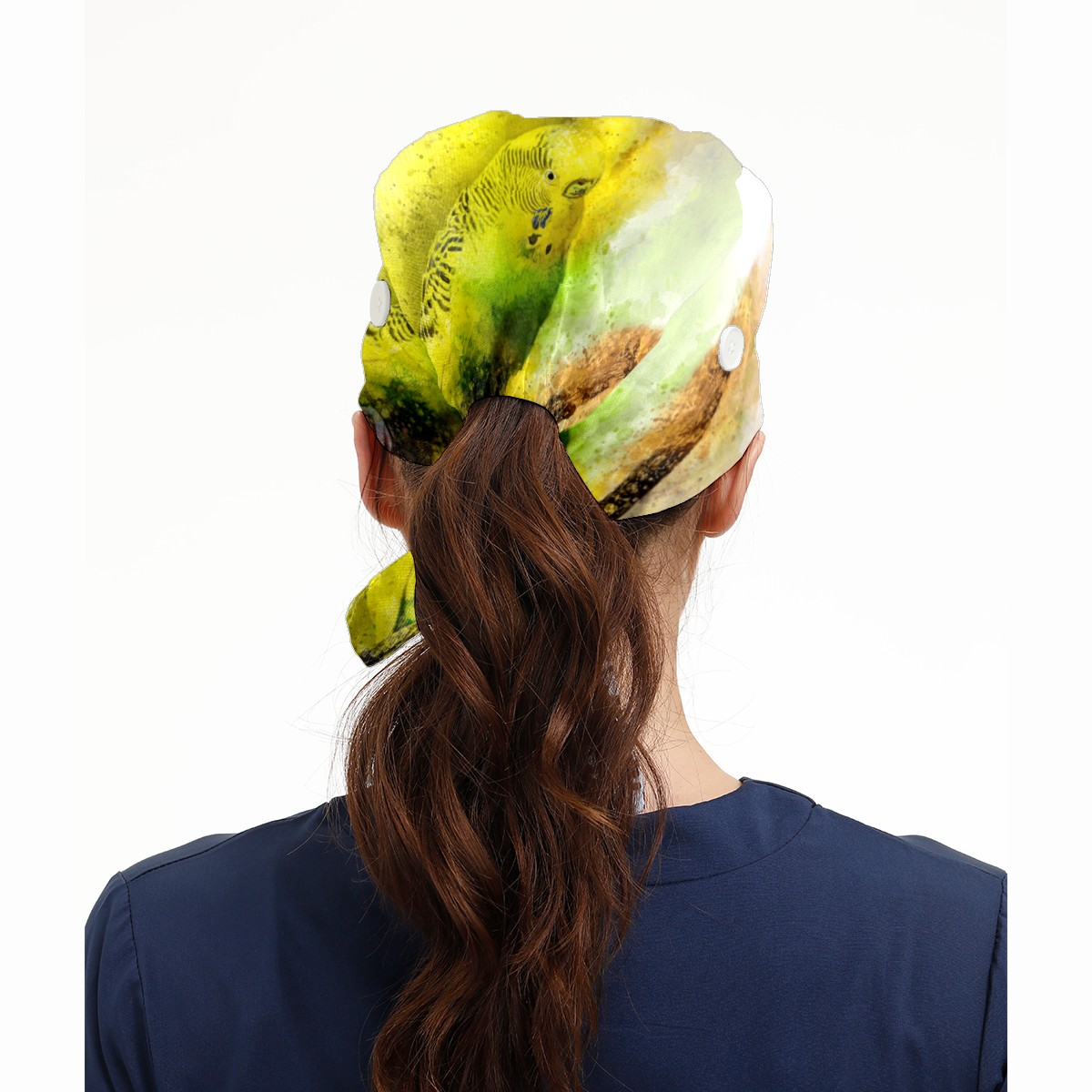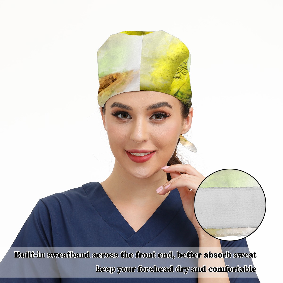 Yellow Watercolor Budgie Parrot Working Cap Button and Sweatband Adjustable Elastic Head Cover Hair Tie Back Work Hats for Women Men