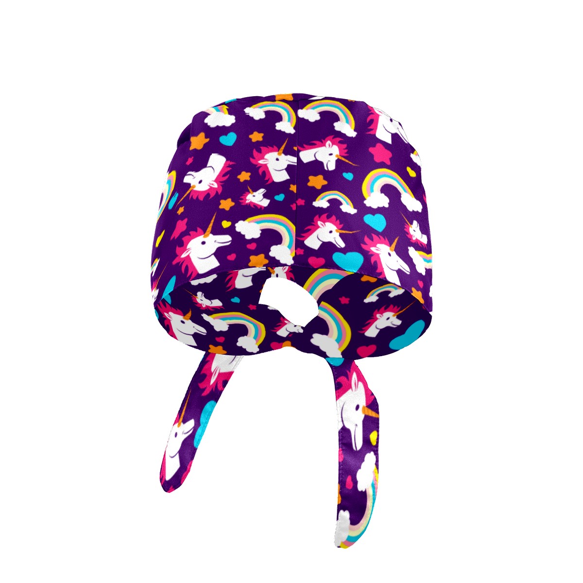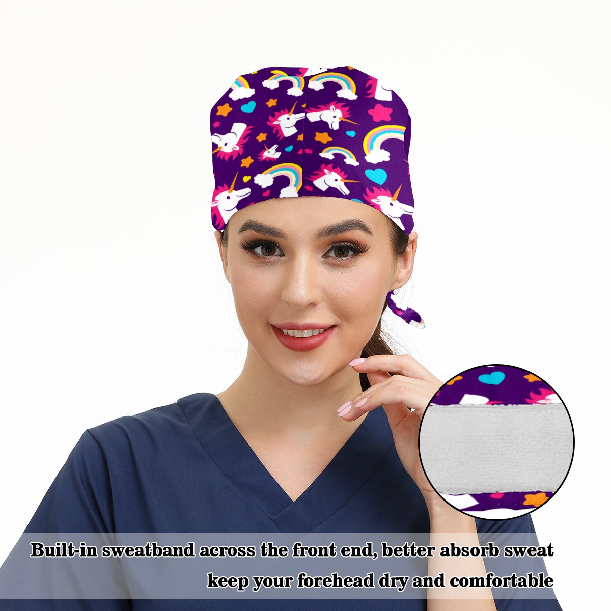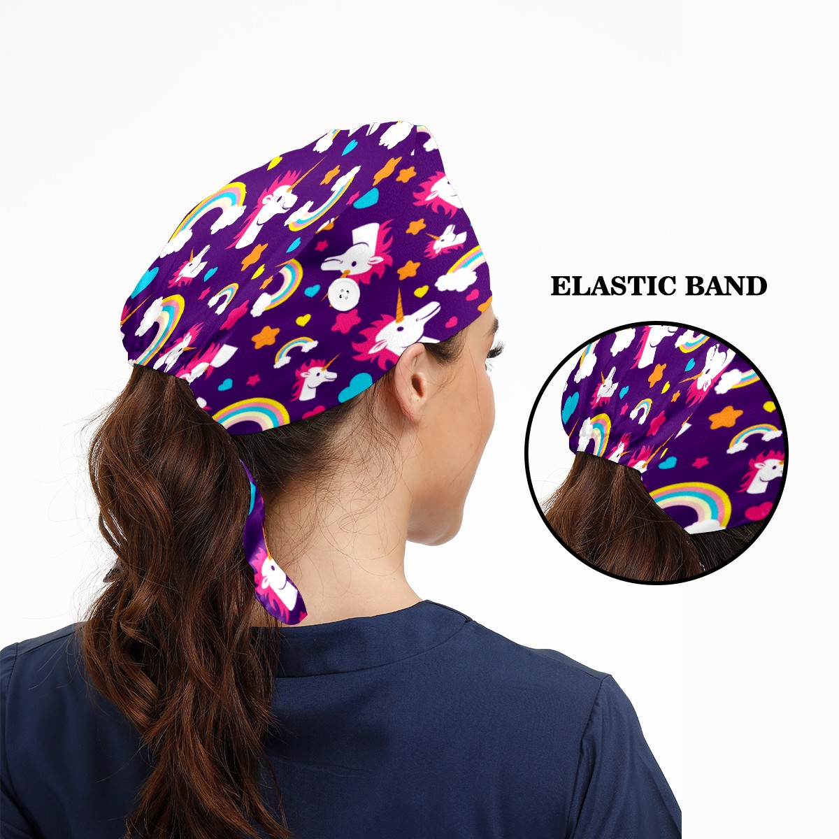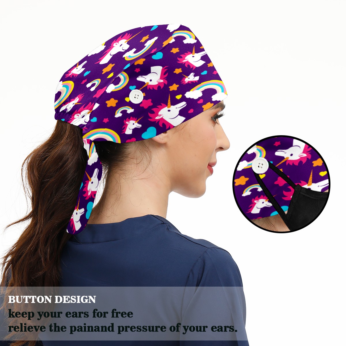 Colorful Cartoon Unicorn Rainbow Heart Stars Pattern Working Cap Button and Sweatband Adjustable Elastic Head Cover Hair Tie Back Work Hats for Women Men