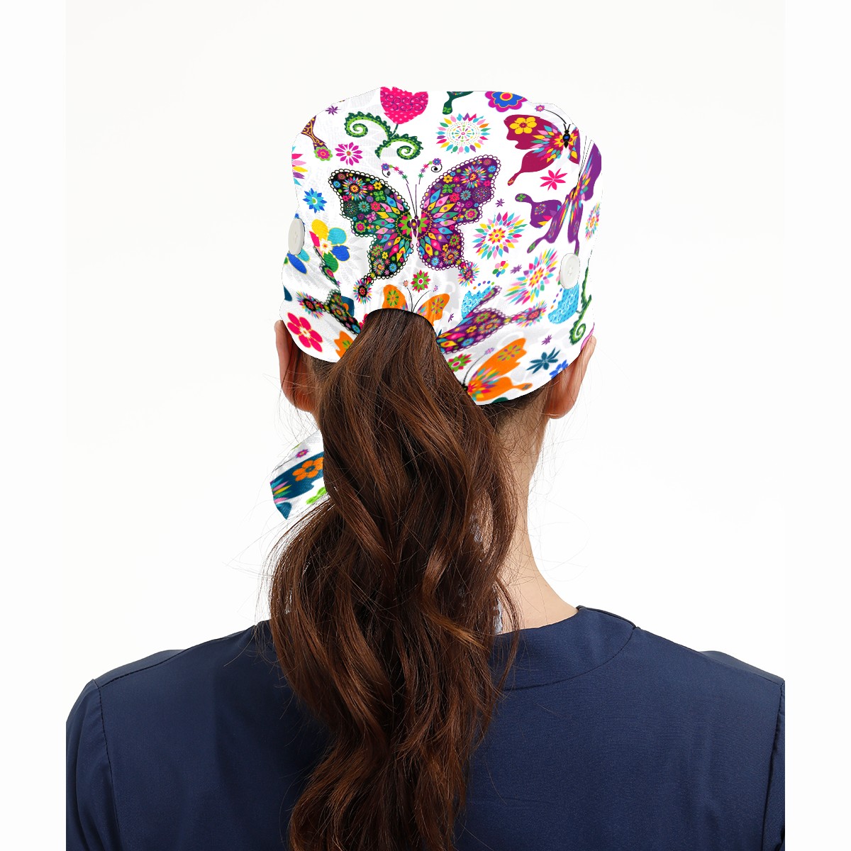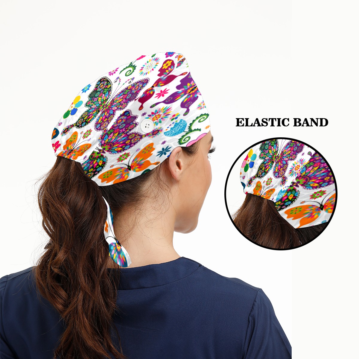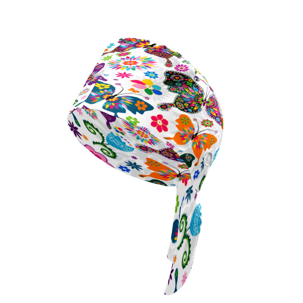 Colorful Butterfly Flower Pattern Working Cap Button and Sweatband Adjustable Elastic Head Cover Hair Tie Back Work Hats for Women Men