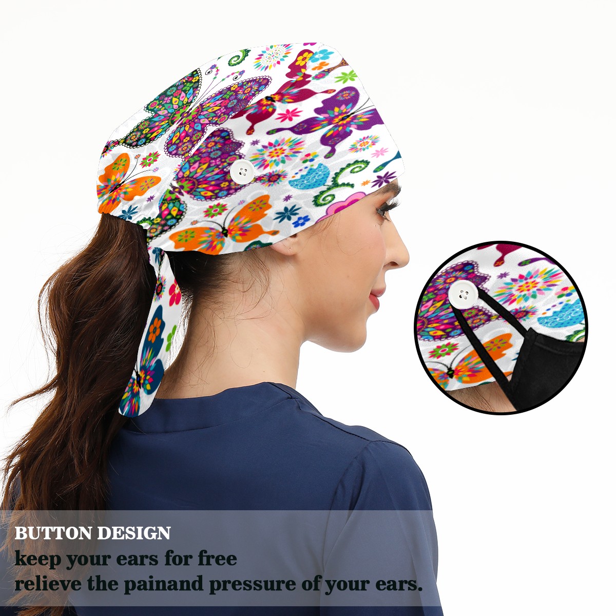 <p>Working cap with Sweatband and Button for Women Men</p><p>Material&nbsp;: 50% cotton+50% polyester</p><p>Size:&nbsp;One size fits most,&nbsp;suitable for both men and women.</p><p>Working Cap with Buttons Design:special&nbsp;design with buttons to protect ears for those who are wearing ma-sk. These new styles hats will allow you to put the straps around the buttons instead of your ears, make you feel more comfortable.</p><p>Sweat-absorbent towel cloth inside: Built-in&nbsp;100% cotton sweatband, keep the forehead clean after long time working.</p><p>Widely occasion: Widely used in beauty spa, house cleaning, cooking, sleeping, or for cos-play&nbsp;party.</p><p>Lovely pattern: lovely&nbsp;3D printed&nbsp;pattern,&nbsp;it's perfect for gift to you family&nbsp;and friends.</p>
