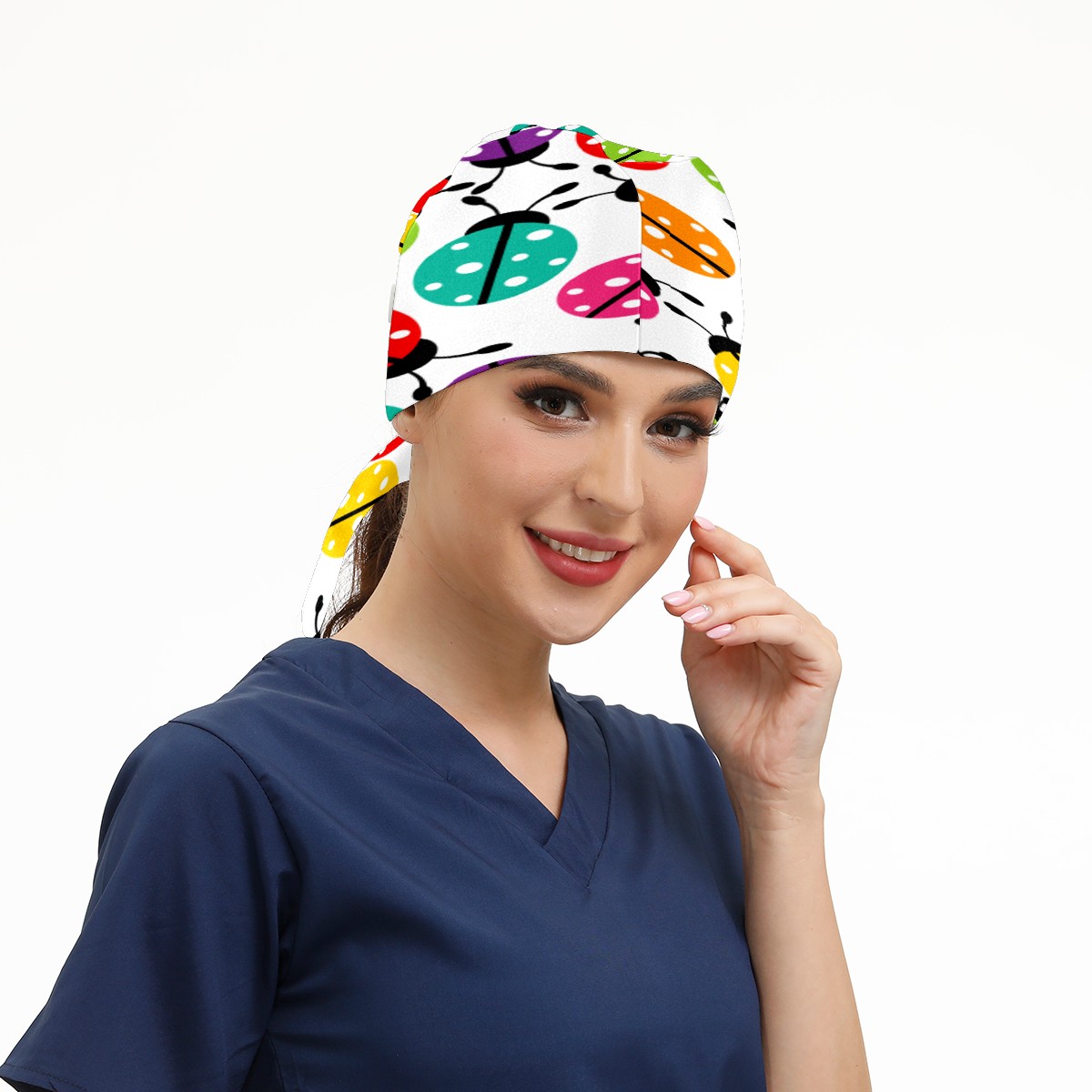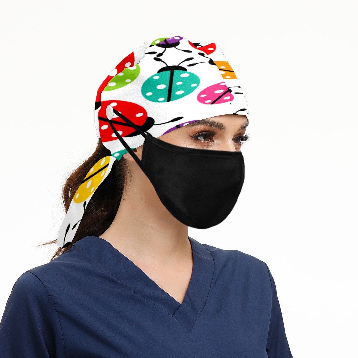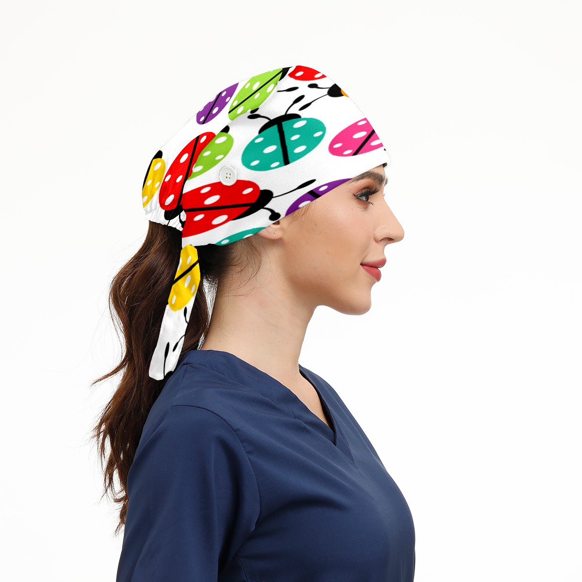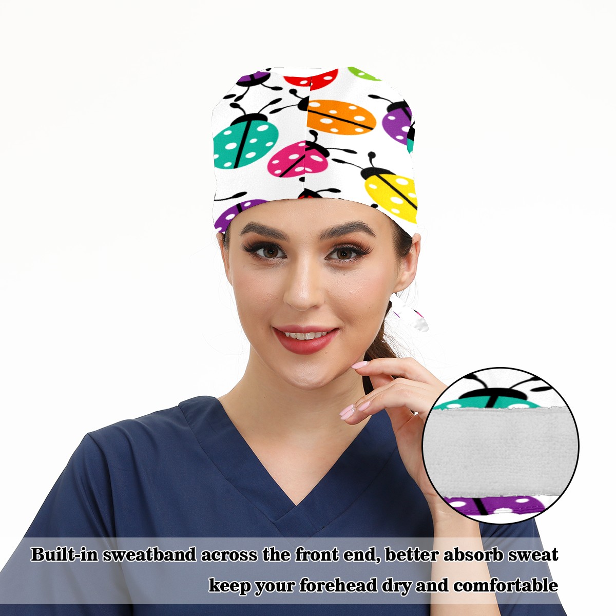 Colorful Cartoon Insect Ladybirds Pattern Working Cap Button and Sweatband Adjustable Elastic Head Cover Hair Tie Back Work Hats for Women Men