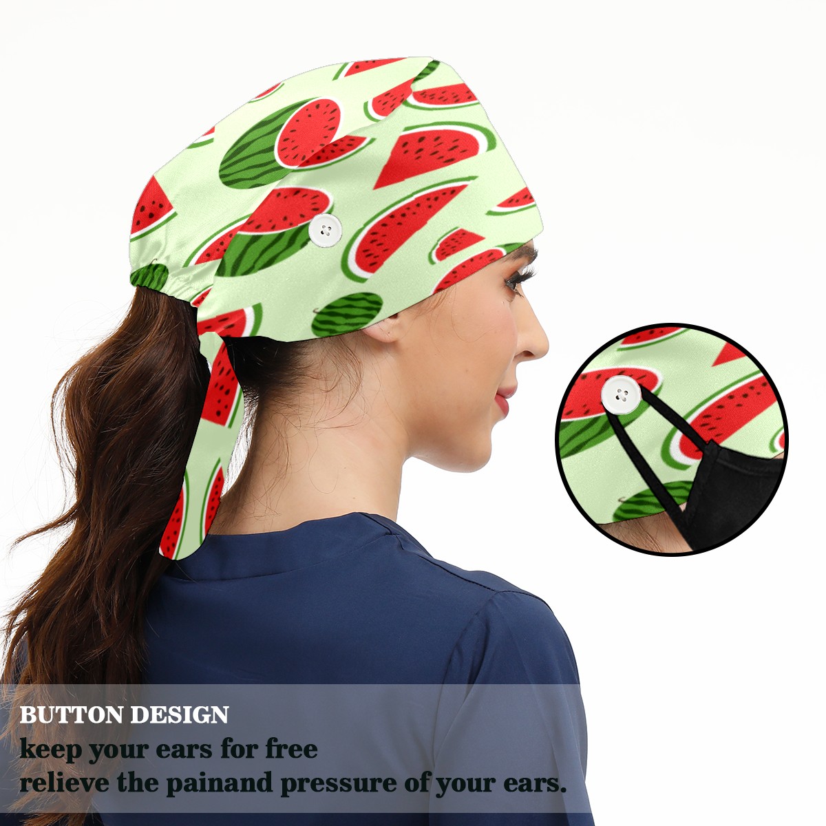 <p>Working cap with Sweatband and Button for Women Men</p><p>Material&nbsp;: 50% cotton+50% polyester</p><p>Size:&nbsp;One size fits most,&nbsp;suitable for both men and women.</p><p>Working Cap with Buttons Design:special&nbsp;design with buttons to protect ears for those who are wearing ma-sk. These new styles hats will allow you to put the straps around the buttons instead of your ears, make you feel more comfortable.</p><p>Sweat-absorbent towel cloth inside: Built-in&nbsp;100% cotton sweatband, keep the forehead clean after long time working.</p><p>Widely occasion: Widely used in beauty spa, house cleaning, cooking, sleeping, or for cos-play&nbsp;party.</p><p>Lovely pattern: lovely&nbsp;3D printed&nbsp;pattern,&nbsp;it's perfect for gift to you family&nbsp;and friends.</p>