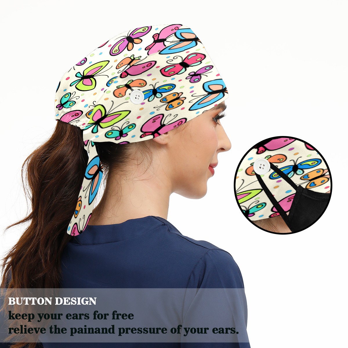 <p>Working cap with Sweatband and Button for Women Men</p><p>Material&nbsp;: 50% cotton+50% polyester</p><p>Size:&nbsp;One size fits most,&nbsp;suitable for both men and women.</p><p>Working Cap with Buttons Design:special&nbsp;design with buttons to protect ears for those who are wearing ma-sk. These new styles hats will allow you to put the straps around the buttons instead of your ears, make you feel more comfortable.</p><p>Sweat-absorbent towel cloth inside: Built-in&nbsp;100% cotton sweatband, keep the forehead clean after long time working.</p><p>Widely occasion: Widely used in beauty spa, house cleaning, cooking, sleeping, or for cos-play&nbsp;party.</p><p>Lovely pattern: lovely&nbsp;3D printed&nbsp;pattern,&nbsp;it's perfect for gift to you family&nbsp;and friends.</p>