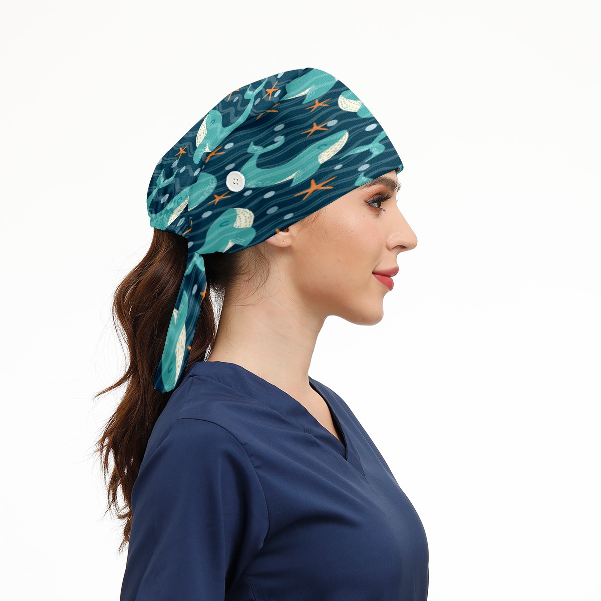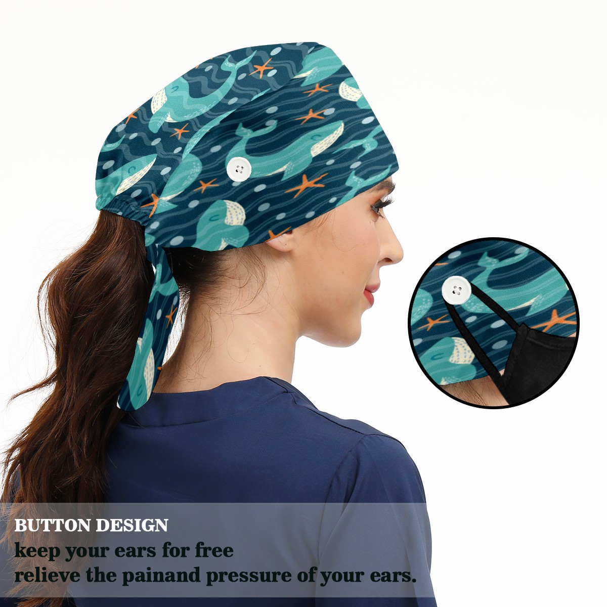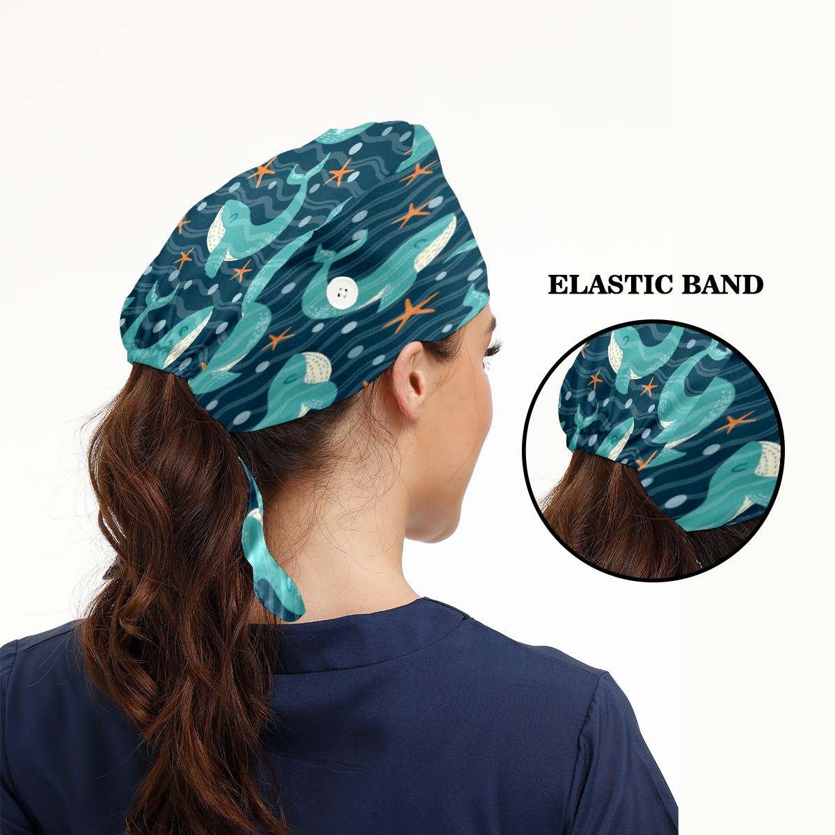 Cartoon Ocean Dolphins Starfish Pattern Working Cap Button and Sweatband Adjustable Elastic Head Cover Hair Tie Back Work Hats for Women Men