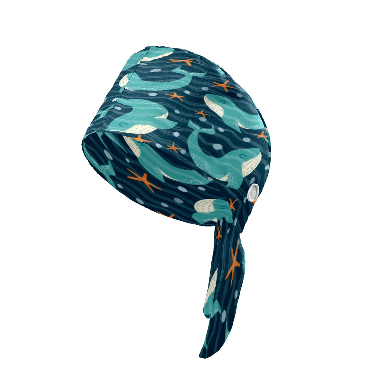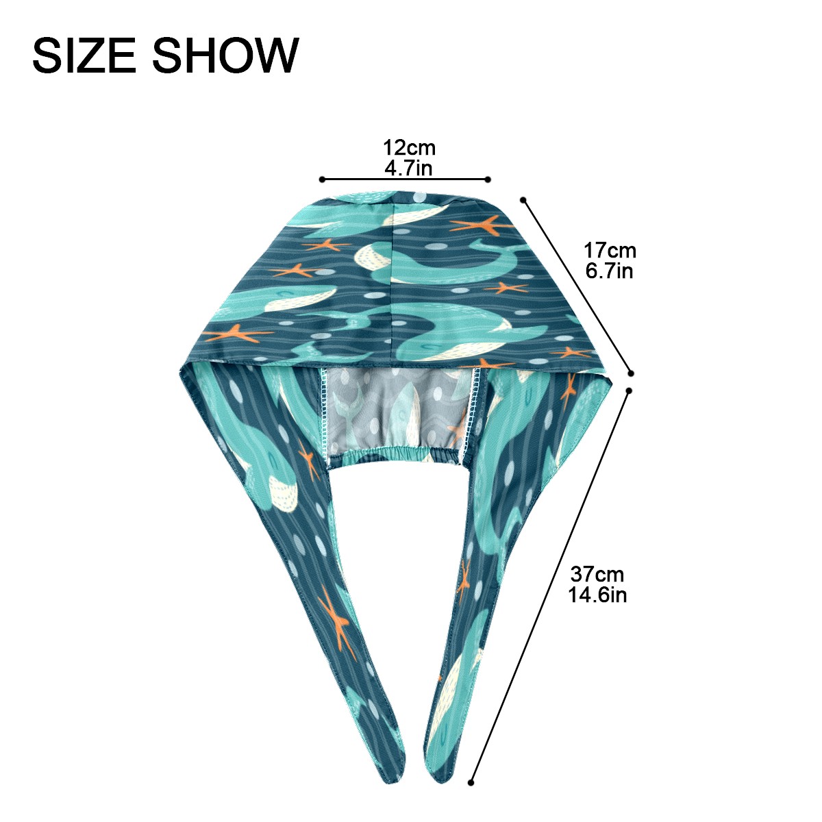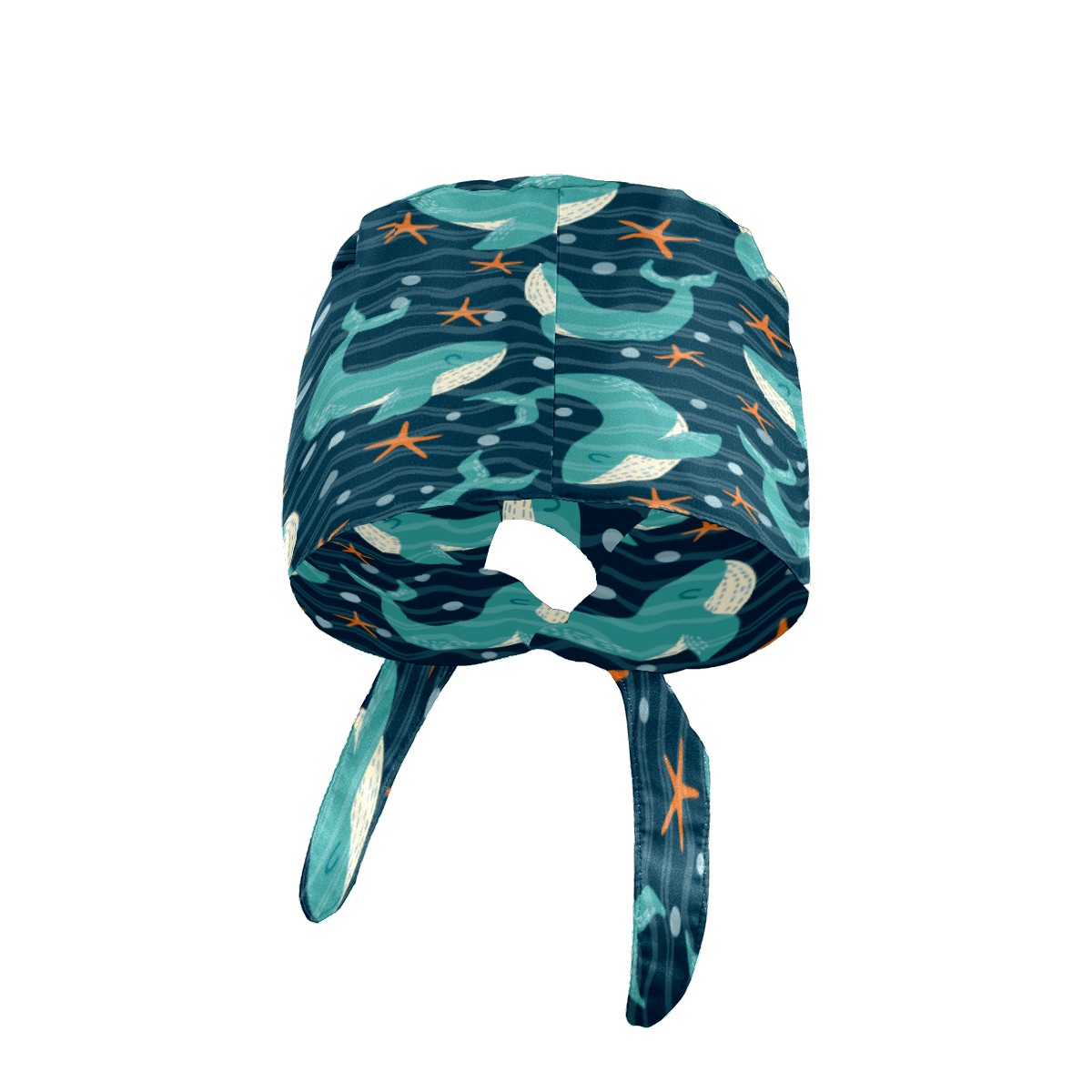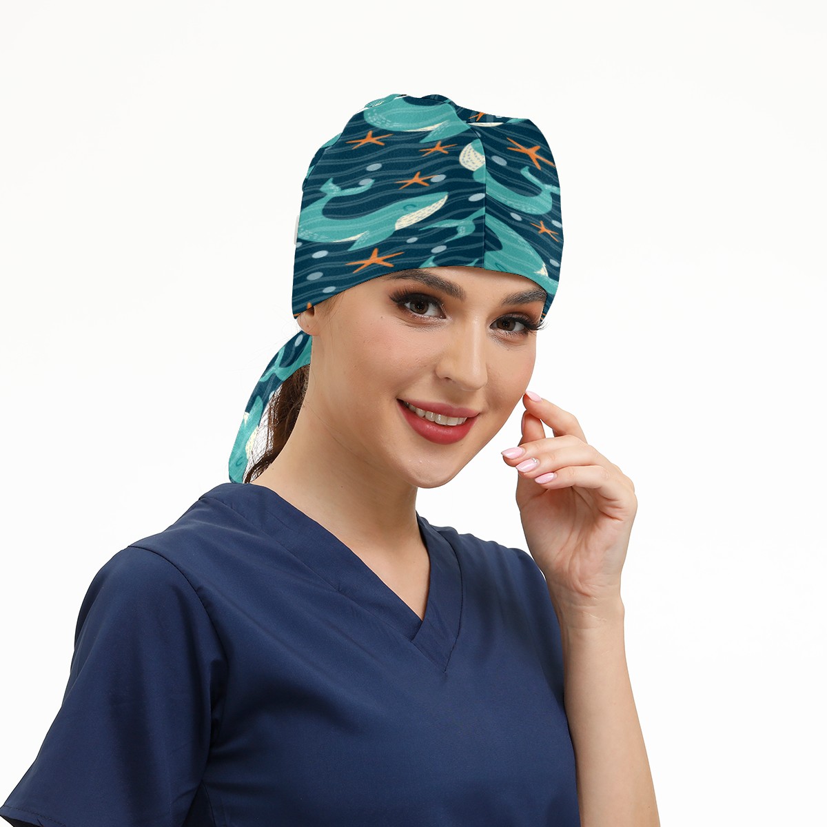 Cartoon Ocean Dolphins Starfish Pattern Working Cap Button and Sweatband Adjustable Elastic Head Cover Hair Tie Back Work Hats for Women Men