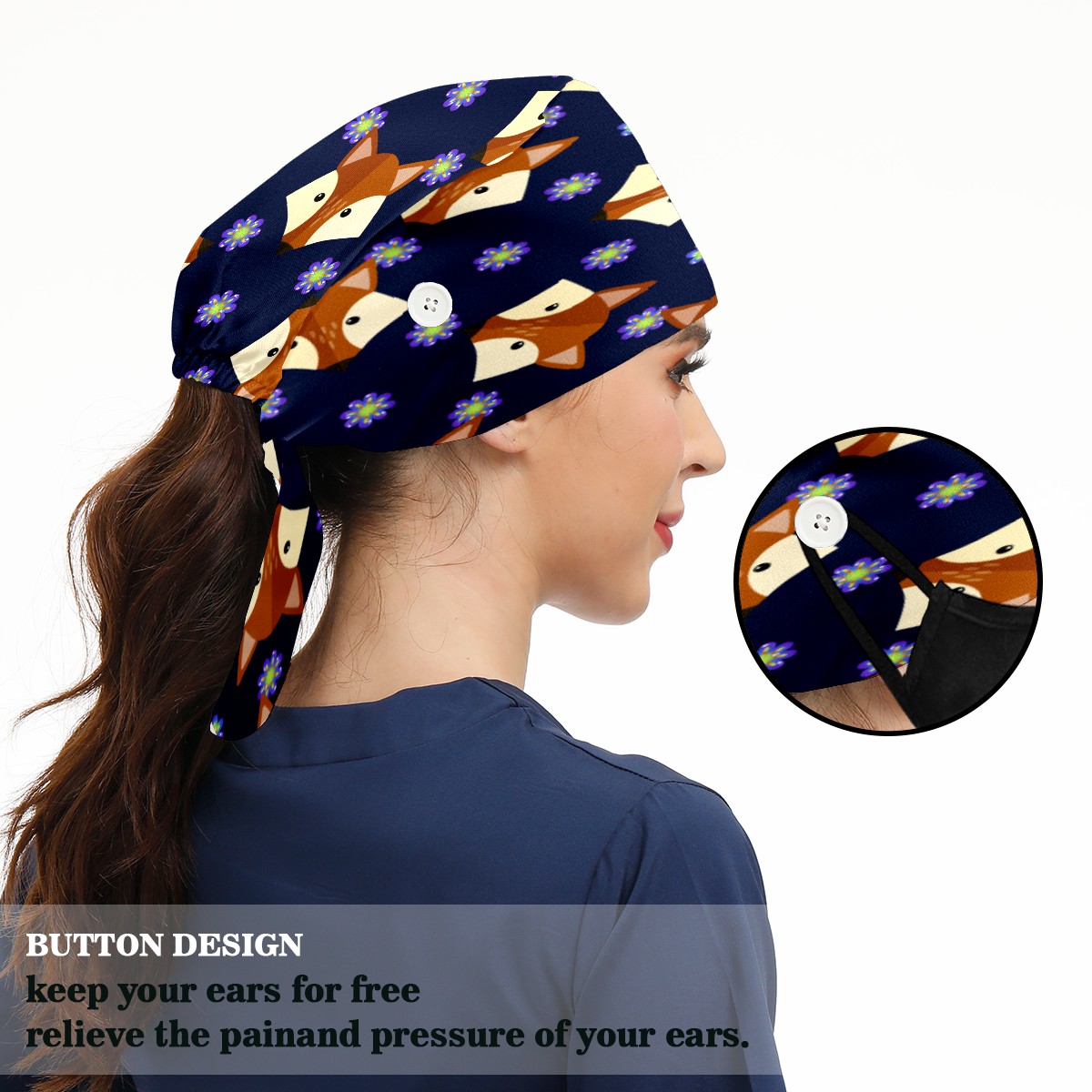 <p>Working cap with Sweatband and Button for Women Men</p><p>Material&nbsp;: 50% cotton+50% polyester</p><p>Size:&nbsp;One size fits most,&nbsp;suitable for both men and women.</p><p>Working Cap with Buttons Design:special&nbsp;design with buttons to protect ears for those who are wearing ma-sk. These new styles hats will allow you to put the straps around the buttons instead of your ears, make you feel more comfortable.</p><p>Sweat-absorbent towel cloth inside: Built-in&nbsp;100% cotton sweatband, keep the forehead clean after long time working.</p><p>Widely occasion: Widely used in beauty spa, house cleaning, cooking, sleeping, or for cos-play&nbsp;party.</p><p>Lovely pattern: lovely&nbsp;3D printed&nbsp;pattern,&nbsp;it's perfect for gift to you family&nbsp;and friends.</p>