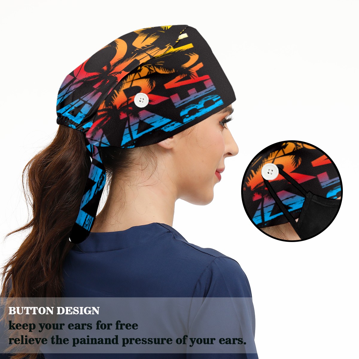 <p>Working cap with Sweatband and Button for Women Men</p><p>Material&nbsp;: 50% cotton+50% polyester</p><p>Size:&nbsp;One size fits most,&nbsp;suitable for both men and women.</p><p>Working Cap with Buttons Design:special&nbsp;design with buttons to protect ears for those who are wearing ma-sk. These new styles hats will allow you to put the straps around the buttons instead of your ears, make you feel more comfortable.</p><p>Sweat-absorbent towel cloth inside: Built-in&nbsp;100% cotton sweatband, keep the forehead clean after long time working.</p><p>Widely occasion: Widely used in beauty spa, house cleaning, cooking, sleeping, or for cos-play&nbsp;party.</p><p>Lovely pattern: lovely&nbsp;3D printed&nbsp;pattern,&nbsp;it's perfect for gift to you family&nbsp;and friends.</p>