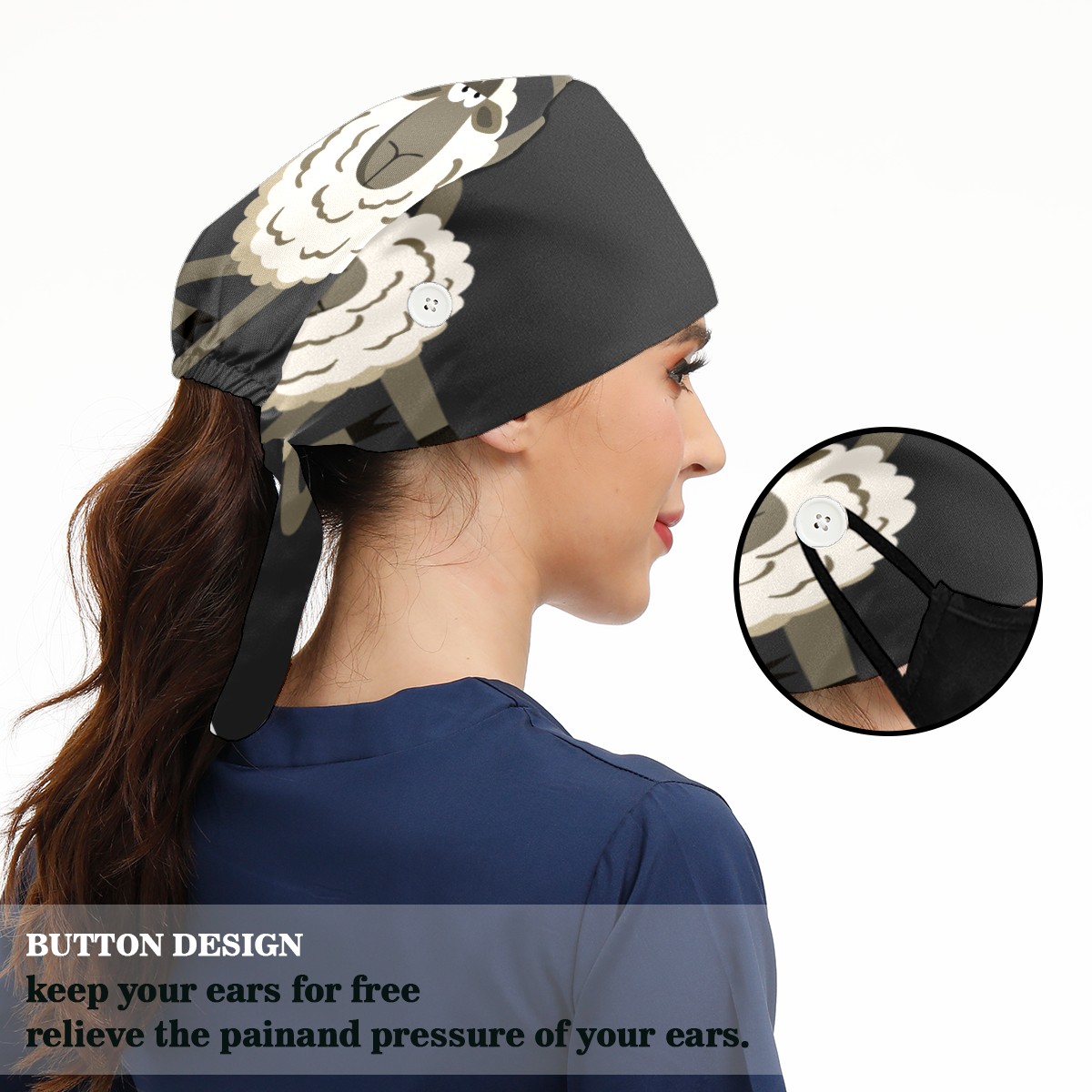 <p>Working cap with Sweatband and Button for Women Men</p><p>Material&nbsp;: 50% cotton+50% polyester</p><p>Size:&nbsp;One size fits most,&nbsp;suitable for both men and women.</p><p>Working Cap with Buttons Design:special&nbsp;design with buttons to protect ears for those who are wearing ma-sk. These new styles hats will allow you to put the straps around the buttons instead of your ears, make you feel more comfortable.</p><p>Sweat-absorbent towel cloth inside: Built-in&nbsp;100% cotton sweatband, keep the forehead clean after long time working.</p><p>Widely occasion: Widely used in beauty spa, house cleaning, cooking, sleeping, or for cos-play&nbsp;party.</p><p>Lovely pattern: lovely&nbsp;3D printed&nbsp;pattern,&nbsp;it's perfect for gift to you family&nbsp;and friends.</p>