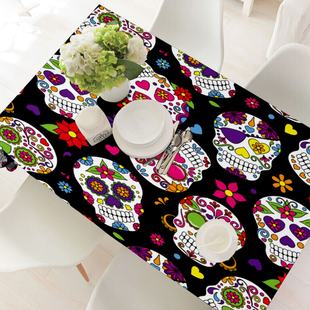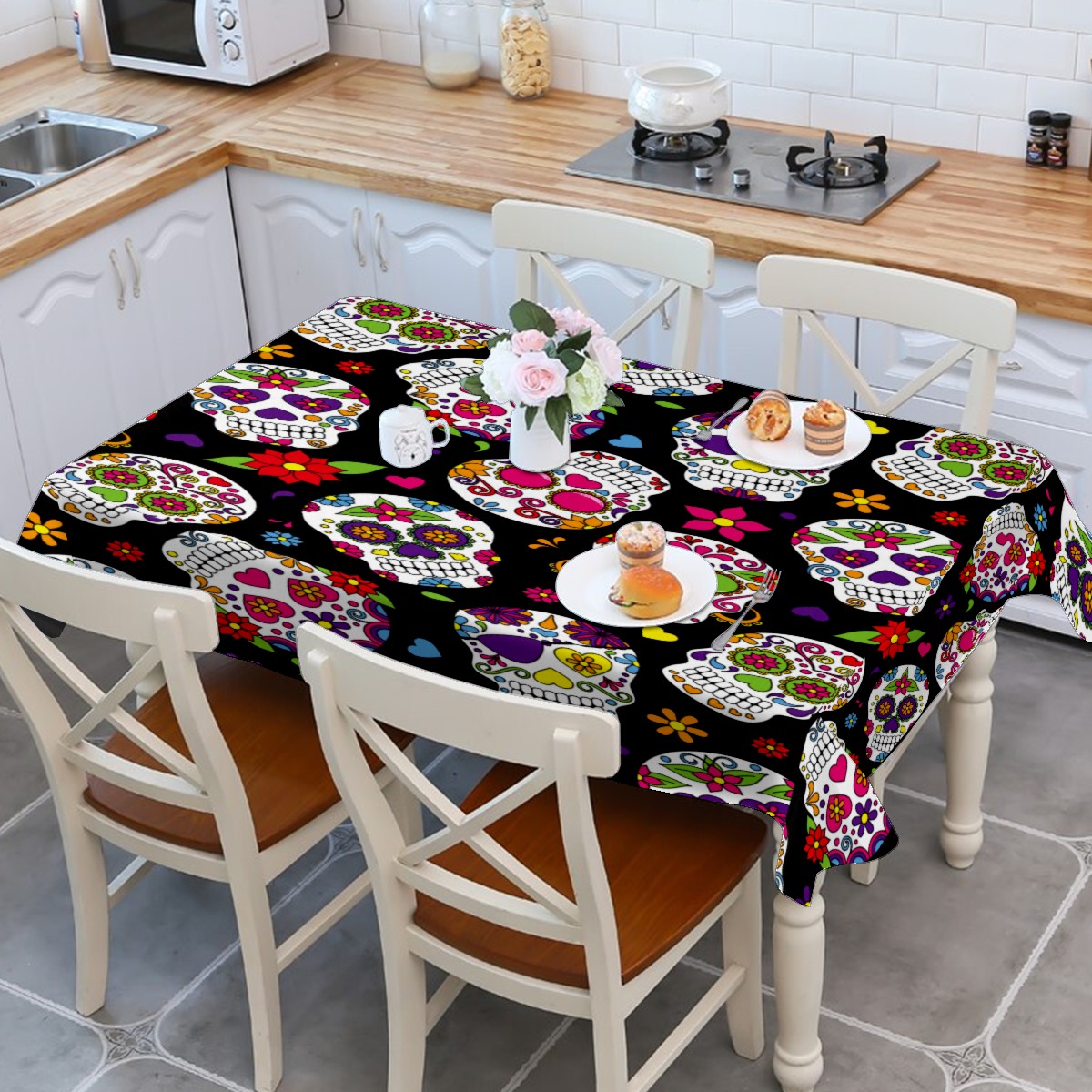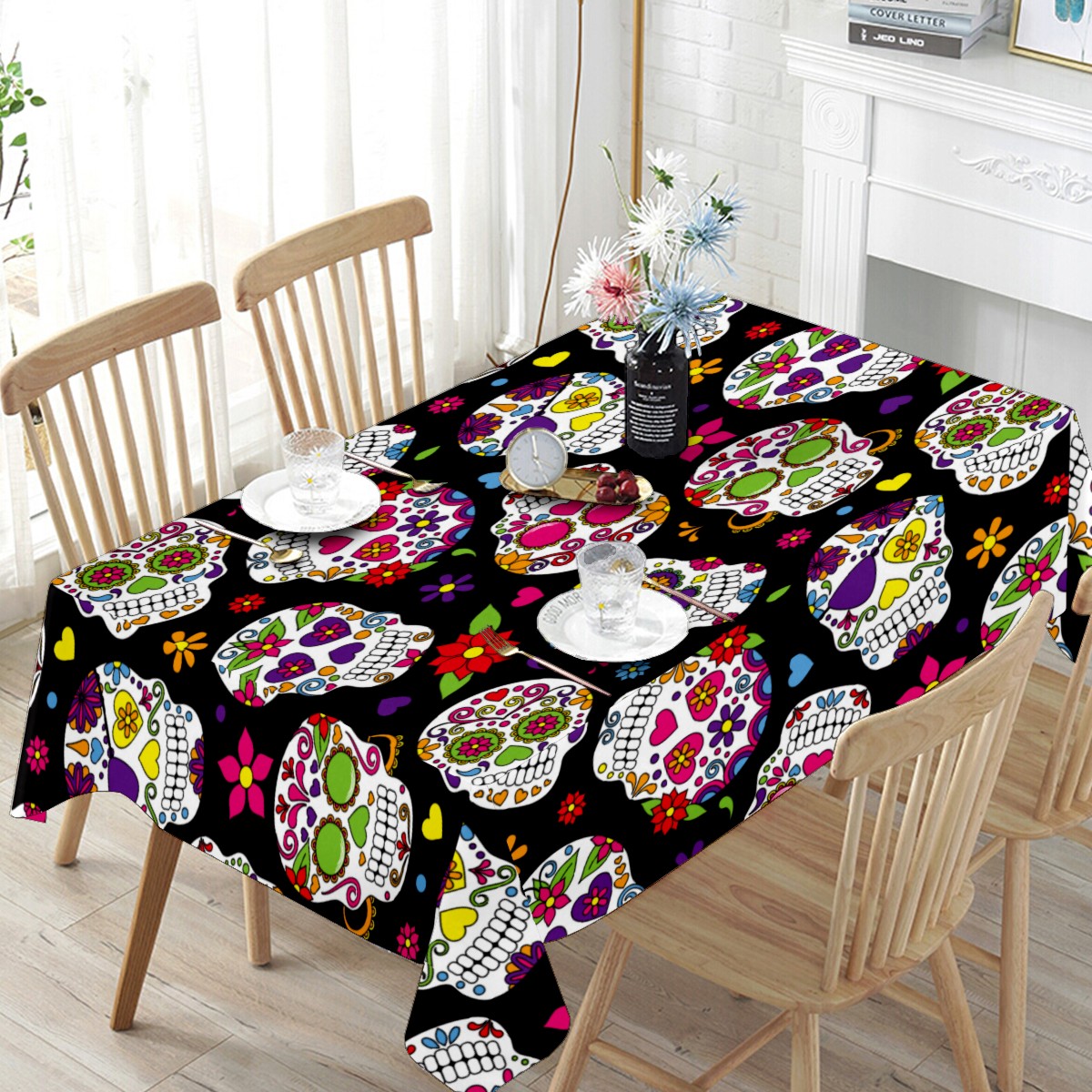 Rectangle Tablecloth Mexico Sugar Skull Floral Table Cloth 54x54in Table Cover for Kitchen Dining Table Party Home Decoration Washable Table Runner