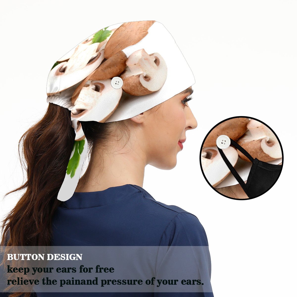 <p>Working cap with Sweatband and Button for Women Men</p><p>Material&nbsp;: 50% cotton+50% polyester</p><p>Size:&nbsp;One size fits most,&nbsp;suitable for both men and women.</p><p>Working Cap with Buttons Design:special&nbsp;design with buttons to protect ears for those who are wearing ma-sk. These new styles hats will allow you to put the straps around the buttons instead of your ears, make you feel more comfortable.</p><p>Sweat-absorbent towel cloth inside: Built-in&nbsp;100% cotton sweatband, keep the forehead clean after long time working.</p><p>Widely occasion: Widely used in beauty spa, house cleaning, cooking, sleeping, or for cos-play&nbsp;party.</p><p>Lovely pattern: lovely&nbsp;3D printed&nbsp;pattern,&nbsp;it's perfect for gift to you family&nbsp;and friends.</p>
