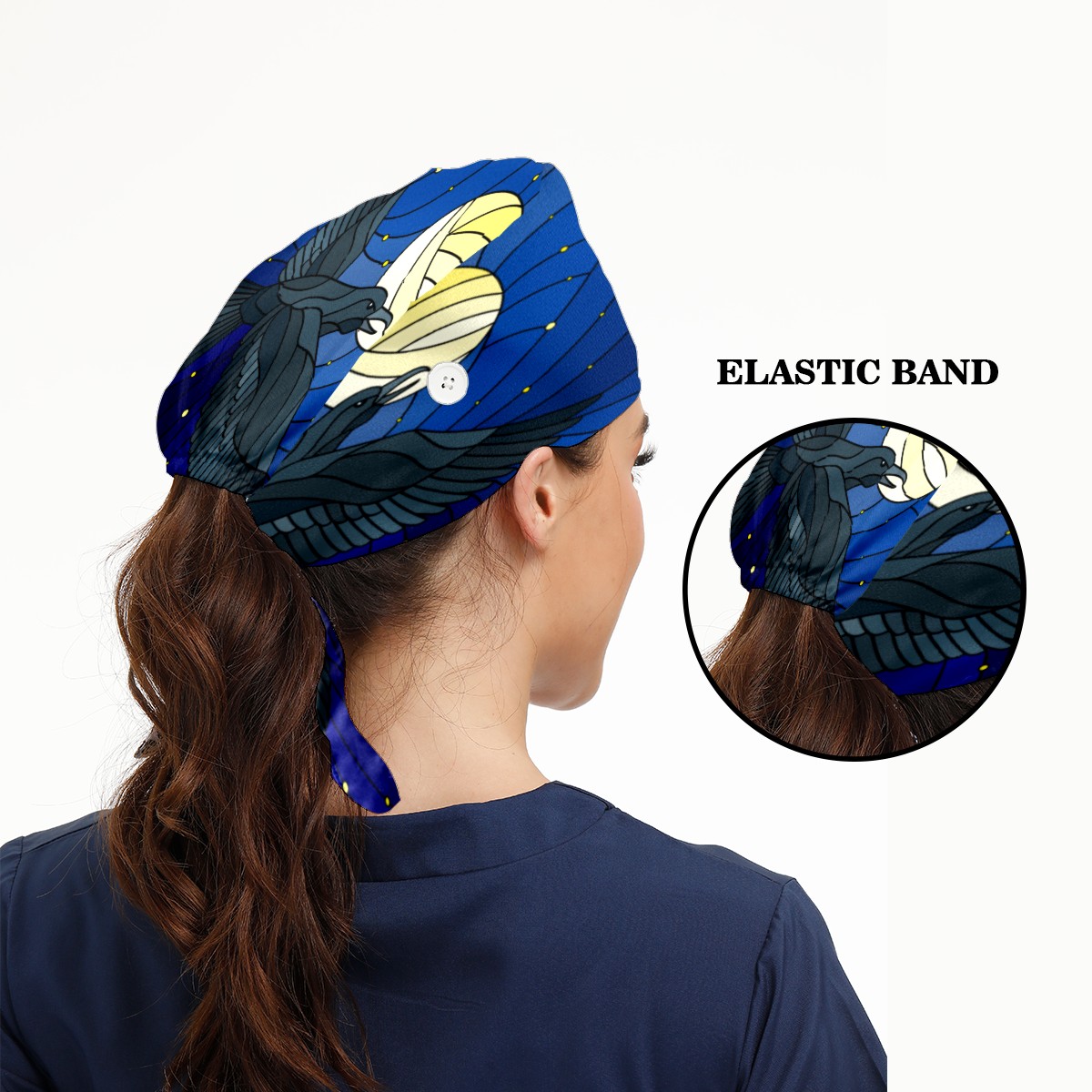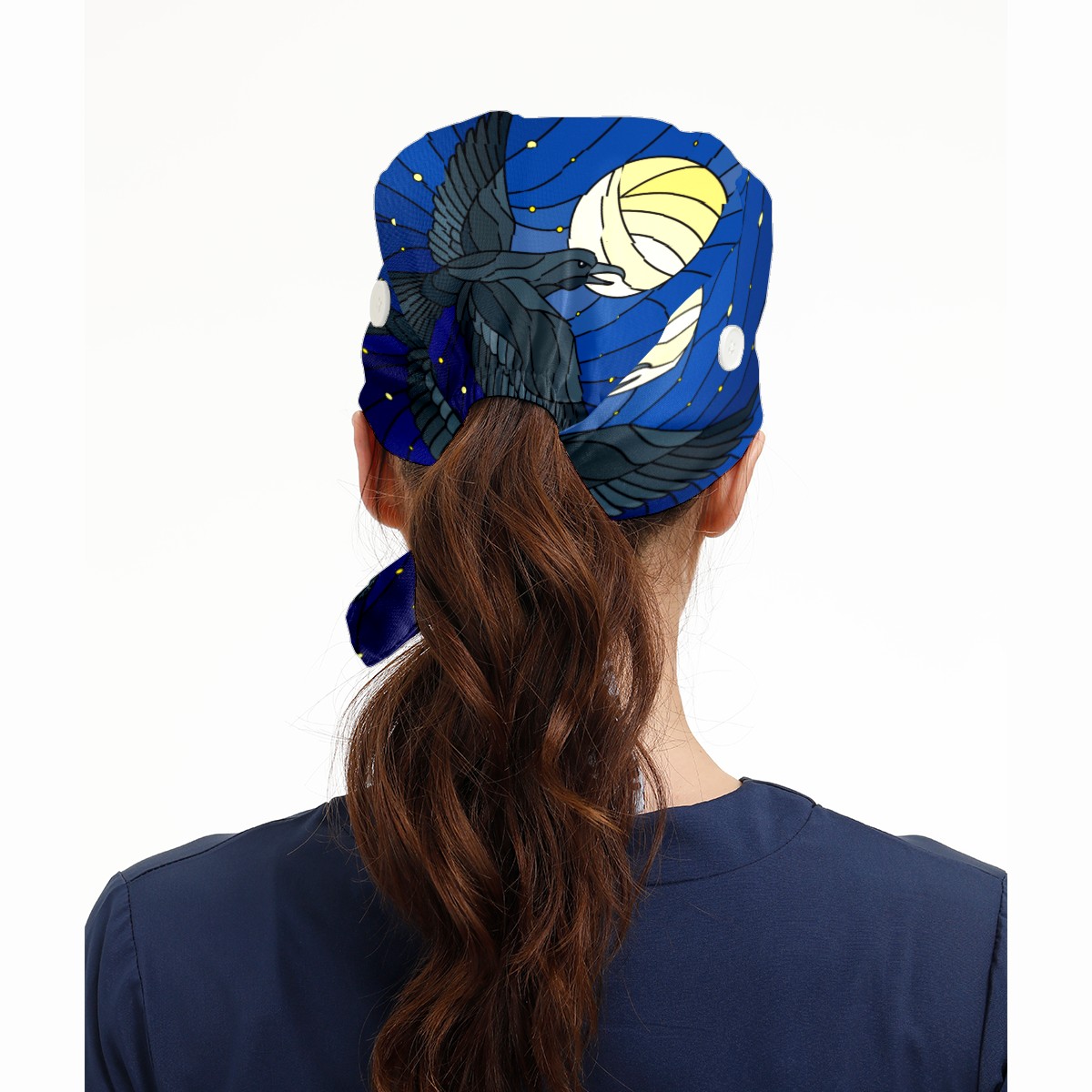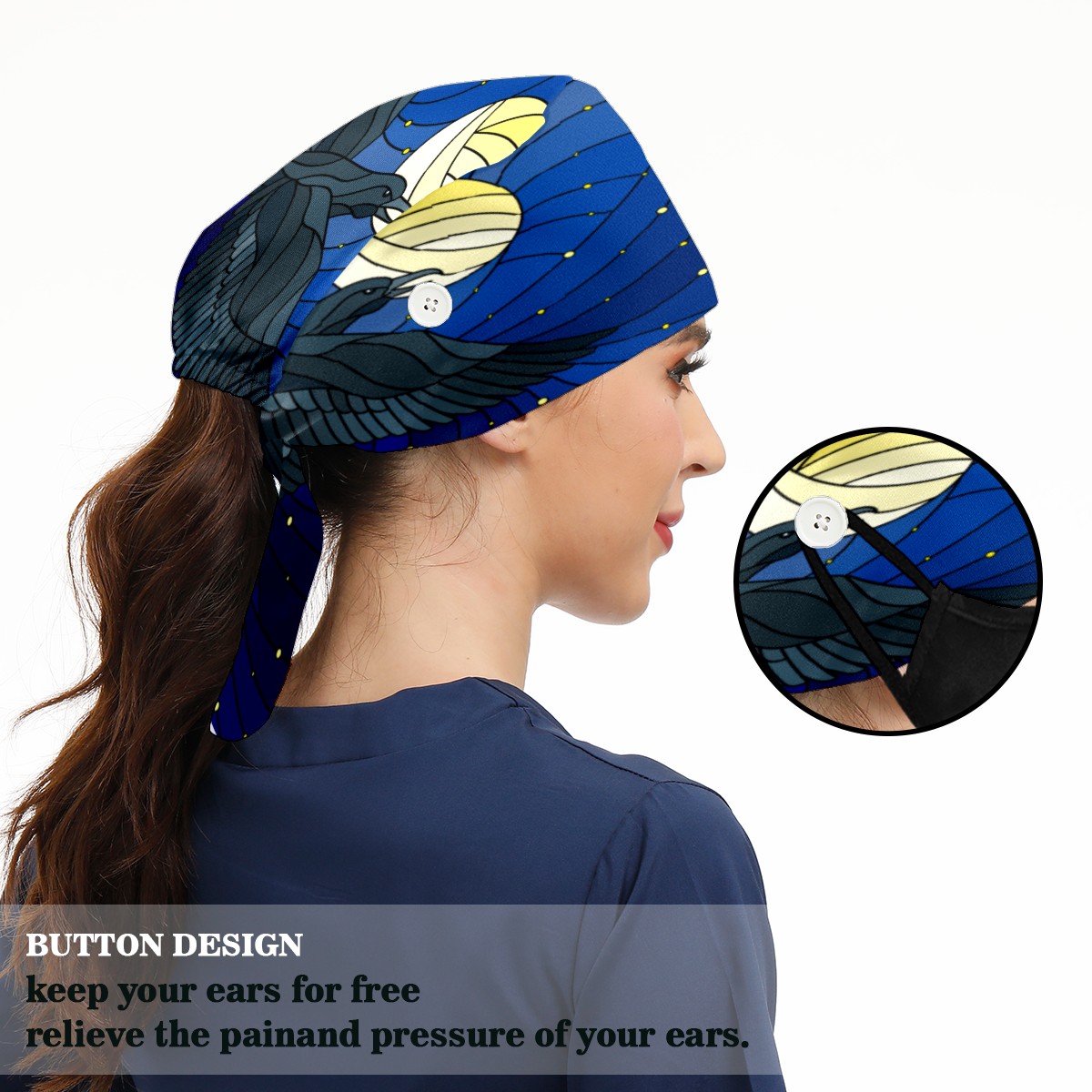 Stained Glass Crow Moon Blue Working Cap Button and Sweatband Adjustable Elastic Head Cover Hair Tie Back Work Hats for Women Men