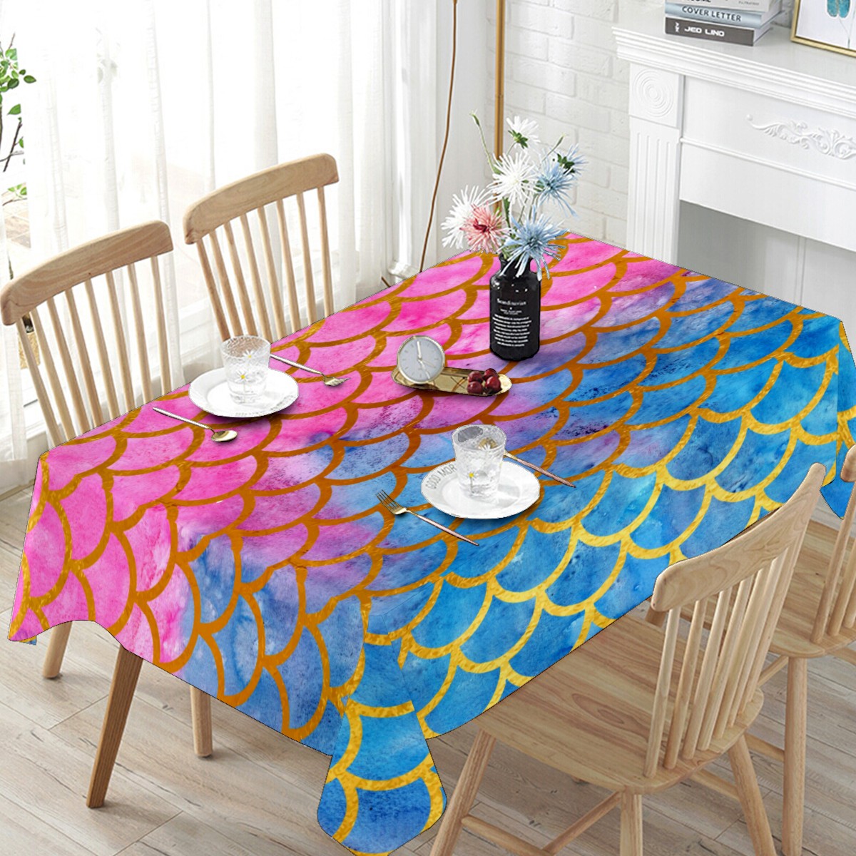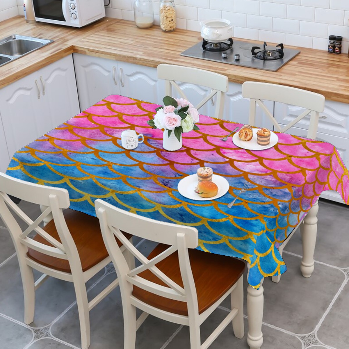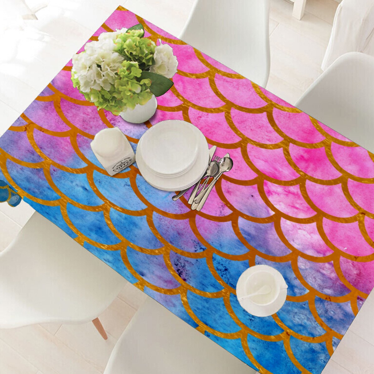 Rectangle Tablecloth Mermaid Scale Watercolor Rainbow Table Cloth 54x54in Table Cover for Kitchen Dining Table Party Home Decoration Washable Table Runner