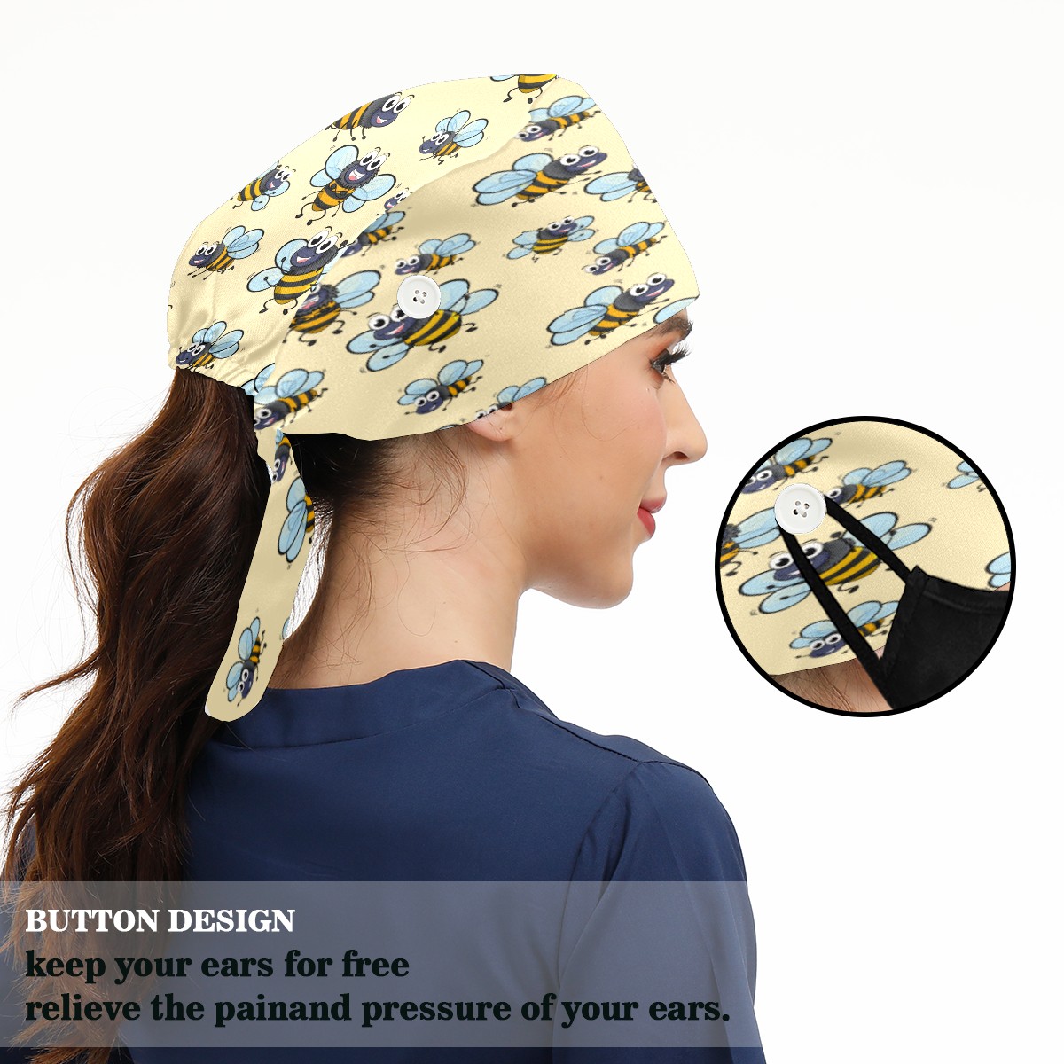 <p>Working cap with Sweatband and Button for Women Men</p><p>Material&nbsp;: 50% cotton+50% polyester</p><p>Size:&nbsp;One size fits most,&nbsp;suitable for both men and women.</p><p>Working Cap with Buttons Design:special&nbsp;design with buttons to protect ears for those who are wearing ma-sk. These new styles hats will allow you to put the straps around the buttons instead of your ears, make you feel more comfortable.</p><p>Sweat-absorbent towel cloth inside: Built-in&nbsp;100% cotton sweatband, keep the forehead clean after long time working.</p><p>Widely occasion: Widely used in beauty spa, house cleaning, cooking, sleeping, or for cos-play&nbsp;party.</p><p>Lovely pattern: lovely&nbsp;3D printed&nbsp;pattern,&nbsp;it's perfect for gift to you family&nbsp;and friends.</p>