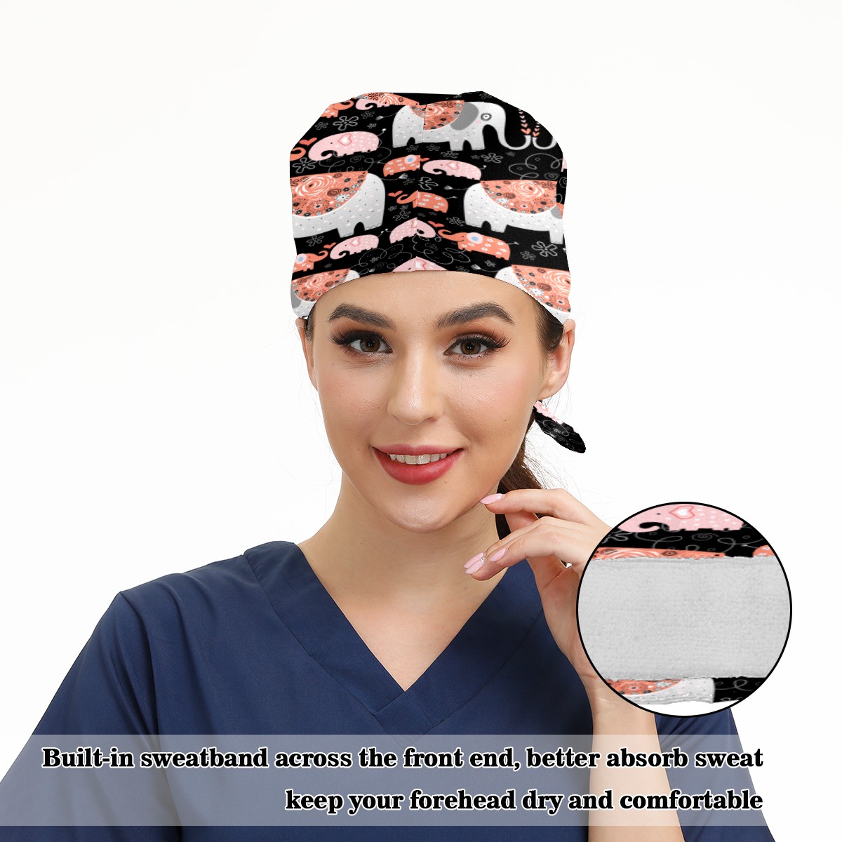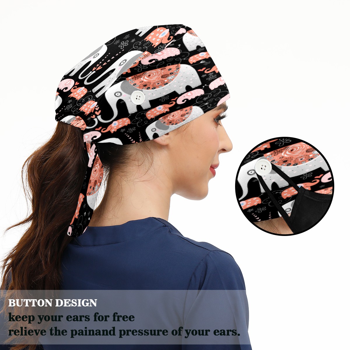 <p>Working cap with Sweatband and Button for Women Men</p><p>Material&nbsp;: 50% cotton+50% polyester</p><p>Size:&nbsp;One size fits most,&nbsp;suitable for both men and women.</p><p>Working Cap with Buttons Design:special&nbsp;design with buttons to protect ears for those who are wearing ma-sk. These new styles hats will allow you to put the straps around the buttons instead of your ears, make you feel more comfortable.</p><p>Sweat-absorbent towel cloth inside: Built-in&nbsp;100% cotton sweatband, keep the forehead clean after long time working.</p><p>Widely occasion: Widely used in beauty spa, house cleaning, cooking, sleeping, or for cos-play&nbsp;party.</p><p>Lovely pattern: lovely&nbsp;3D printed&nbsp;pattern,&nbsp;it's perfect for gift to you family&nbsp;and friends.</p>