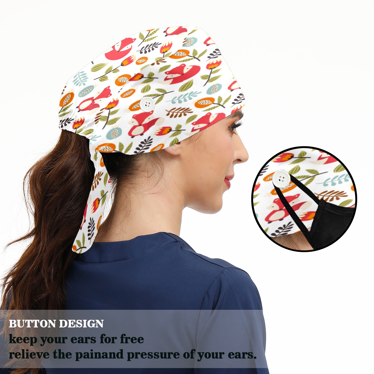 <p>Working cap with Sweatband and Button for Women Men</p><p>Material&nbsp;: 50% cotton+50% polyester</p><p>Size:&nbsp;One size fits most,&nbsp;suitable for both men and women.</p><p>Working Cap with Buttons Design:special&nbsp;design with buttons to protect ears for those who are wearing ma-sk. These new styles hats will allow you to put the straps around the buttons instead of your ears, make you feel more comfortable.</p><p>Sweat-absorbent towel cloth inside: Built-in&nbsp;100% cotton sweatband, keep the forehead clean after long time working.</p><p>Widely occasion: Widely used in beauty spa, house cleaning, cooking, sleeping, or for cos-play&nbsp;party.</p><p>Lovely pattern: lovely&nbsp;3D printed&nbsp;pattern,&nbsp;it's perfect for gift to you family&nbsp;and friends.</p>