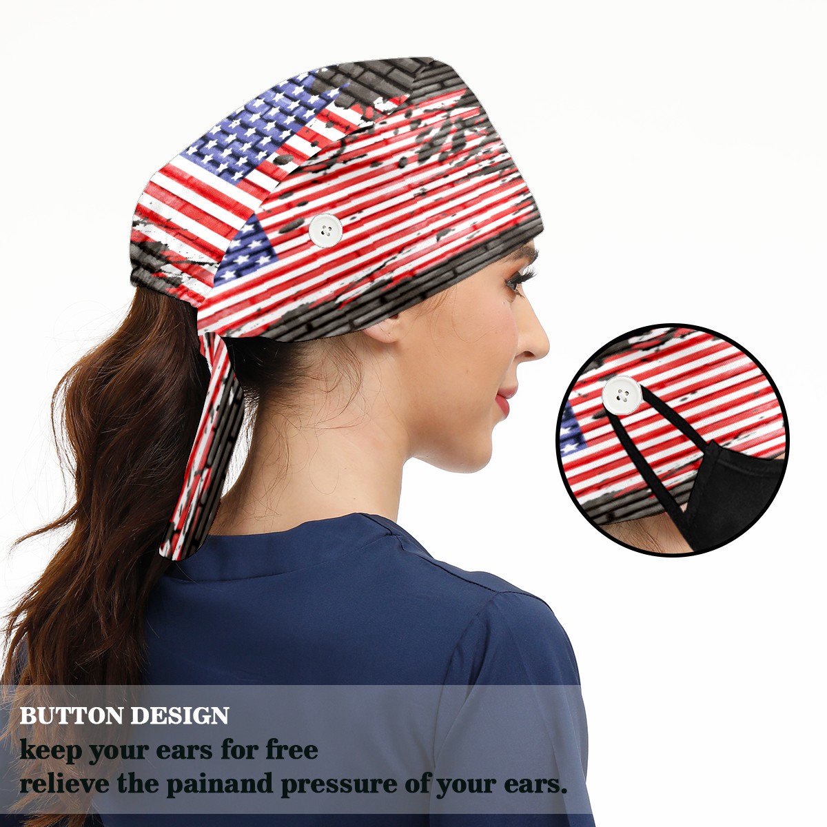 <p>Working cap with Sweatband and Button for Women Men</p><p>Material&nbsp;: 50% cotton+50% polyester</p><p>Size:&nbsp;One size fits most,&nbsp;suitable for both men and women.</p><p>Working Cap with Buttons Design:special&nbsp;design with buttons to protect ears for those who are wearing ma-sk. These new styles hats will allow you to put the straps around the buttons instead of your ears, make you feel more comfortable.</p><p>Sweat-absorbent towel cloth inside: Built-in&nbsp;100% cotton sweatband, keep the forehead clean after long time working.</p><p>Widely occasion: Widely used in beauty spa, house cleaning, cooking, sleeping, or for cos-play&nbsp;party.</p><p>Lovely pattern: lovely&nbsp;3D printed&nbsp;pattern,&nbsp;it's perfect for gift to you family&nbsp;and friends.</p>