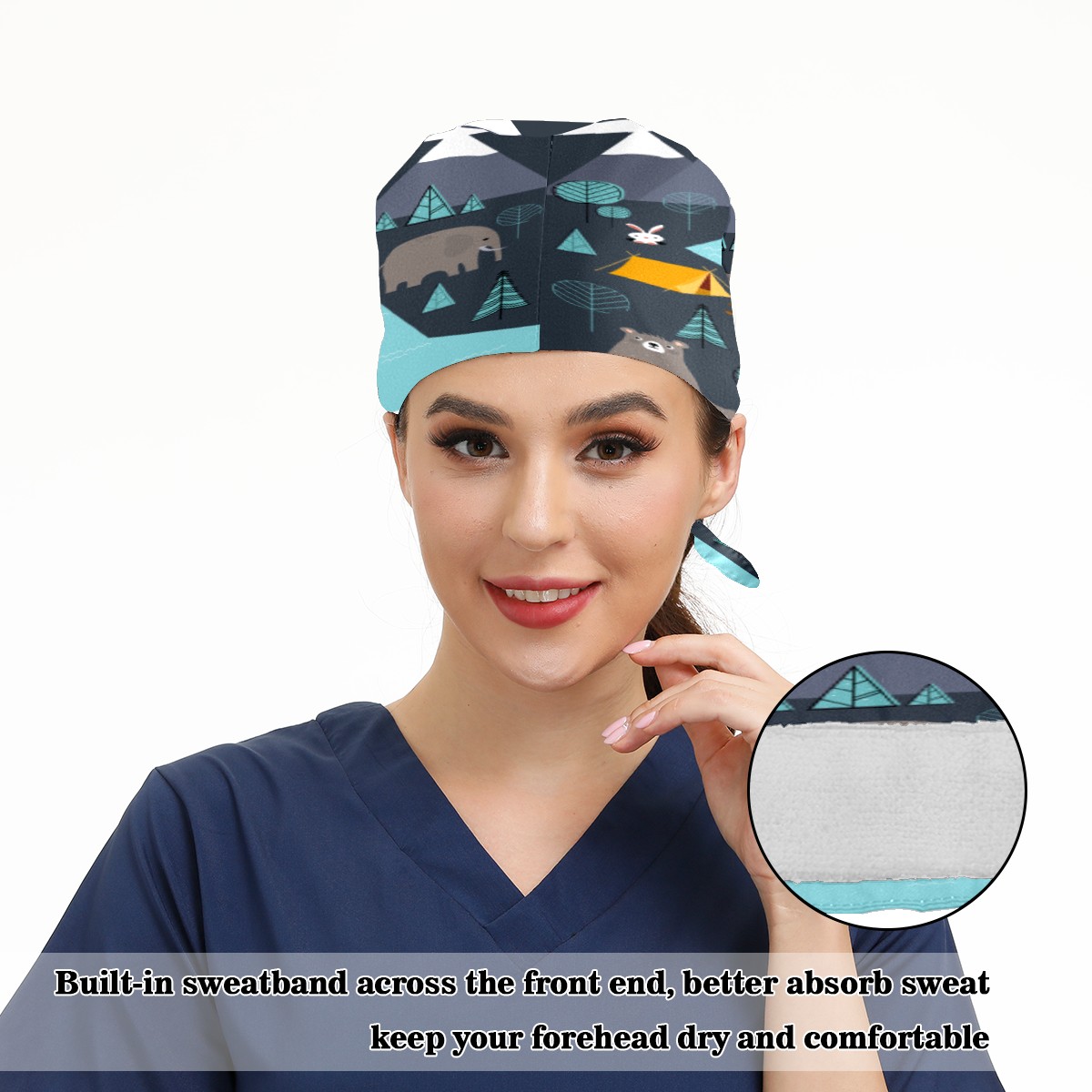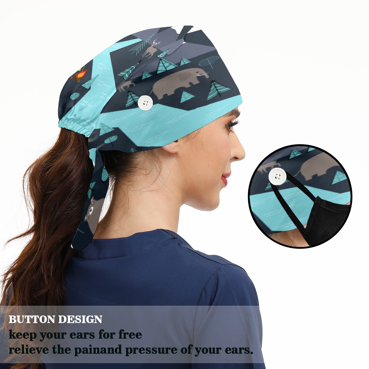 <p>Working cap with Sweatband and Button for Women Men</p><p>Material&nbsp;: 50% cotton+50% polyester</p><p>Size:&nbsp;One size fits most,&nbsp;suitable for both men and women.</p><p>Working Cap with Buttons Design:special&nbsp;design with buttons to protect ears for those who are wearing ma-sk. These new styles hats will allow you to put the straps around the buttons instead of your ears, make you feel more comfortable.</p><p>Sweat-absorbent towel cloth inside: Built-in&nbsp;100% cotton sweatband, keep the forehead clean after long time working.</p><p>Widely occasion: Widely used in beauty spa, house cleaning, cooking, sleeping, or for cos-play&nbsp;party.</p><p>Lovely pattern: lovely&nbsp;3D printed&nbsp;pattern,&nbsp;it's perfect for gift to you family&nbsp;and friends.</p>