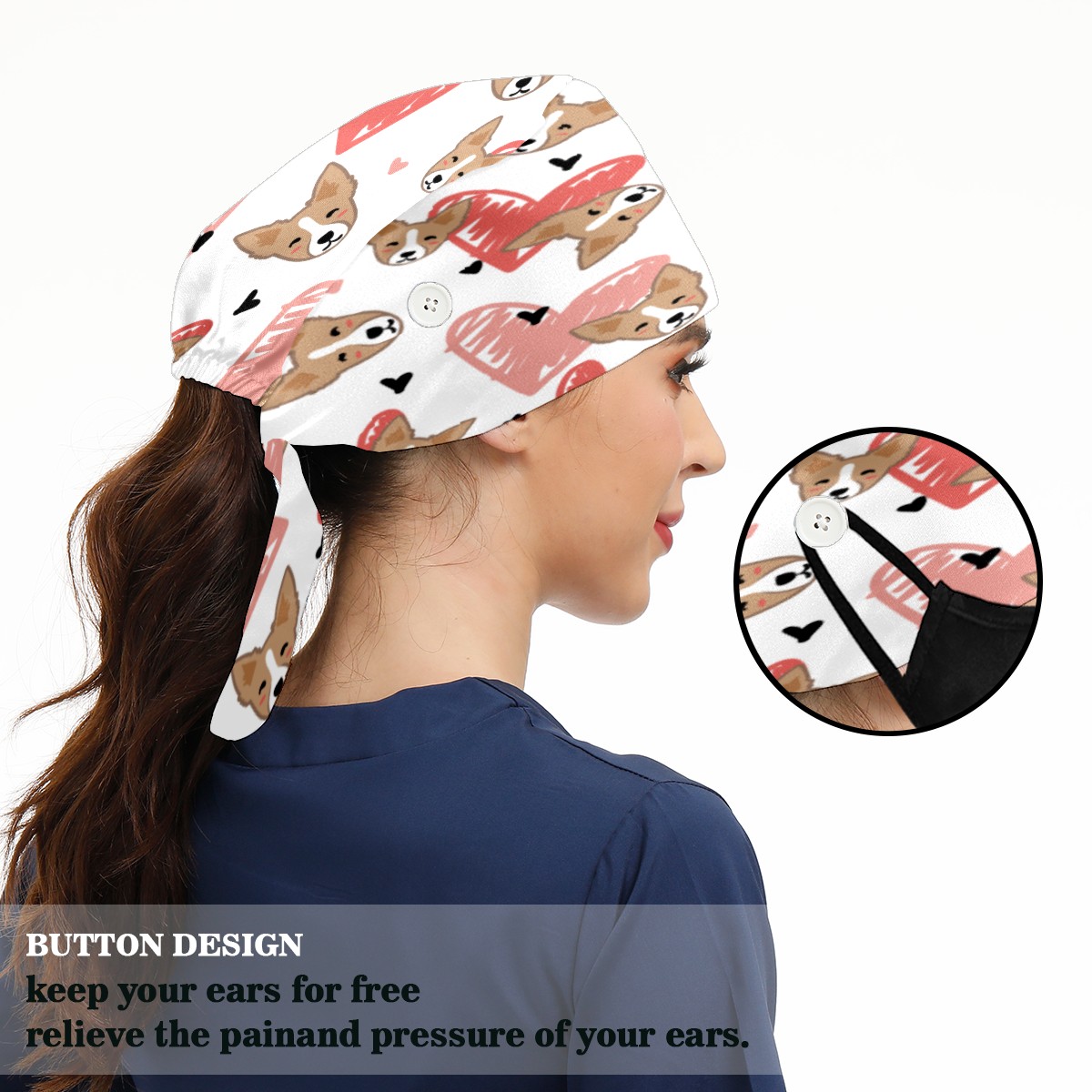 <p>Working cap with Sweatband and Button for Women Men</p><p>Material&nbsp;: 50% cotton+50% polyester</p><p>Size:&nbsp;One size fits most,&nbsp;suitable for both men and women.</p><p>Working Cap with Buttons Design:special&nbsp;design with buttons to protect ears for those who are wearing ma-sk. These new styles hats will allow you to put the straps around the buttons instead of your ears, make you feel more comfortable.</p><p>Sweat-absorbent towel cloth inside: Built-in&nbsp;100% cotton sweatband, keep the forehead clean after long time working.</p><p>Widely occasion: Widely used in beauty spa, house cleaning, cooking, sleeping, or for cos-play&nbsp;party.</p><p>Lovely pattern: lovely&nbsp;3D printed&nbsp;pattern,&nbsp;it's perfect for gift to you family&nbsp;and friends.</p>