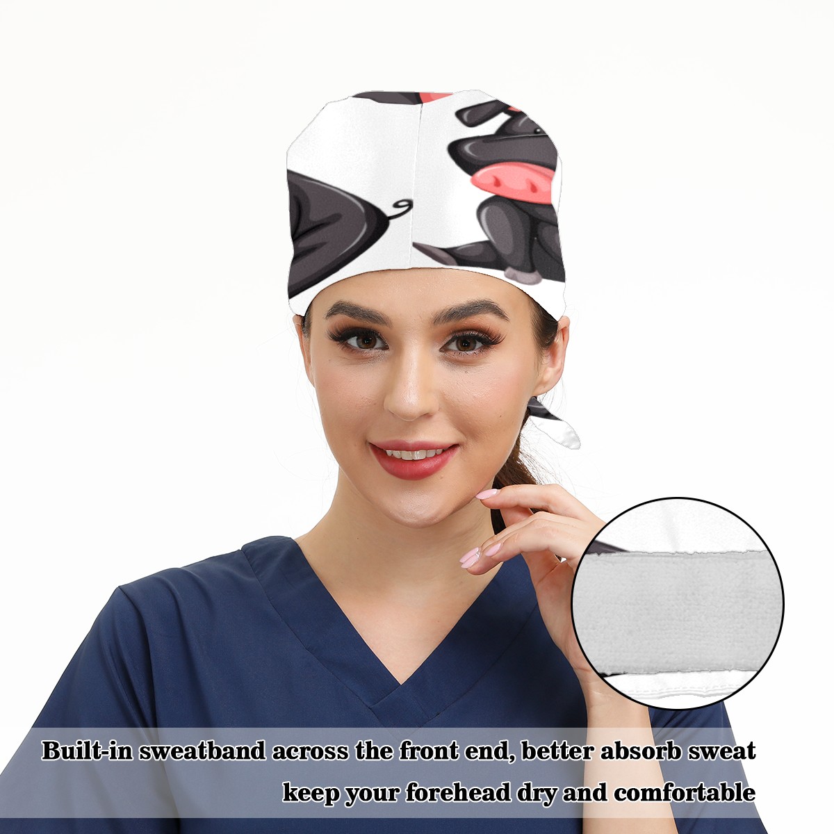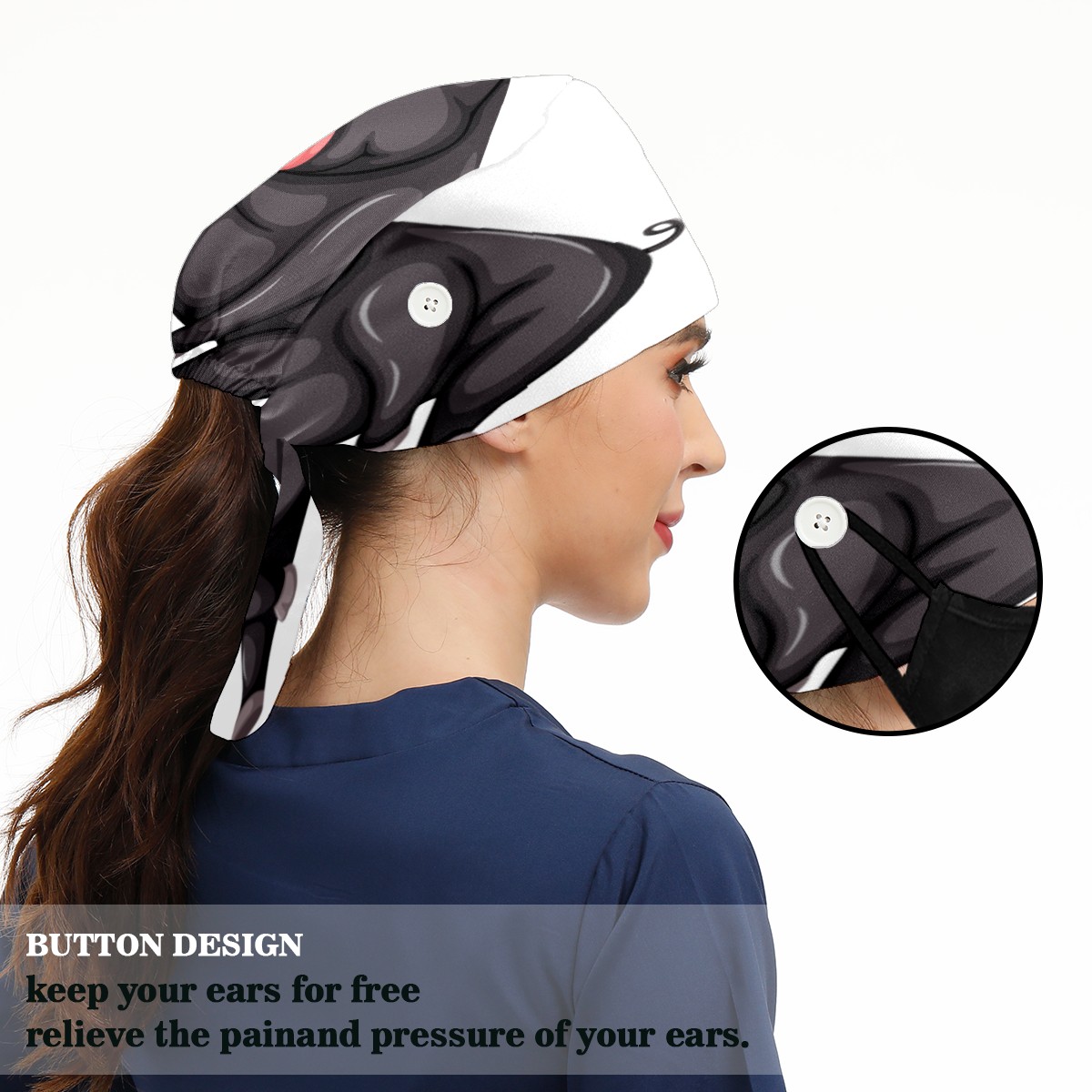 <p>Working cap with Sweatband and Button for Women Men</p><p>Material&nbsp;: 50% cotton+50% polyester</p><p>Size:&nbsp;One size fits most,&nbsp;suitable for both men and women.</p><p>Working Cap with Buttons Design:special&nbsp;design with buttons to protect ears for those who are wearing ma-sk. These new styles hats will allow you to put the straps around the buttons instead of your ears, make you feel more comfortable.</p><p>Sweat-absorbent towel cloth inside: Built-in&nbsp;100% cotton sweatband, keep the forehead clean after long time working.</p><p>Widely occasion: Widely used in beauty spa, house cleaning, cooking, sleeping, or for cos-play&nbsp;party.</p><p>Lovely pattern: lovely&nbsp;3D printed&nbsp;pattern,&nbsp;it's perfect for gift to you family&nbsp;and friends.</p>