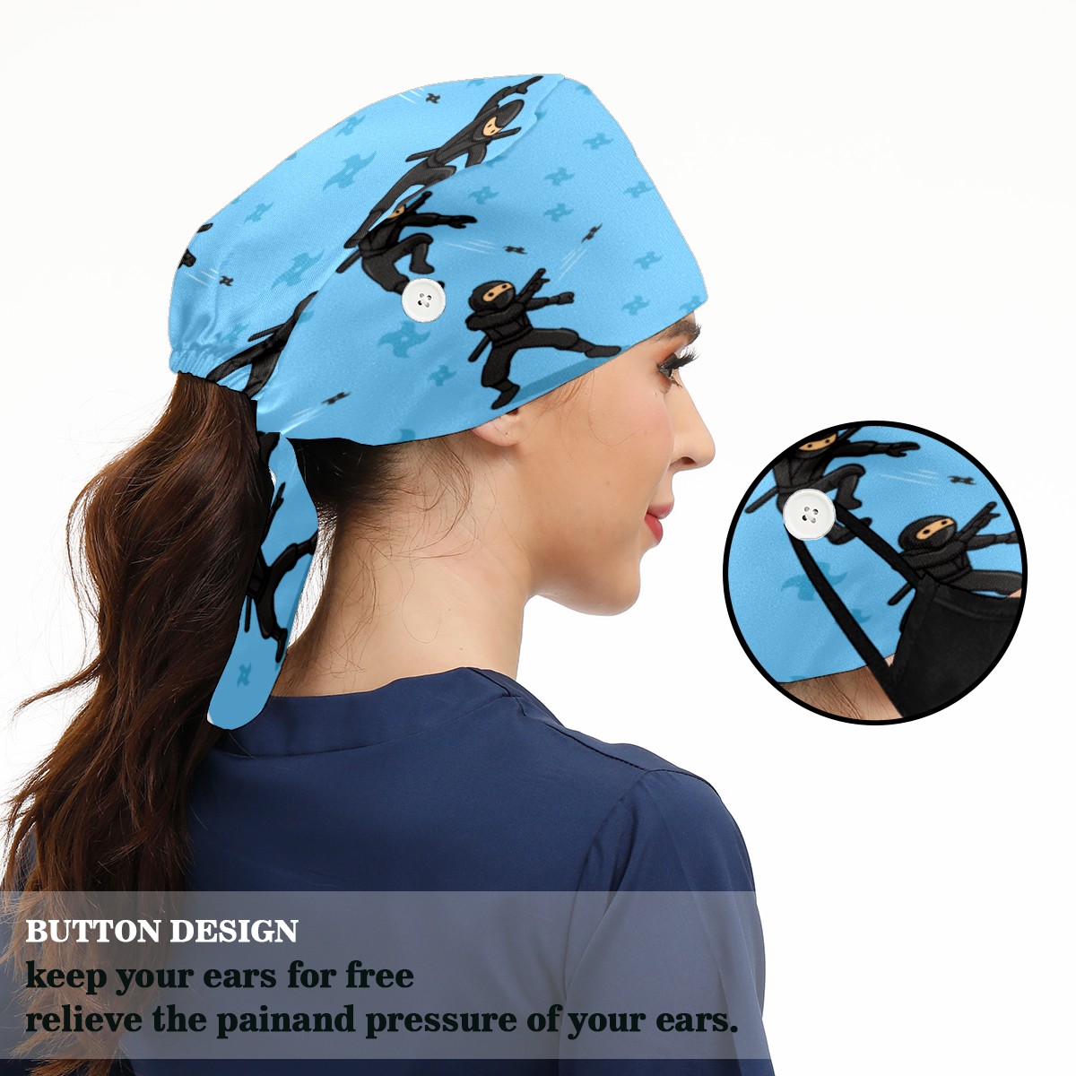 <p>Working cap with Sweatband and Button for Women Men</p><p>Material&nbsp;: 50% cotton+50% polyester</p><p>Size:&nbsp;One size fits most,&nbsp;suitable for both men and women.</p><p>Working Cap with Buttons Design:special&nbsp;design with buttons to protect ears for those who are wearing ma-sk. These new styles hats will allow you to put the straps around the buttons instead of your ears, make you feel more comfortable.</p><p>Sweat-absorbent towel cloth inside: Built-in&nbsp;100% cotton sweatband, keep the forehead clean after long time working.</p><p>Widely occasion: Widely used in beauty spa, house cleaning, cooking, sleeping, or for cos-play&nbsp;party.</p><p>Lovely pattern: lovely&nbsp;3D printed&nbsp;pattern,&nbsp;it's perfect for gift to you family&nbsp;and friends.</p>