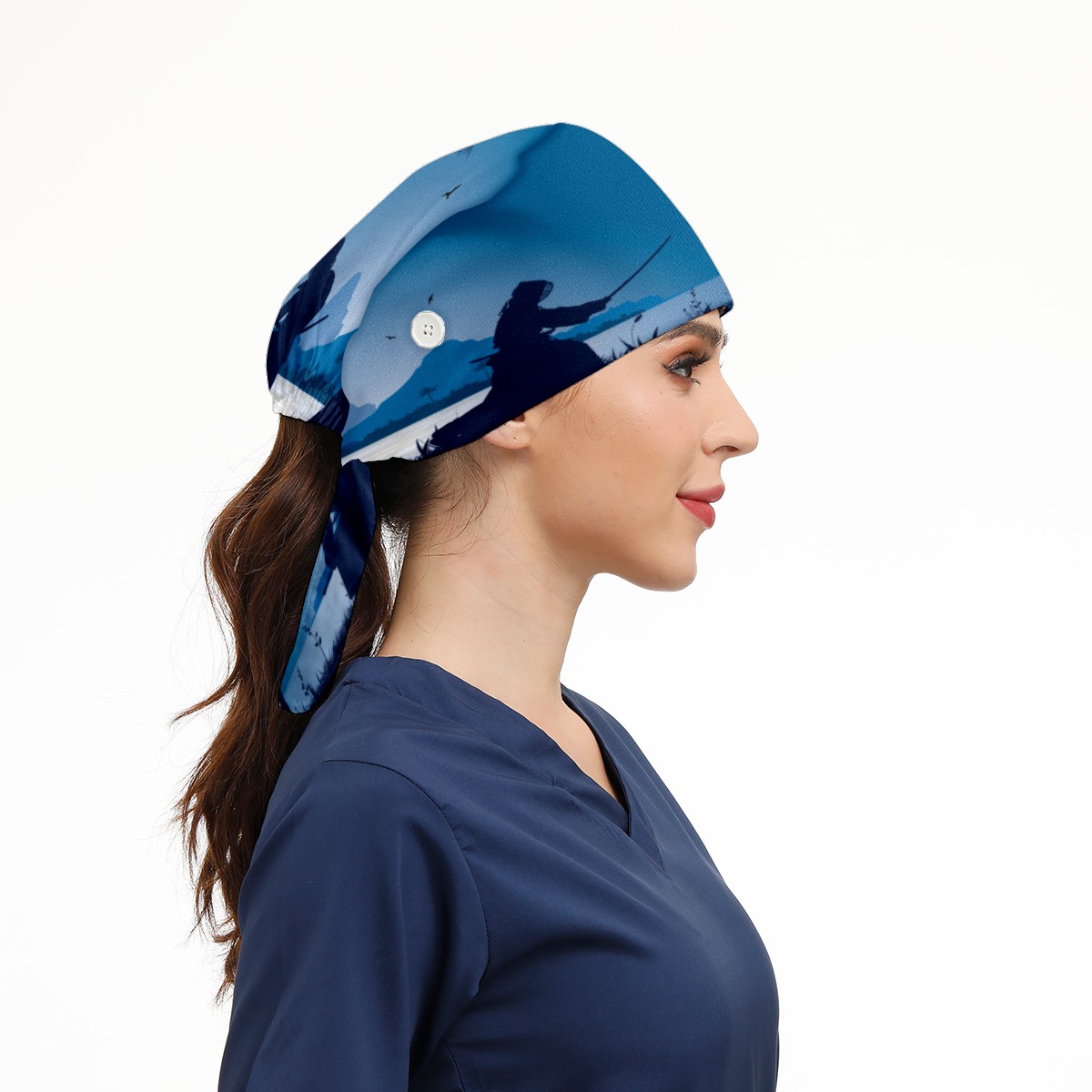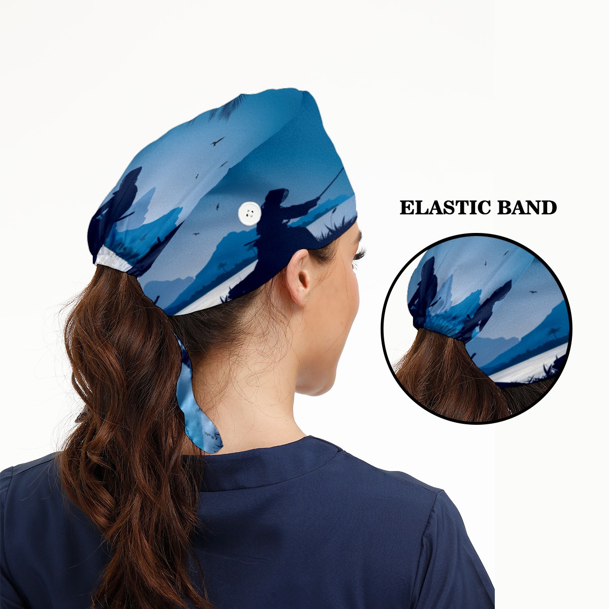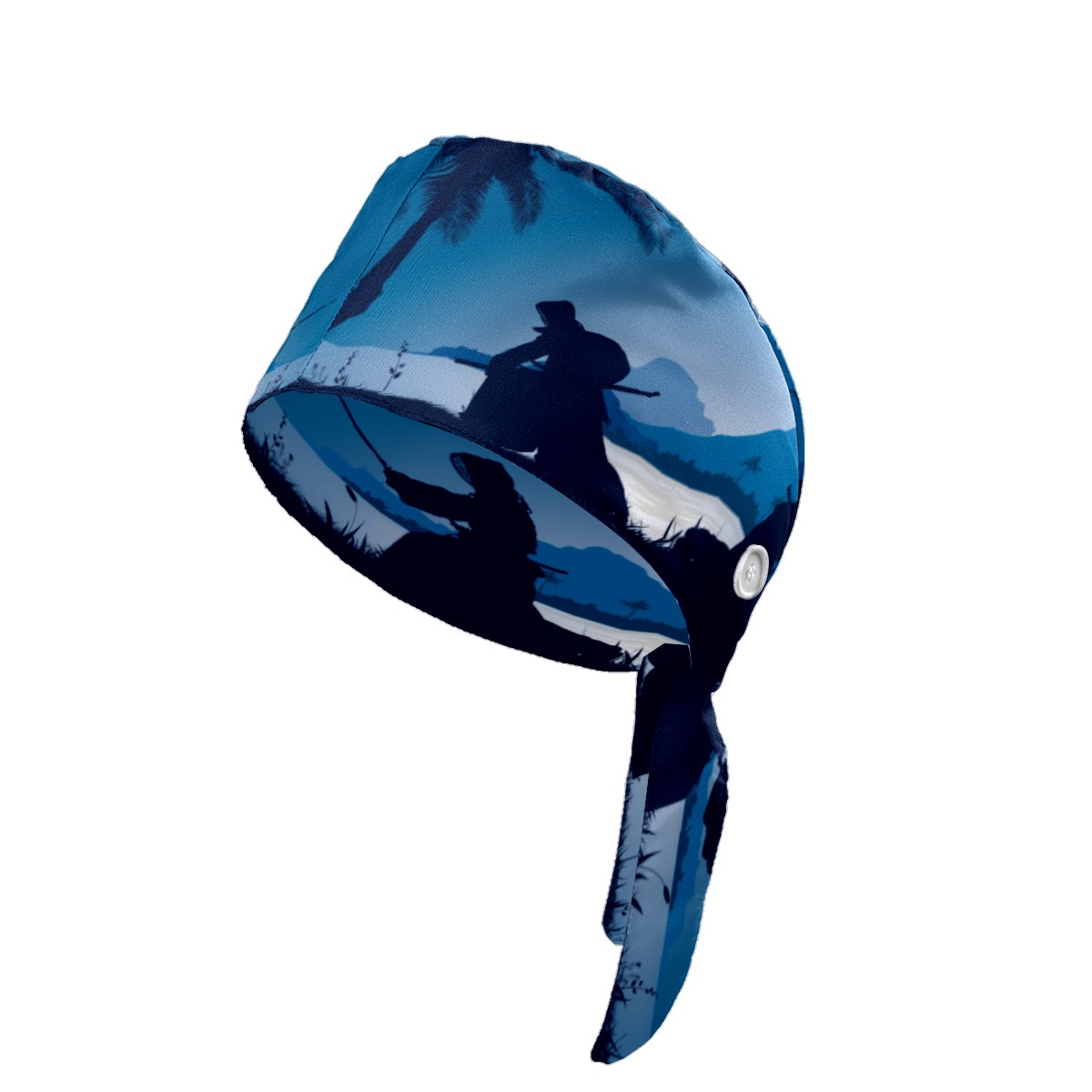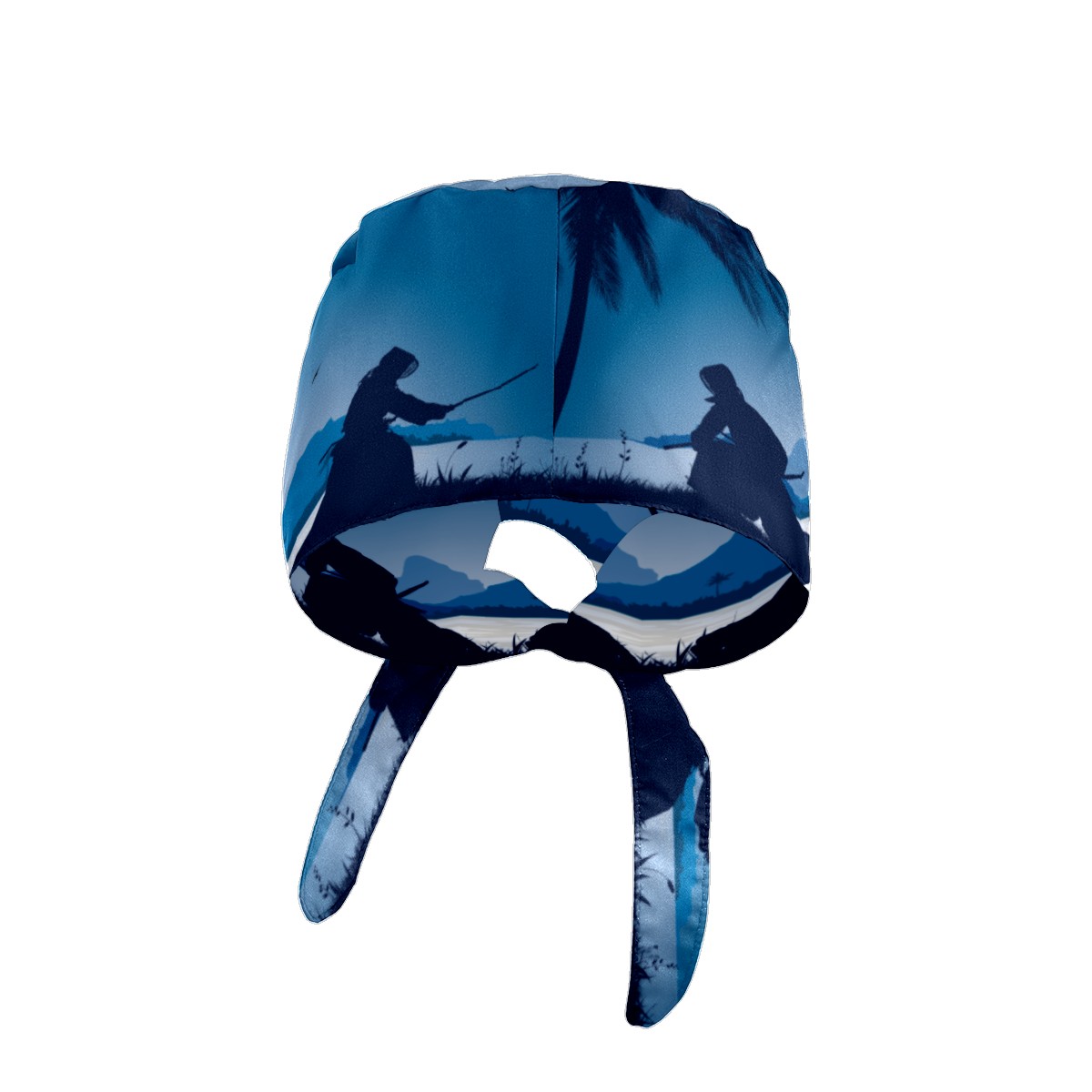 Japanese Kendo Silhouette Night Lake Blue Working Cap Button and Sweatband Adjustable Elastic Head Cover Hair Tie Back Work Hats for Women Men
