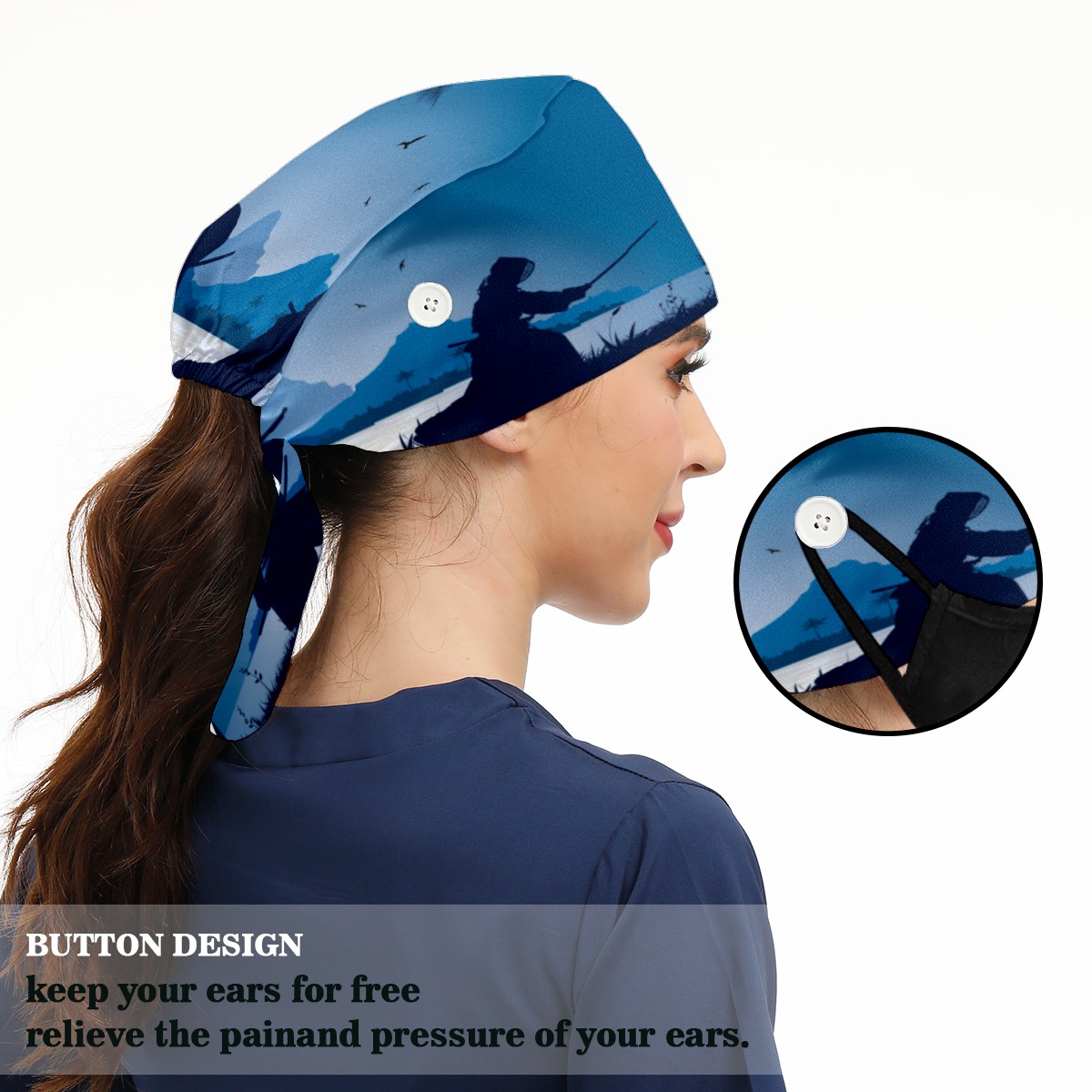 <p>Working cap with Sweatband and Button for Women Men</p><p>Material&nbsp;: 50% cotton+50% polyester</p><p>Size:&nbsp;One size fits most,&nbsp;suitable for both men and women.</p><p>Working Cap with Buttons Design:special&nbsp;design with buttons to protect ears for those who are wearing ma-sk. These new styles hats will allow you to put the straps around the buttons instead of your ears, make you feel more comfortable.</p><p>Sweat-absorbent towel cloth inside: Built-in&nbsp;100% cotton sweatband, keep the forehead clean after long time working.</p><p>Widely occasion: Widely used in beauty spa, house cleaning, cooking, sleeping, or for cos-play&nbsp;party.</p><p>Lovely pattern: lovely&nbsp;3D printed&nbsp;pattern,&nbsp;it's perfect for gift to you family&nbsp;and friends.</p>
