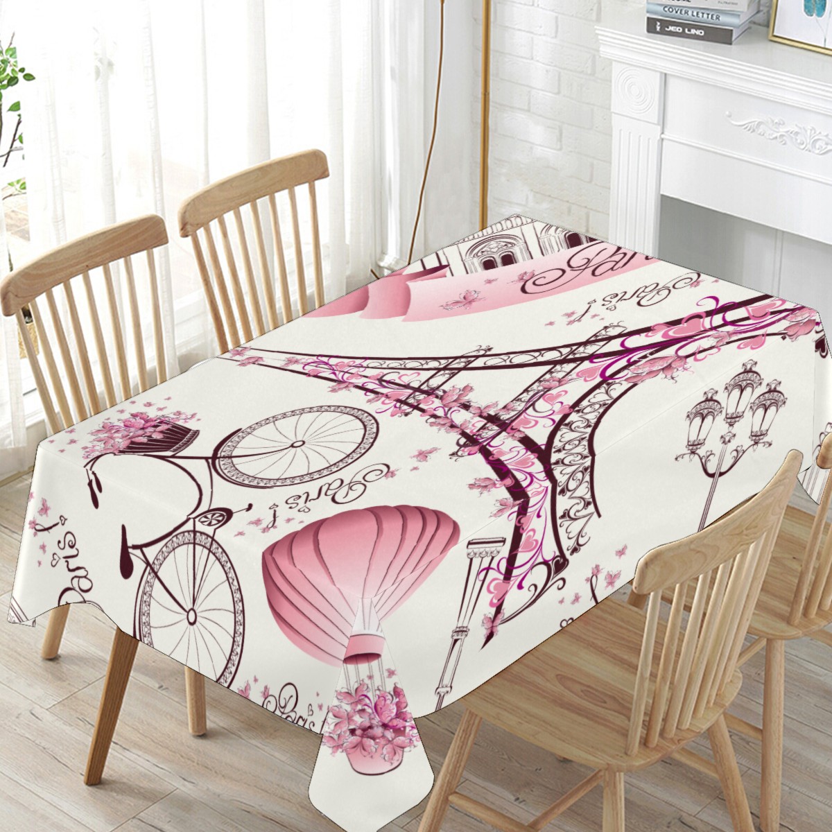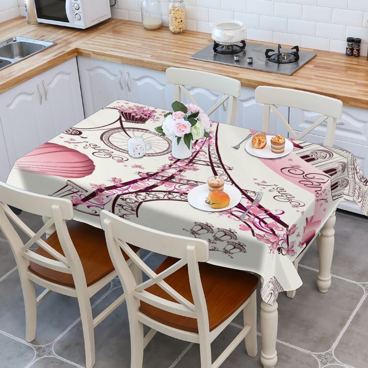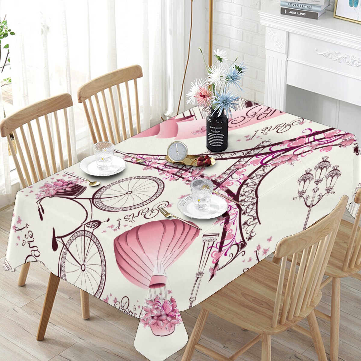 Rectangle Tablecloth Vintage Eiffel Tower Air Balloon Bike Floral Table Cloth 54x54in Table Cover for Kitchen Dining Table Party Home Decoration Washable Table Runner