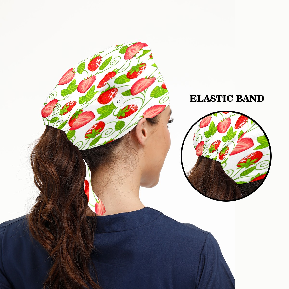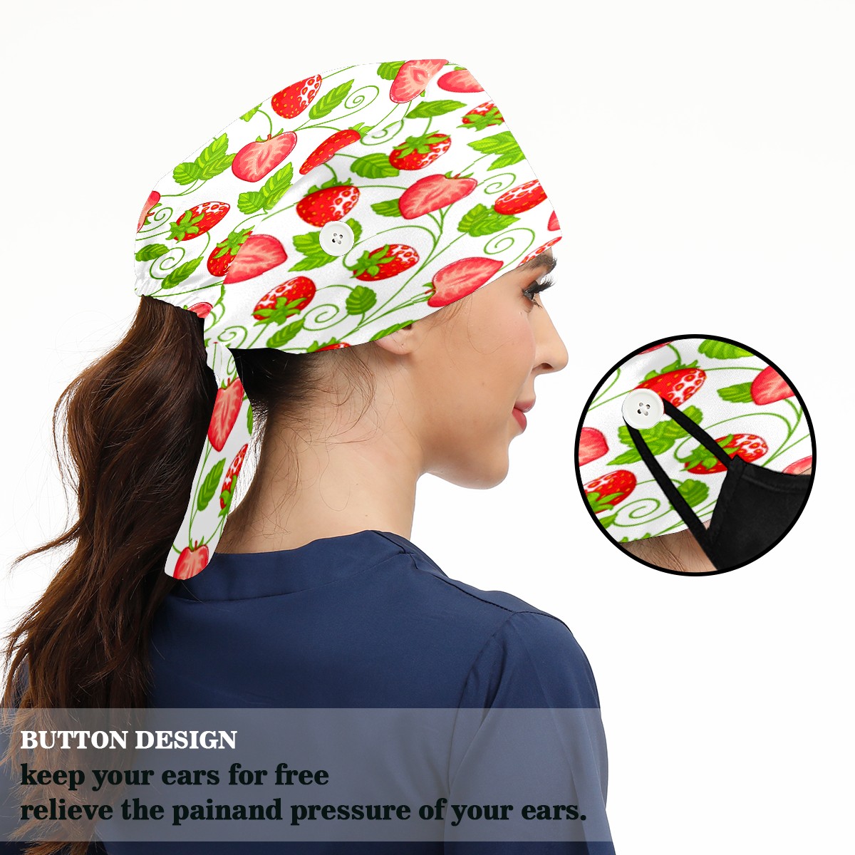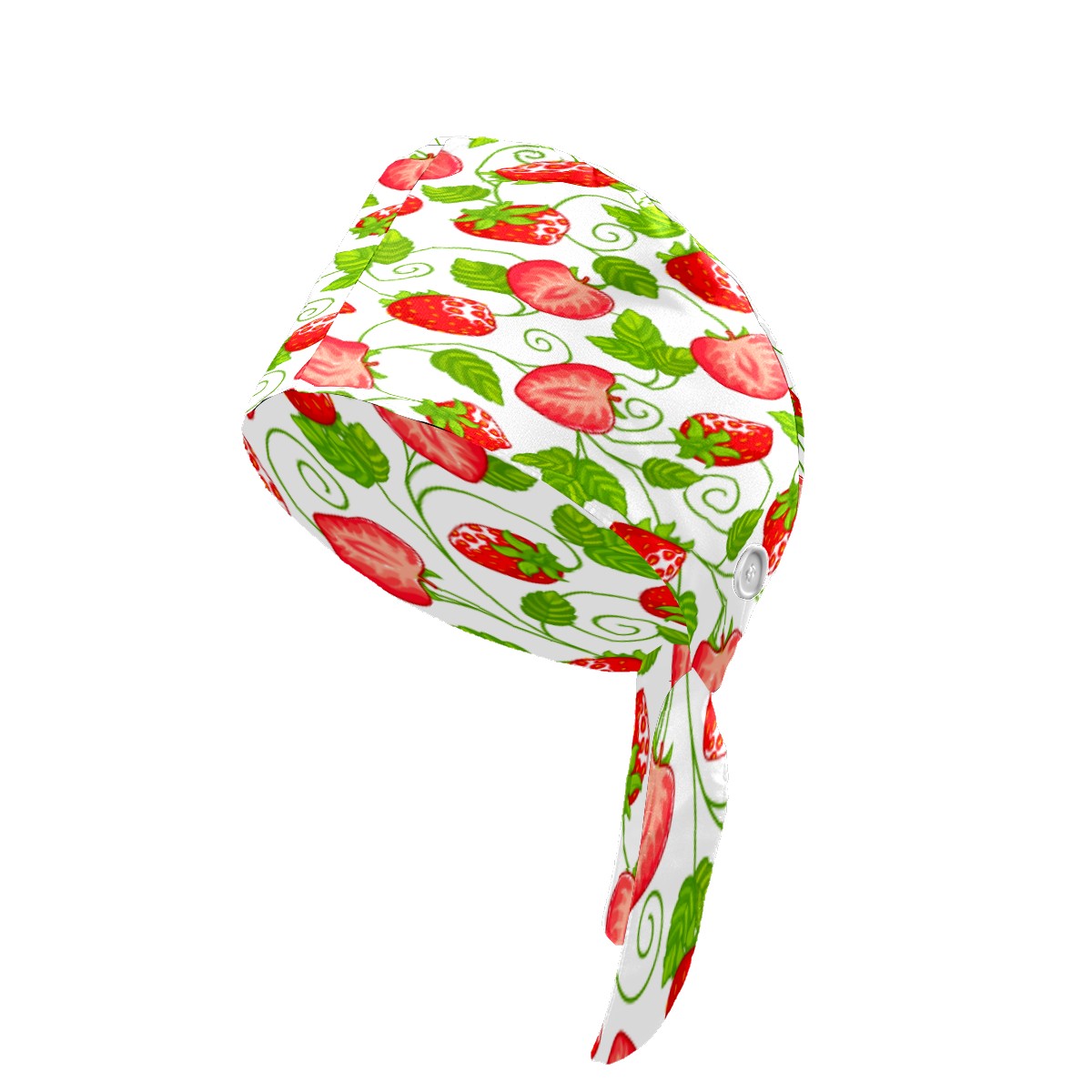 Fruit Strawberry Pattern Working Cap Button and Sweatband Adjustable Elastic Head Cover Hair Tie Back Work Hats for Women Men