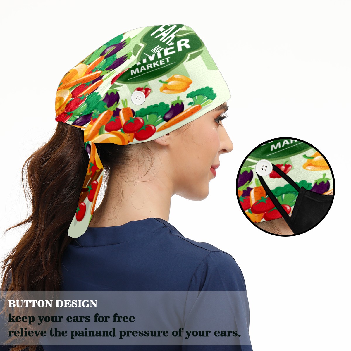 <p>Working cap with Sweatband and Button for Women Men</p><p>Material&nbsp;: 50% cotton+50% polyester</p><p>Size:&nbsp;One size fits most,&nbsp;suitable for both men and women.</p><p>Working Cap with Buttons Design:special&nbsp;design with buttons to protect ears for those who are wearing ma-sk. These new styles hats will allow you to put the straps around the buttons instead of your ears, make you feel more comfortable.</p><p>Sweat-absorbent towel cloth inside: Built-in&nbsp;100% cotton sweatband, keep the forehead clean after long time working.</p><p>Widely occasion: Widely used in beauty spa, house cleaning, cooking, sleeping, or for cos-play&nbsp;party.</p><p>Lovely pattern: lovely&nbsp;3D printed&nbsp;pattern,&nbsp;it's perfect for gift to you family&nbsp;and friends.</p>