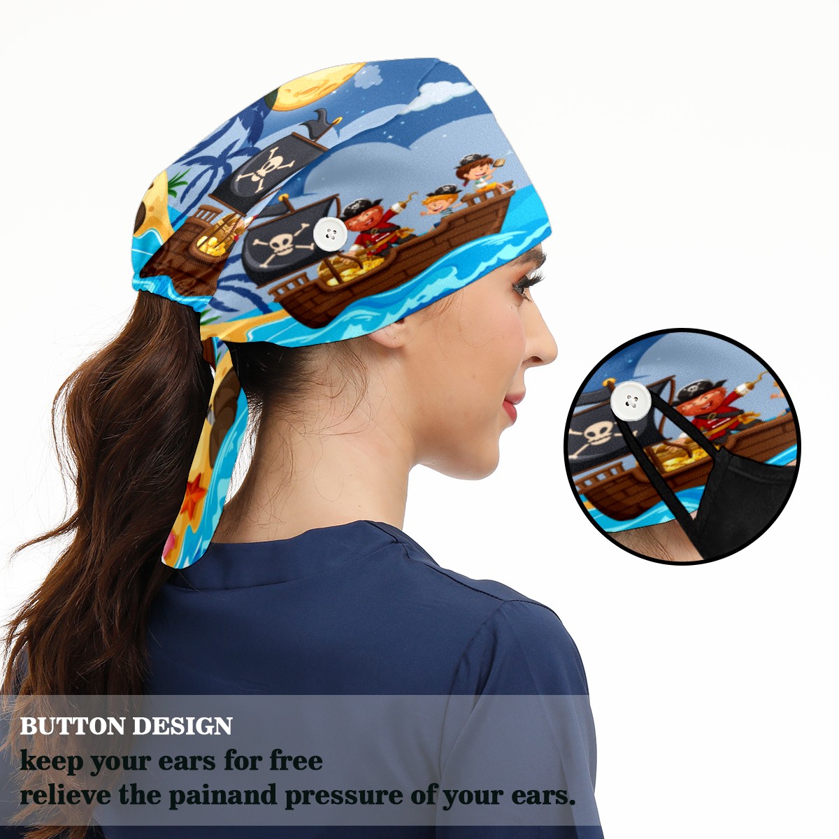 <p>Working cap with Sweatband and Button for Women Men</p><p>Material&nbsp;: 50% cotton+50% polyester</p><p>Size:&nbsp;One size fits most,&nbsp;suitable for both men and women.</p><p>Working Cap with Buttons Design:special&nbsp;design with buttons to protect ears for those who are wearing ma-sk. These new styles hats will allow you to put the straps around the buttons instead of your ears, make you feel more comfortable.</p><p>Sweat-absorbent towel cloth inside: Built-in&nbsp;100% cotton sweatband, keep the forehead clean after long time working.</p><p>Widely occasion: Widely used in beauty spa, house cleaning, cooking, sleeping, or for cos-play&nbsp;party.</p><p>Lovely pattern: lovely&nbsp;3D printed&nbsp;pattern,&nbsp;it's perfect for gift to you family&nbsp;and friends.</p>