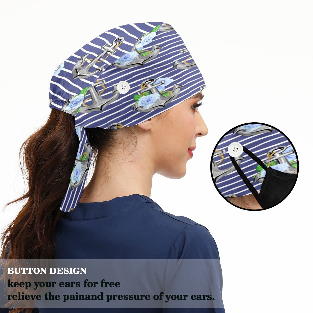 <p>Working cap with Sweatband and Button for Women Men</p><p>Material&nbsp;: 50% cotton+50% polyester</p><p>Size:&nbsp;One size fits most,&nbsp;suitable for both men and women.</p><p>Working Cap with Buttons Design:special&nbsp;design with buttons to protect ears for those who are wearing ma-sk. These new styles hats will allow you to put the straps around the buttons instead of your ears, make you feel more comfortable.</p><p>Sweat-absorbent towel cloth inside: Built-in&nbsp;100% cotton sweatband, keep the forehead clean after long time working.</p><p>Widely occasion: Widely used in beauty spa, house cleaning, cooking, sleeping, or for cos-play&nbsp;party.</p><p>Lovely pattern: lovely&nbsp;3D printed&nbsp;pattern,&nbsp;it's perfect for gift to you family&nbsp;and friends.</p>