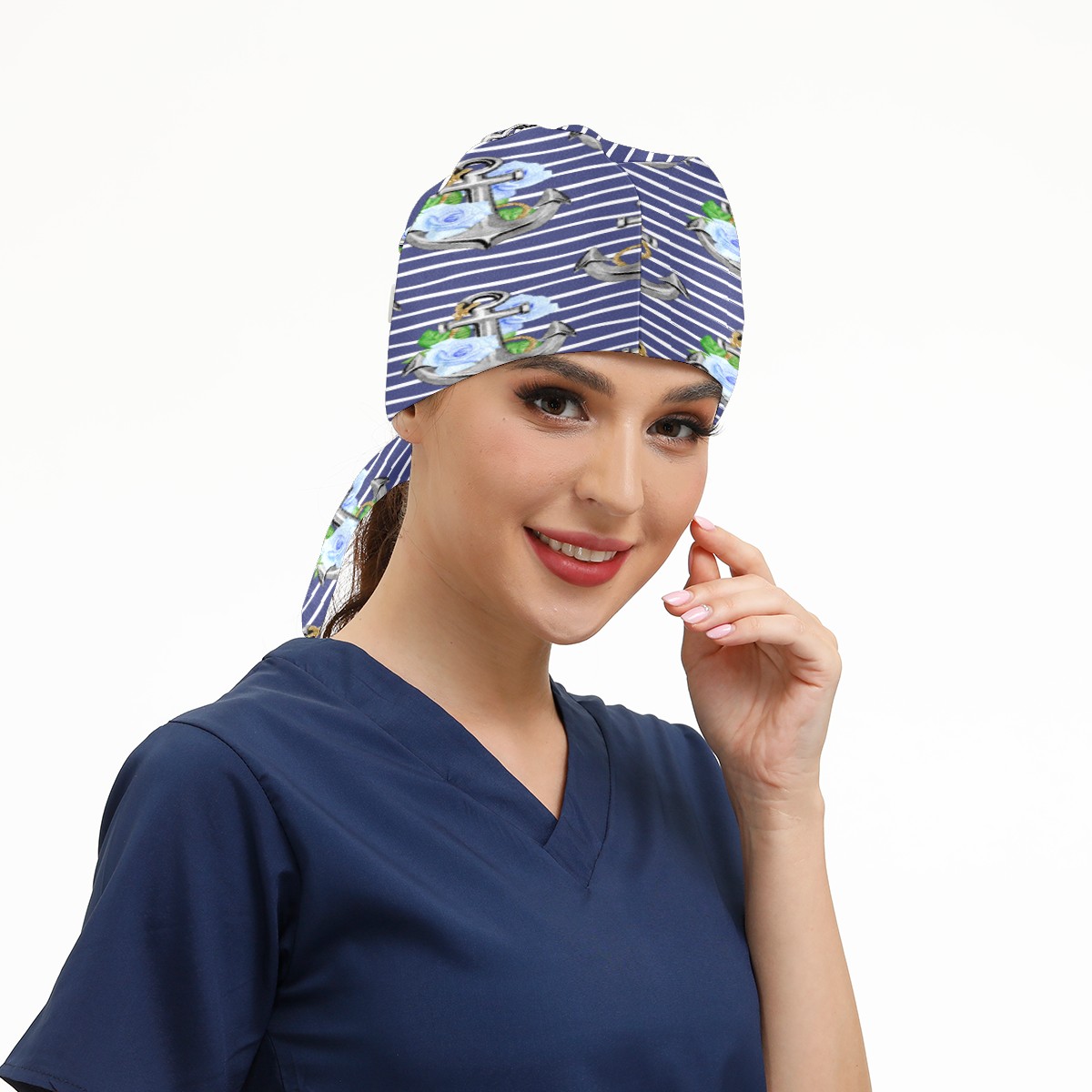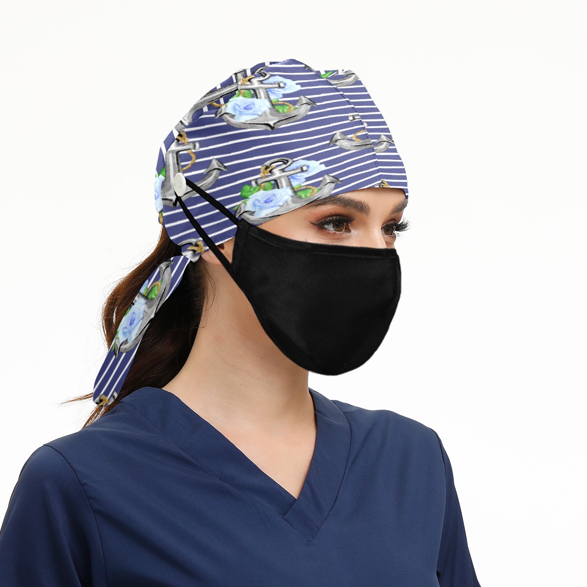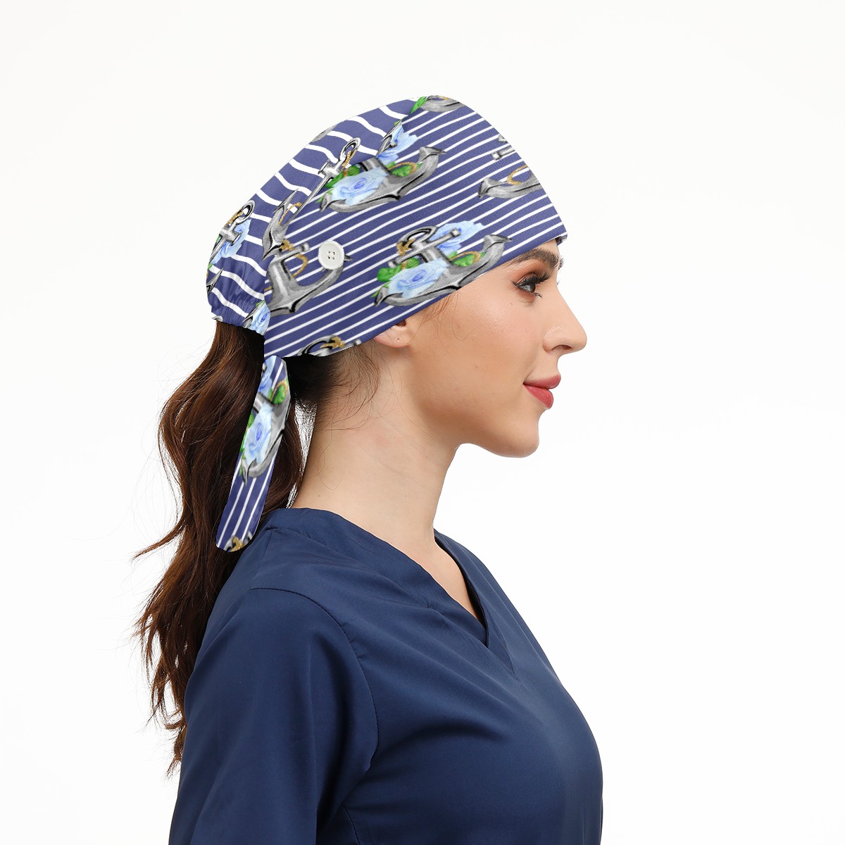 Stripe Nautical Anchor Floral Print Working Cap Button and Sweatband Adjustable Elastic Head Cover Hair Tie Back Work Hats for Women Men