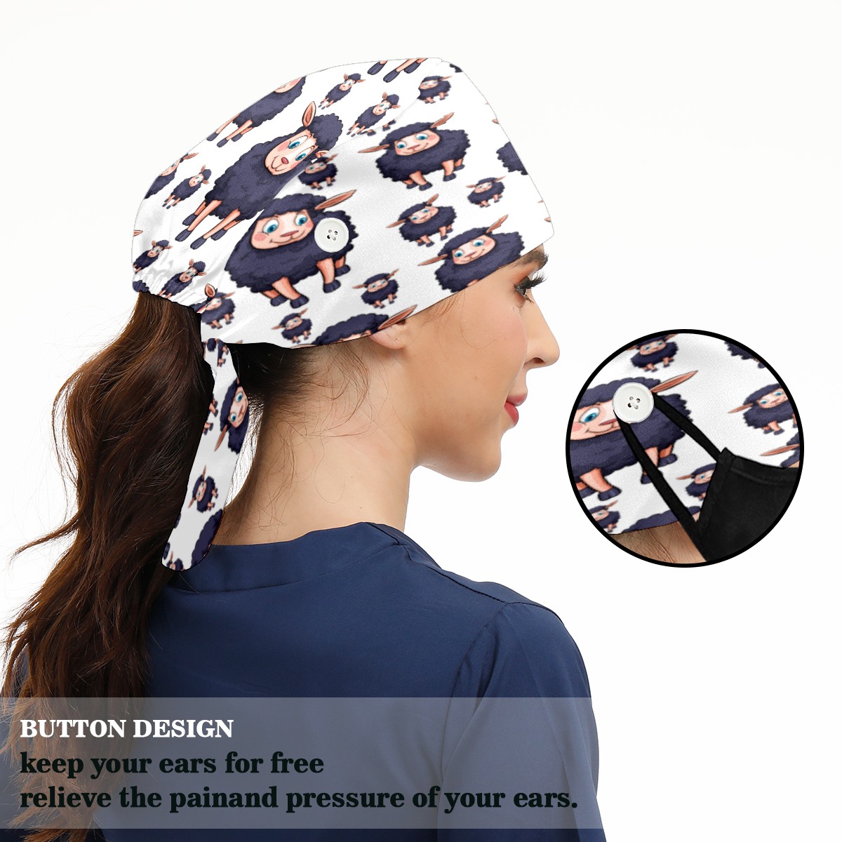 <p>Working cap with Sweatband and Button for Women Men</p><p>Material&nbsp;: 50% cotton+50% polyester</p><p>Size:&nbsp;One size fits most,&nbsp;suitable for both men and women.</p><p>Working Cap with Buttons Design:special&nbsp;design with buttons to protect ears for those who are wearing ma-sk. These new styles hats will allow you to put the straps around the buttons instead of your ears, make you feel more comfortable.</p><p>Sweat-absorbent towel cloth inside: Built-in&nbsp;100% cotton sweatband, keep the forehead clean after long time working.</p><p>Widely occasion: Widely used in beauty spa, house cleaning, cooking, sleeping, or for cos-play&nbsp;party.</p><p>Lovely pattern: lovely&nbsp;3D printed&nbsp;pattern,&nbsp;it's perfect for gift to you family&nbsp;and friends.</p>