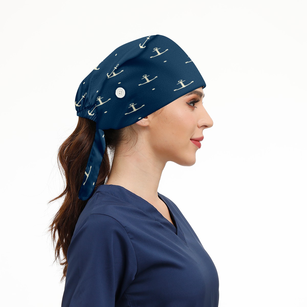 Nautical Anchor Blue Pattern Working Cap Button and Sweatband Adjustable Elastic Head Cover Hair Tie Back Work Hats for Women Men