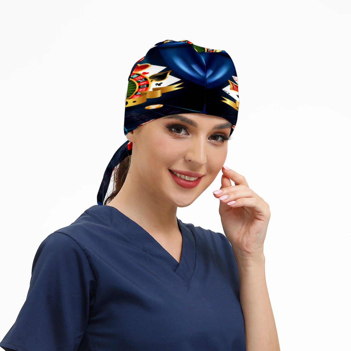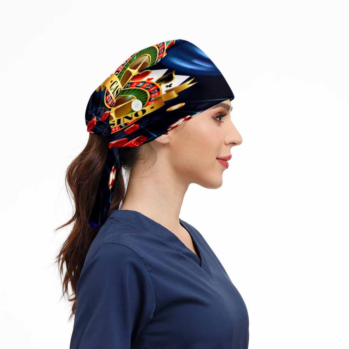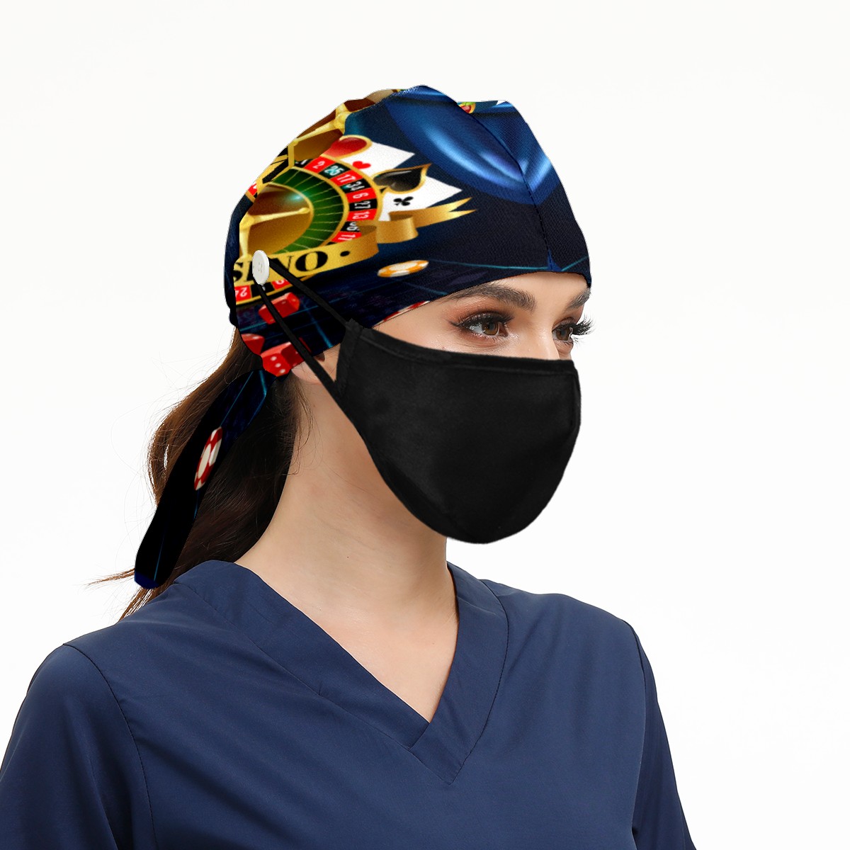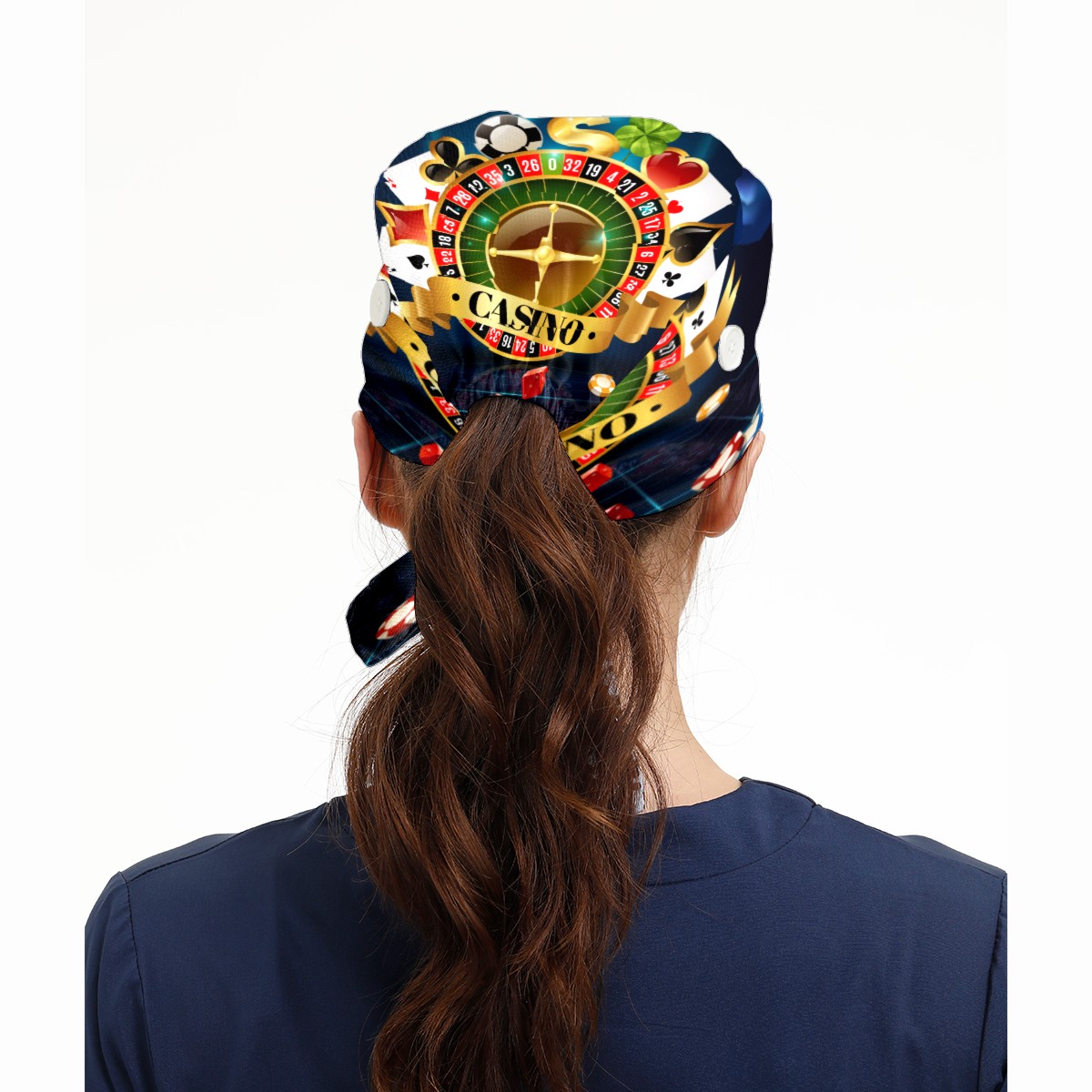 Casino Night Games Dice Playing Cards Symbols Working Cap Button and Sweatband Adjustable Elastic Head Cover Hair Tie Back Work Hats for Women Men