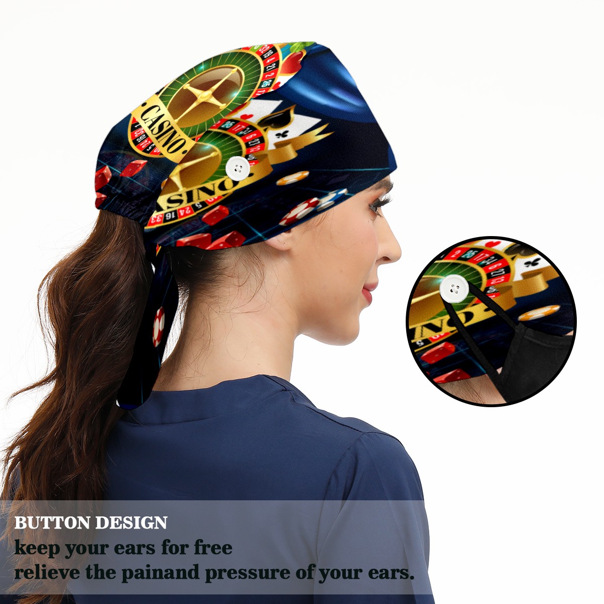 <p>Working cap with Sweatband and Button for Women Men</p><p>Material&nbsp;: 50% cotton+50% polyester</p><p>Size:&nbsp;One size fits most,&nbsp;suitable for both men and women.</p><p>Working Cap with Buttons Design:special&nbsp;design with buttons to protect ears for those who are wearing ma-sk. These new styles hats will allow you to put the straps around the buttons instead of your ears, make you feel more comfortable.</p><p>Sweat-absorbent towel cloth inside: Built-in&nbsp;100% cotton sweatband, keep the forehead clean after long time working.</p><p>Widely occasion: Widely used in beauty spa, house cleaning, cooking, sleeping, or for cos-play&nbsp;party.</p><p>Lovely pattern: lovely&nbsp;3D printed&nbsp;pattern,&nbsp;it's perfect for gift to you family&nbsp;and friends.</p>