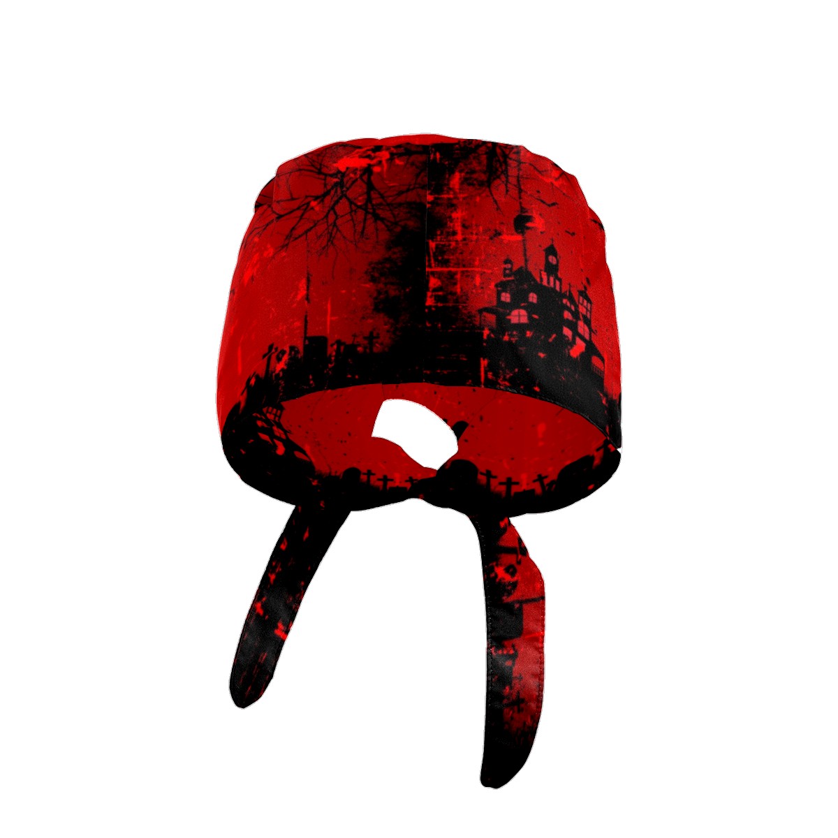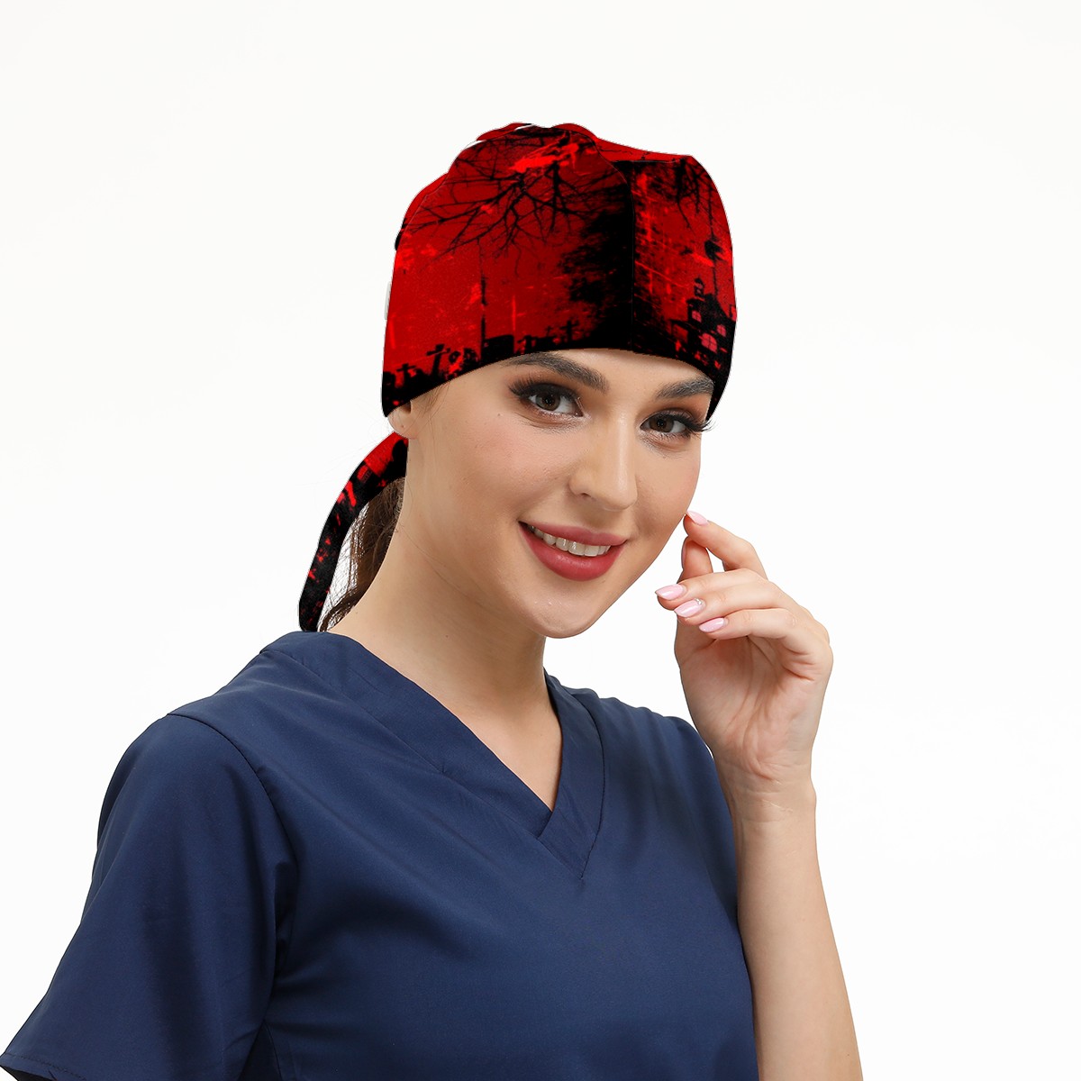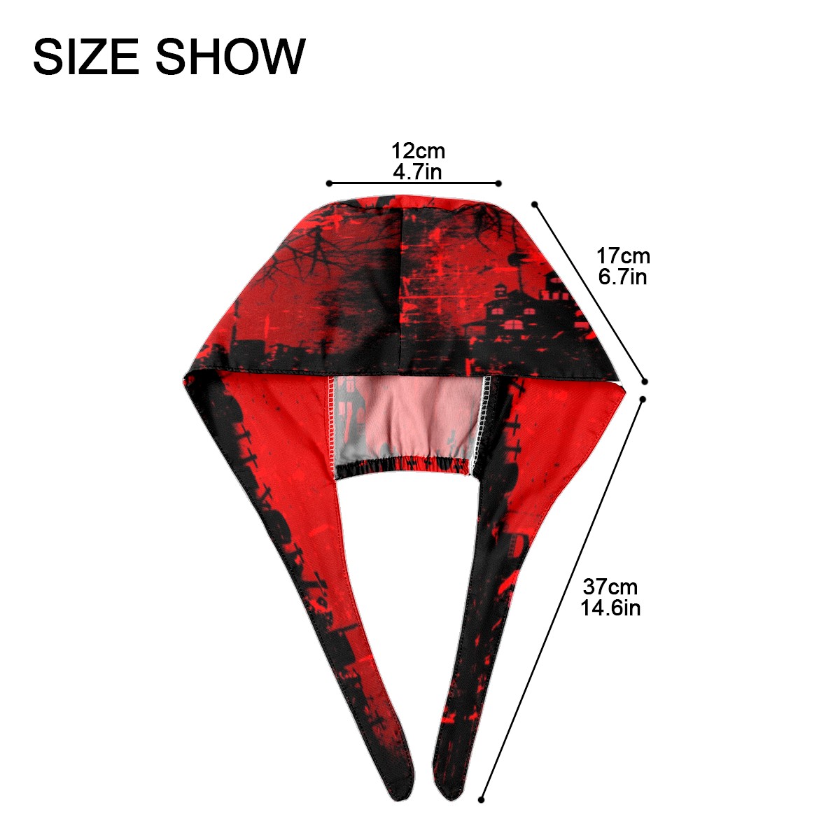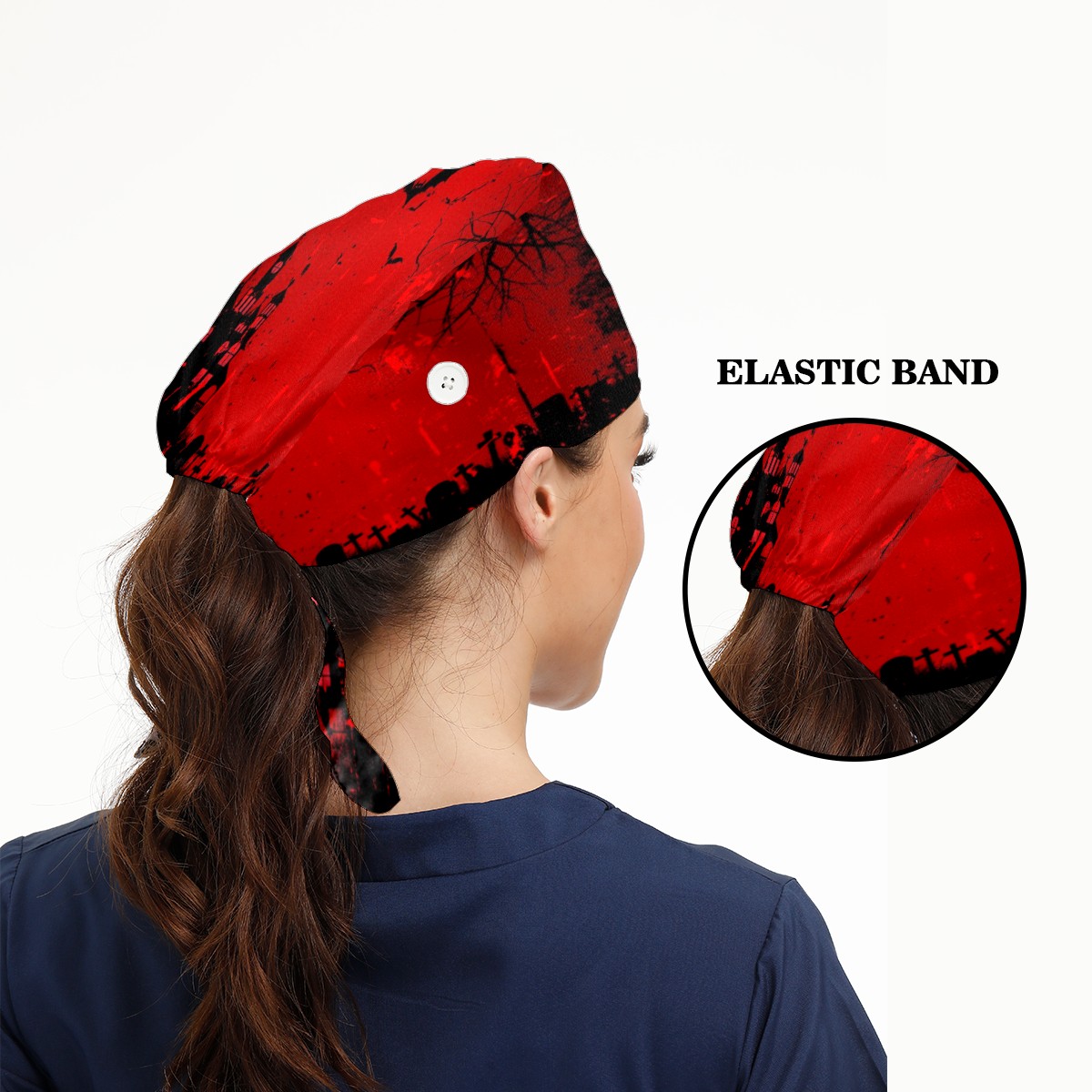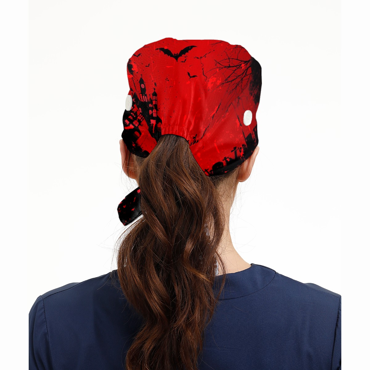 Blood Red Halloween Haunted House Bat Working Cap Button and Sweatband Adjustable Elastic Head Cover Hair Tie Back Work Hats for Women Men