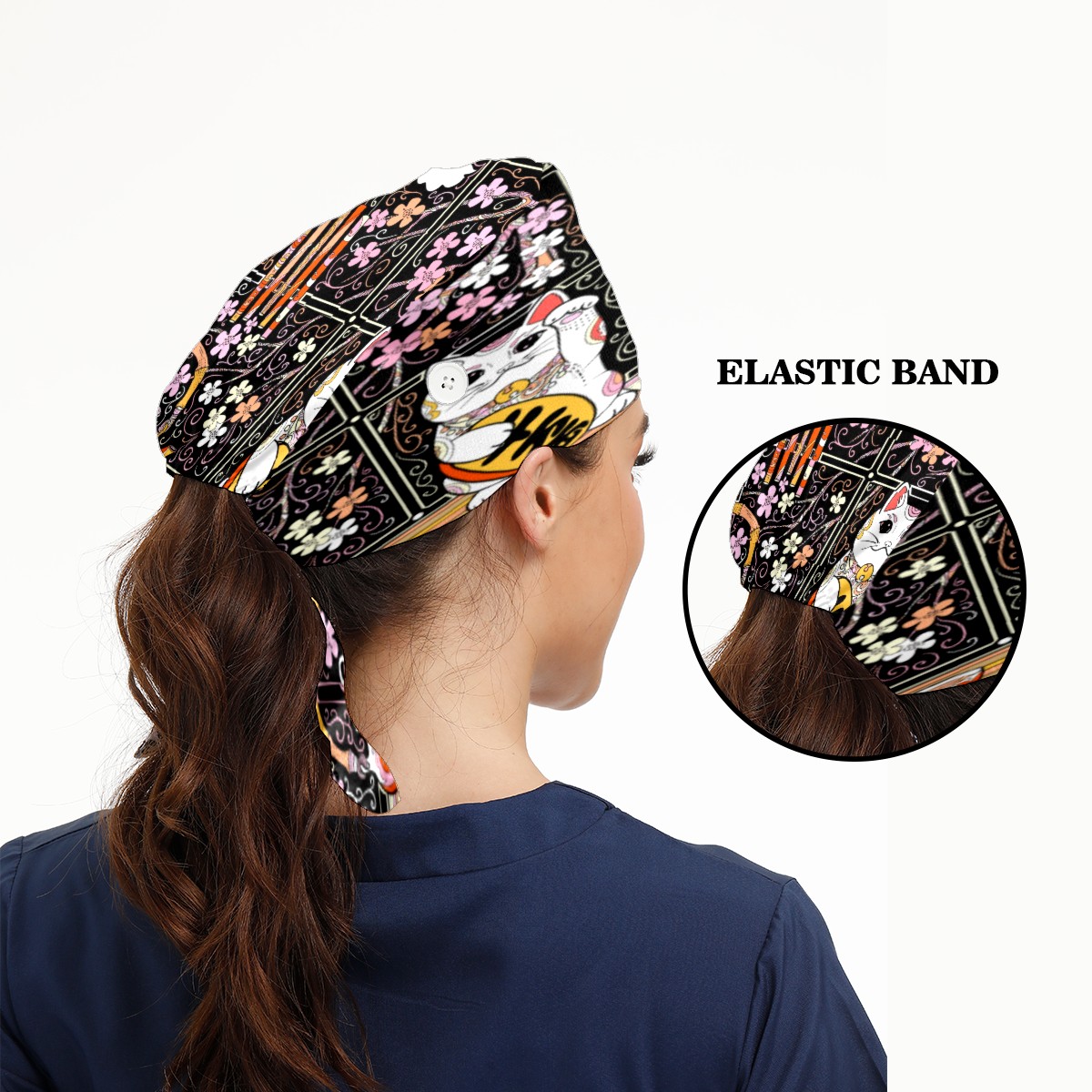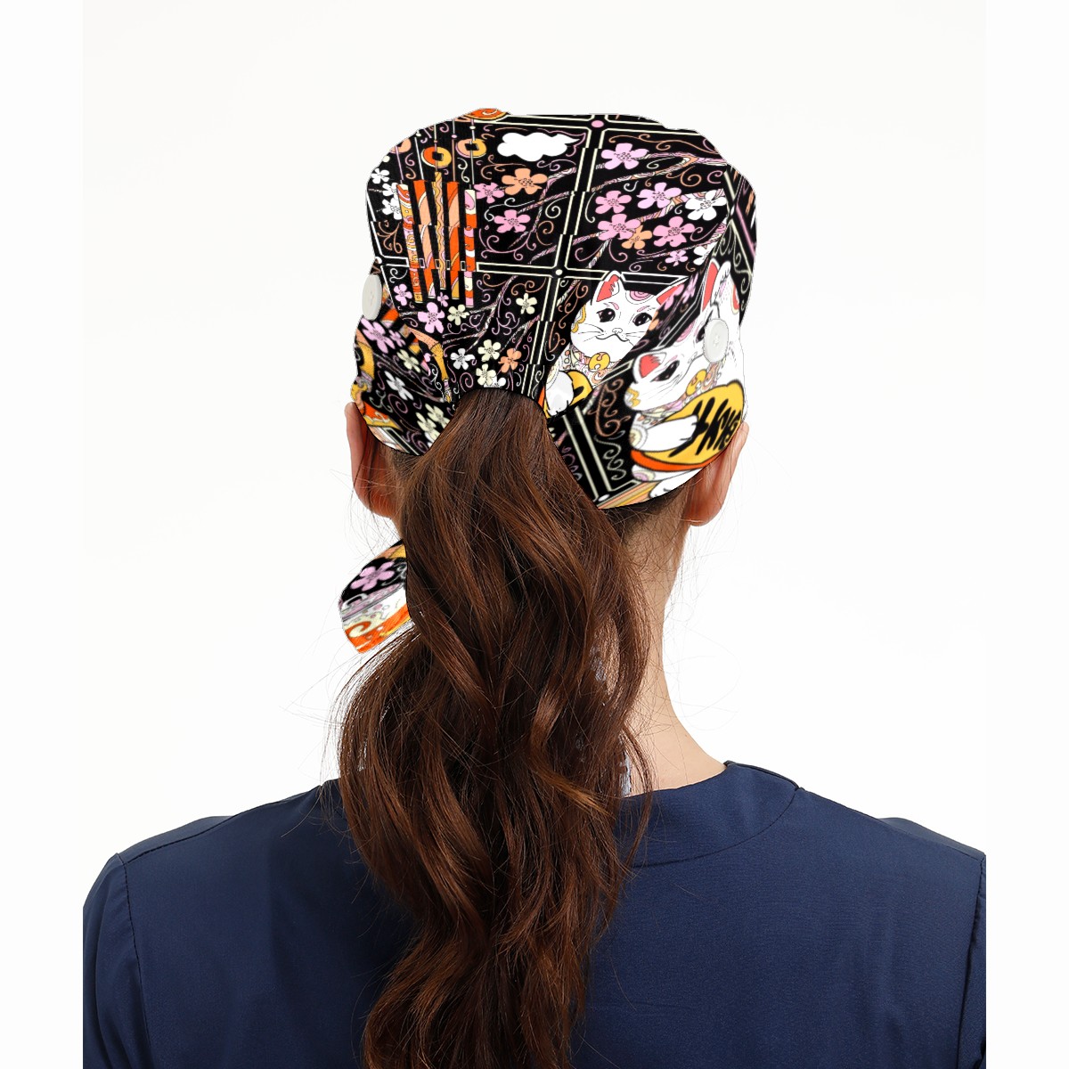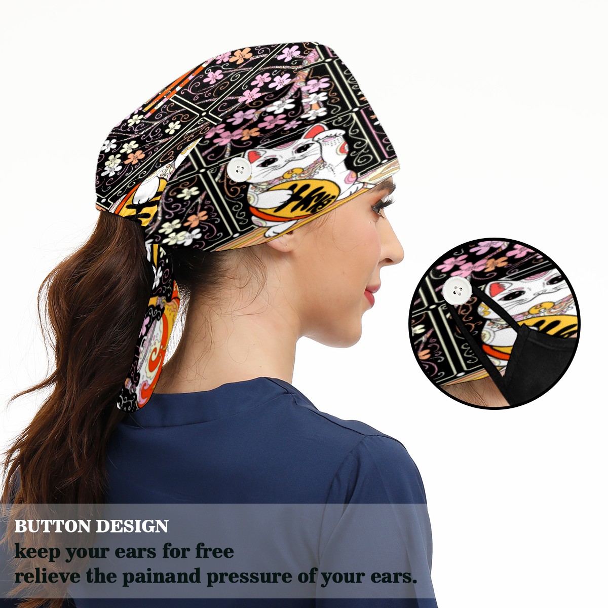 Japanese Retro Cherry Blossoms Lucky Cat Teapot Campanula Working Cap Button and Sweatband Adjustable Elastic Head Cover Hair Tie Back Work Hats for Women Men