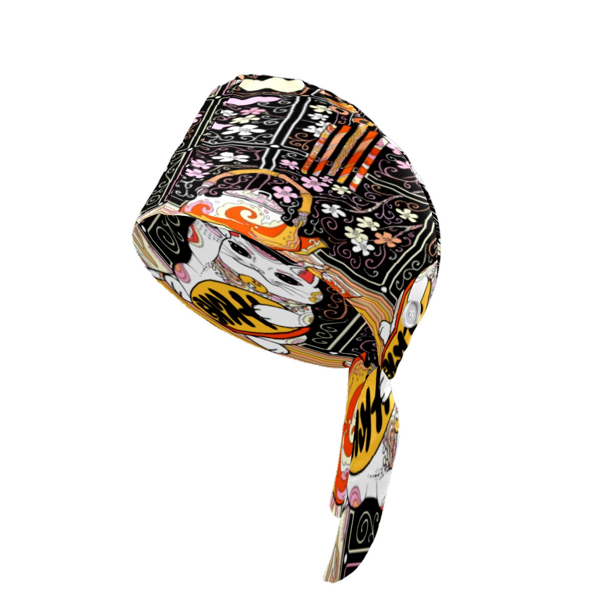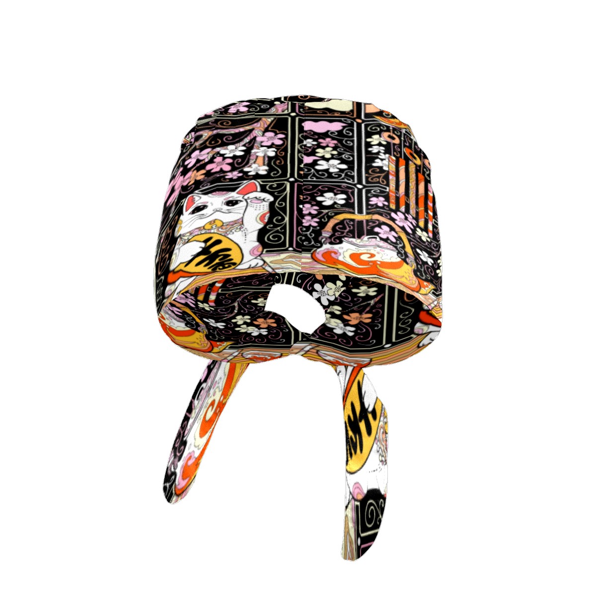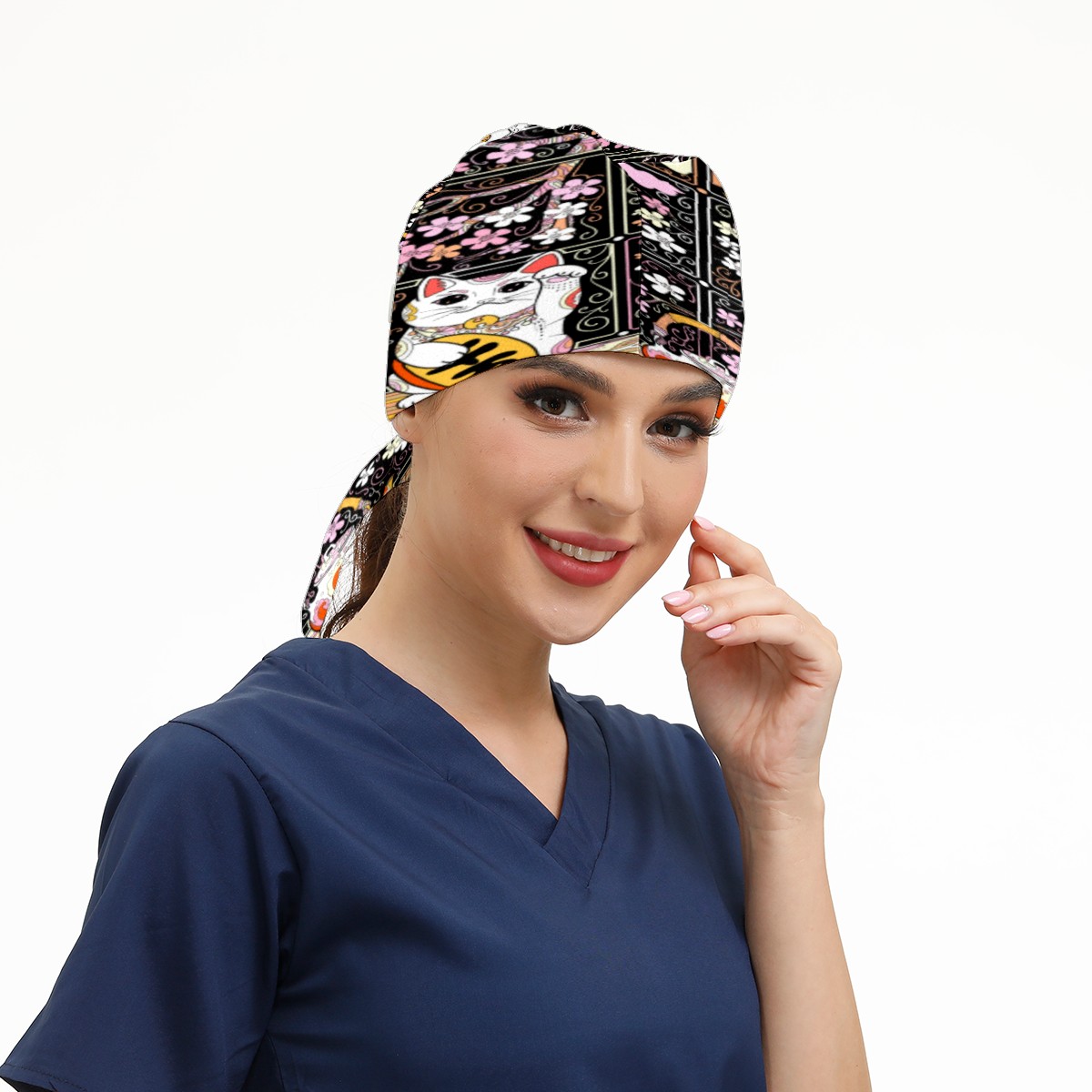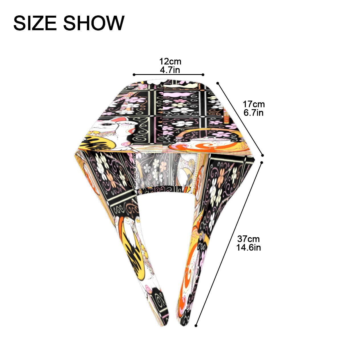 Japanese Retro Cherry Blossoms Lucky Cat Teapot Campanula Working Cap Button and Sweatband Adjustable Elastic Head Cover Hair Tie Back Work Hats for Women Men