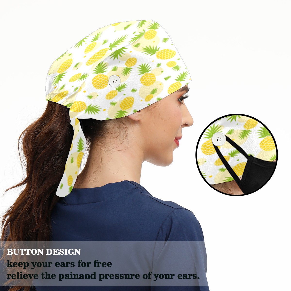 <p>Working cap with Sweatband and Button for Women Men</p><p>Material&nbsp;: 50% cotton+50% polyester</p><p>Size:&nbsp;One size fits most,&nbsp;suitable for both men and women.</p><p>Working Cap with Buttons Design:special&nbsp;design with buttons to protect ears for those who are wearing ma-sk. These new styles hats will allow you to put the straps around the buttons instead of your ears, make you feel more comfortable.</p><p>Sweat-absorbent towel cloth inside: Built-in&nbsp;100% cotton sweatband, keep the forehead clean after long time working.</p><p>Widely occasion: Widely used in beauty spa, house cleaning, cooking, sleeping, or for cos-play&nbsp;party.</p><p>Lovely pattern: lovely&nbsp;3D printed&nbsp;pattern,&nbsp;it's perfect for gift to you family&nbsp;and friends.</p>