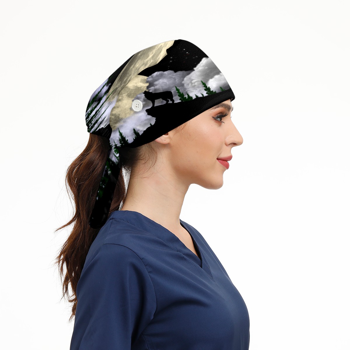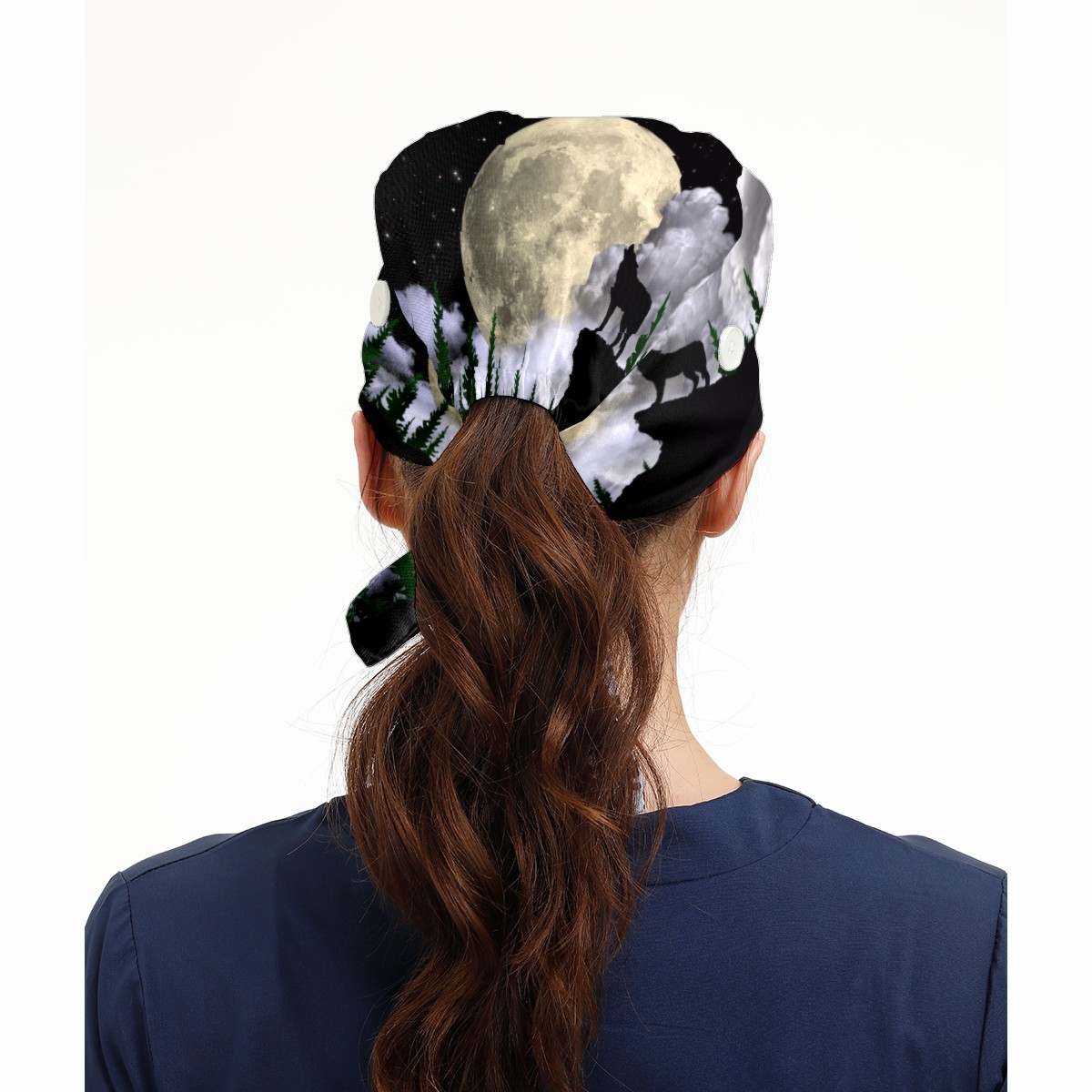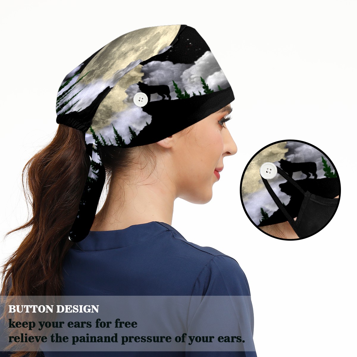 Wolf Howling Full Moon Forest Night Working Cap Button and Sweatband Adjustable Elastic Head Cover Hair Tie Back Work Hats for Women Men