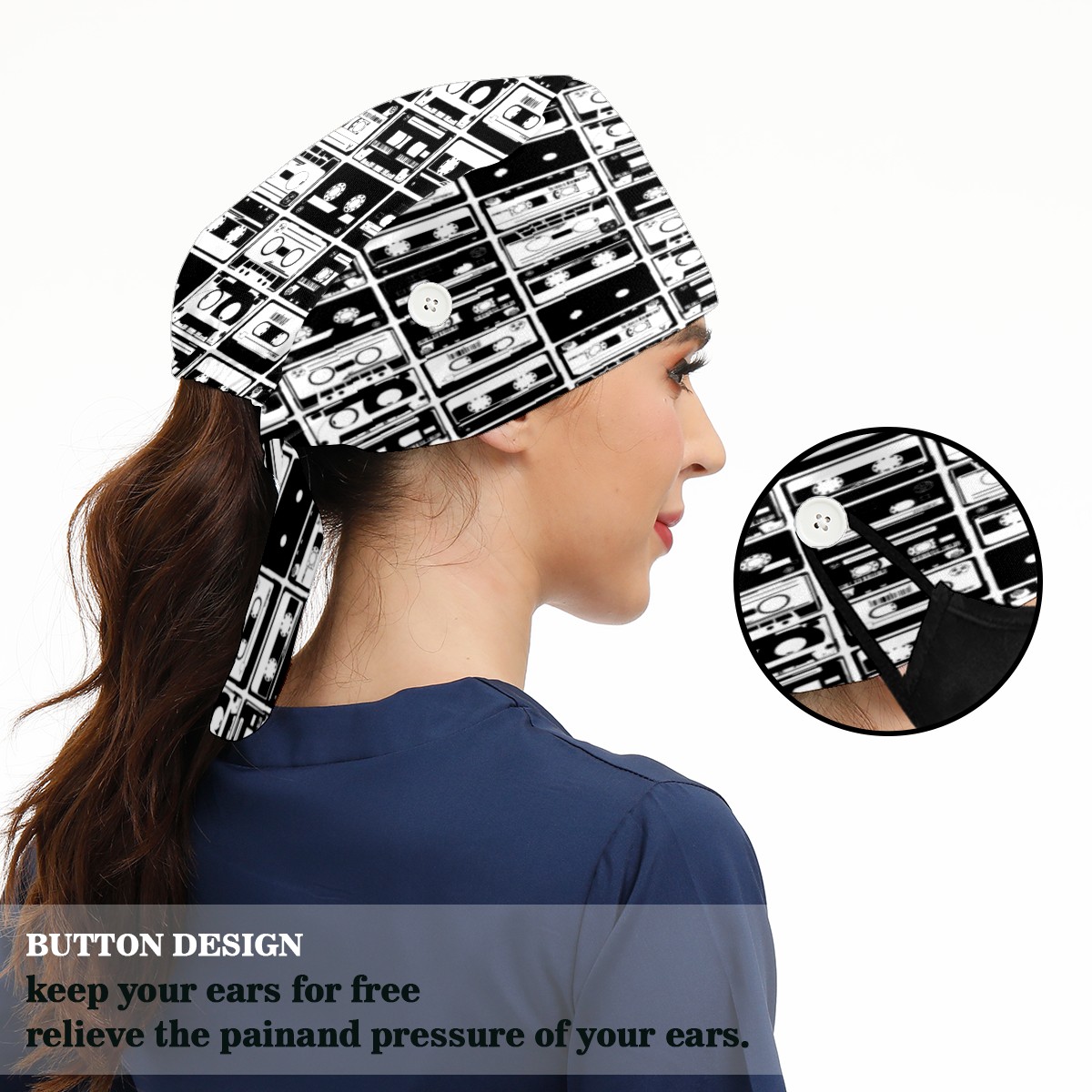 <p>Working cap with Sweatband and Button for Women Men</p><p>Material&nbsp;: 50% cotton+50% polyester</p><p>Size:&nbsp;One size fits most,&nbsp;suitable for both men and women.</p><p>Working Cap with Buttons Design:special&nbsp;design with buttons to protect ears for those who are wearing ma-sk. These new styles hats will allow you to put the straps around the buttons instead of your ears, make you feel more comfortable.</p><p>Sweat-absorbent towel cloth inside: Built-in&nbsp;100% cotton sweatband, keep the forehead clean after long time working.</p><p>Widely occasion: Widely used in beauty spa, house cleaning, cooking, sleeping, or for cos-play&nbsp;party.</p><p>Lovely pattern: lovely&nbsp;3D printed&nbsp;pattern,&nbsp;it's perfect for gift to you family&nbsp;and friends.</p>