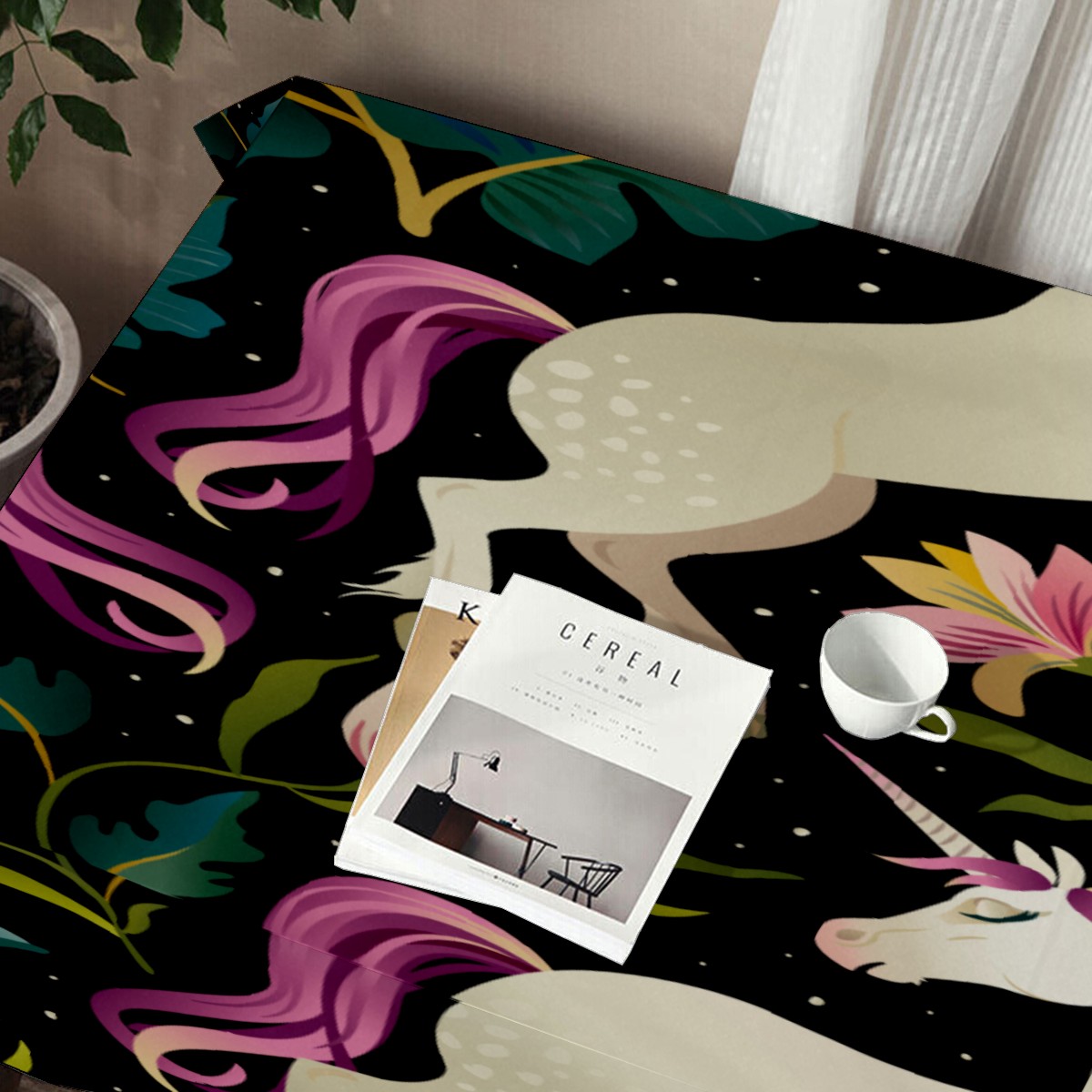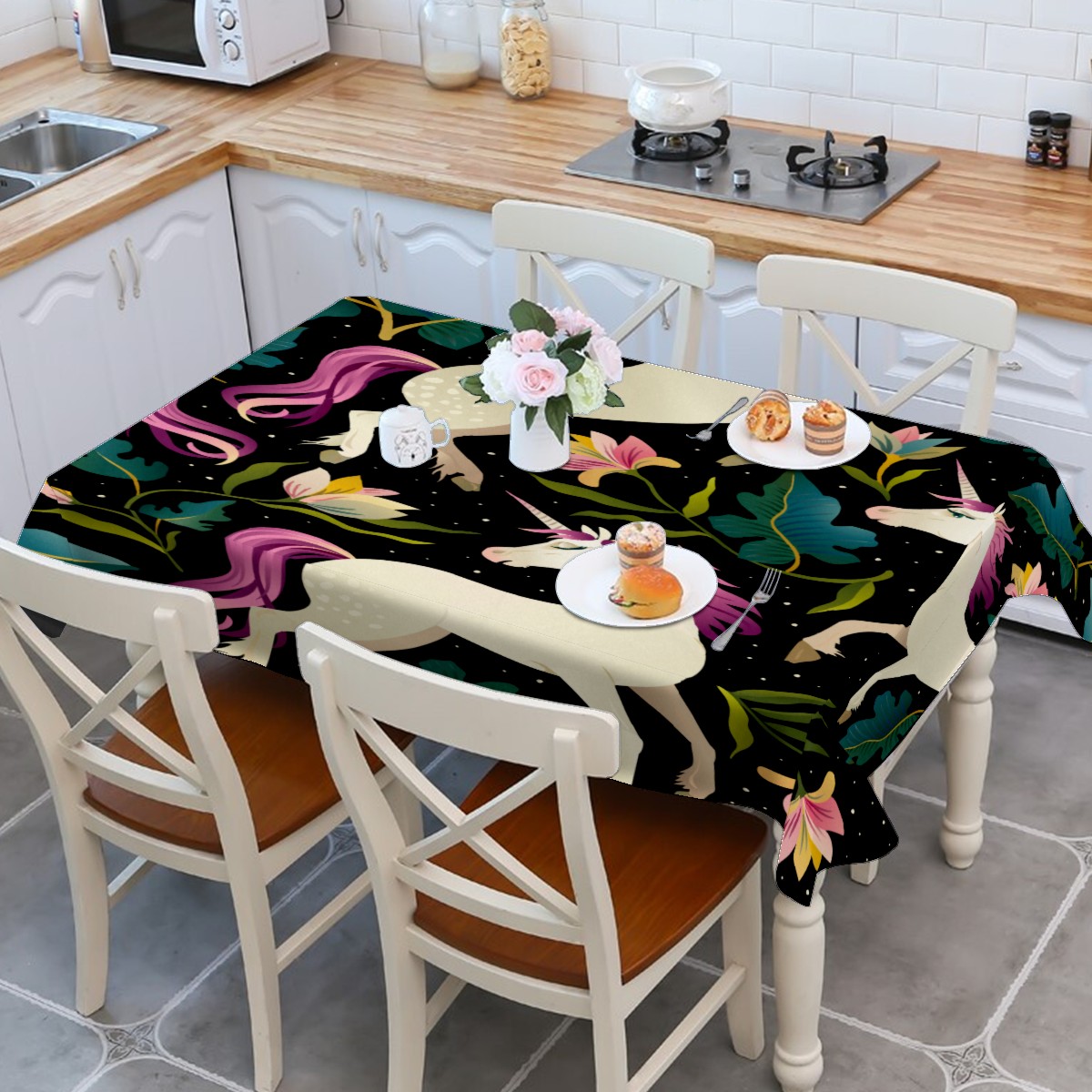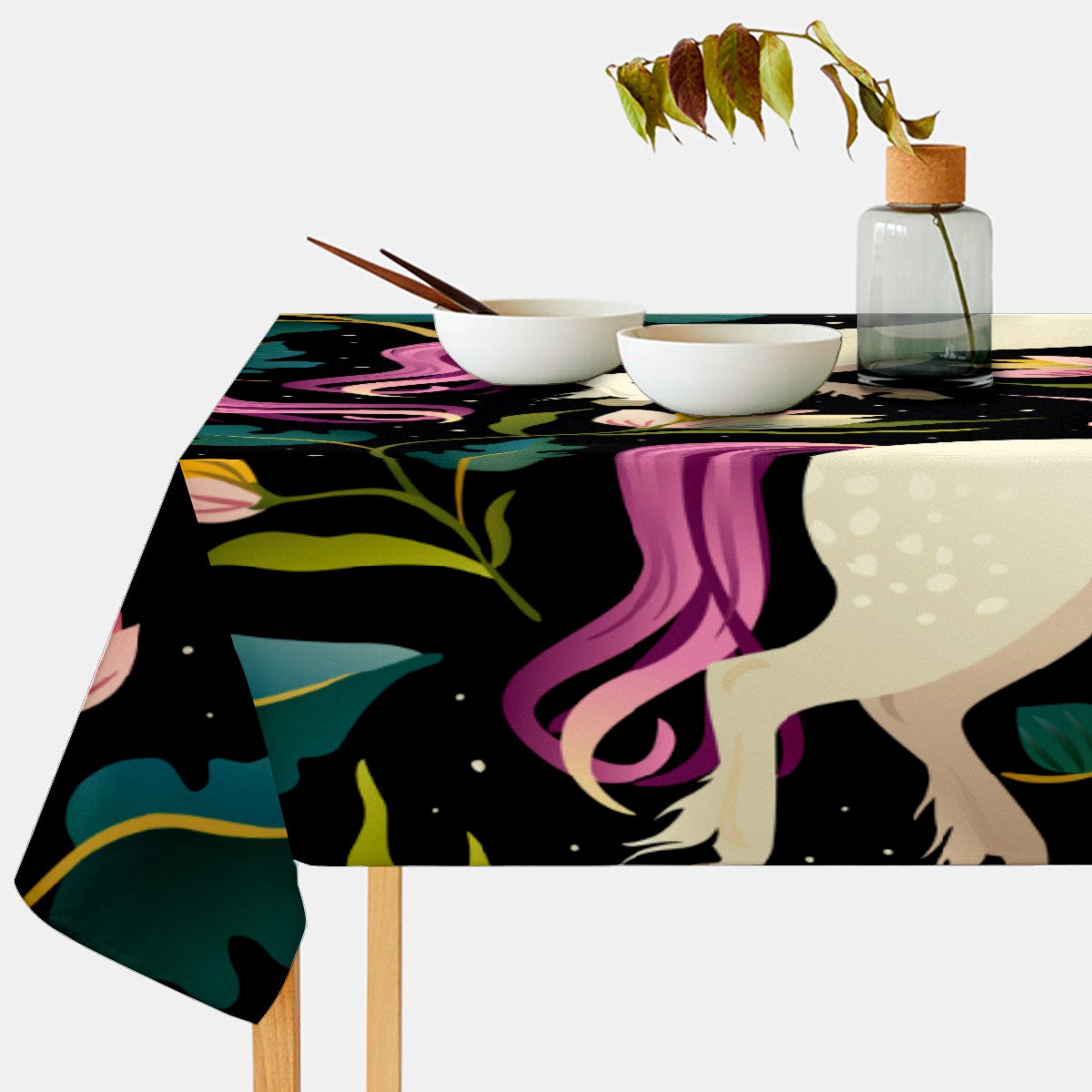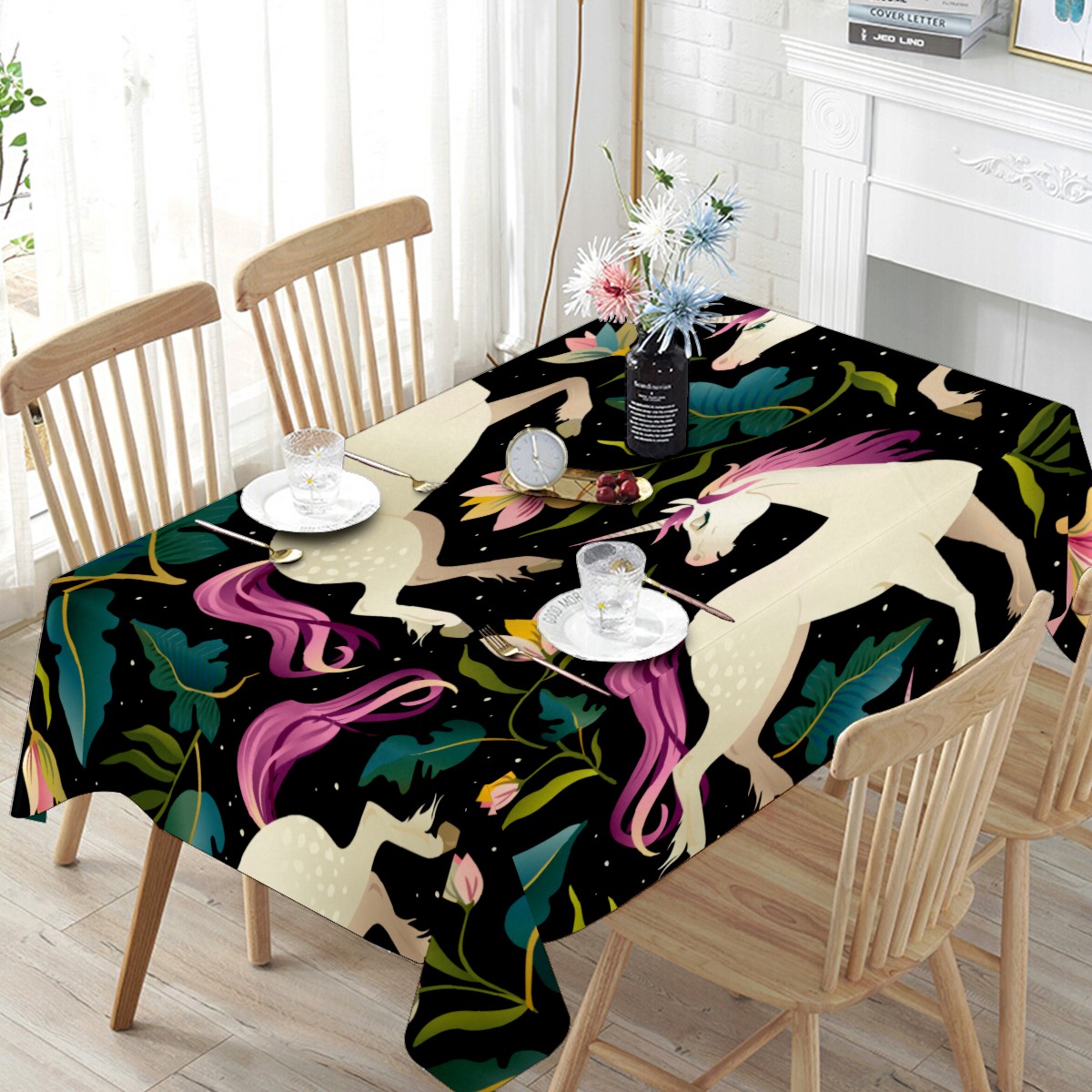 Rectangle Tablecloth Fancy Unicorn Jungle Leaves Floral Table Cloth 54x54in Table Cover for Kitchen Dining Table Party Home Decoration Washable Table Runner