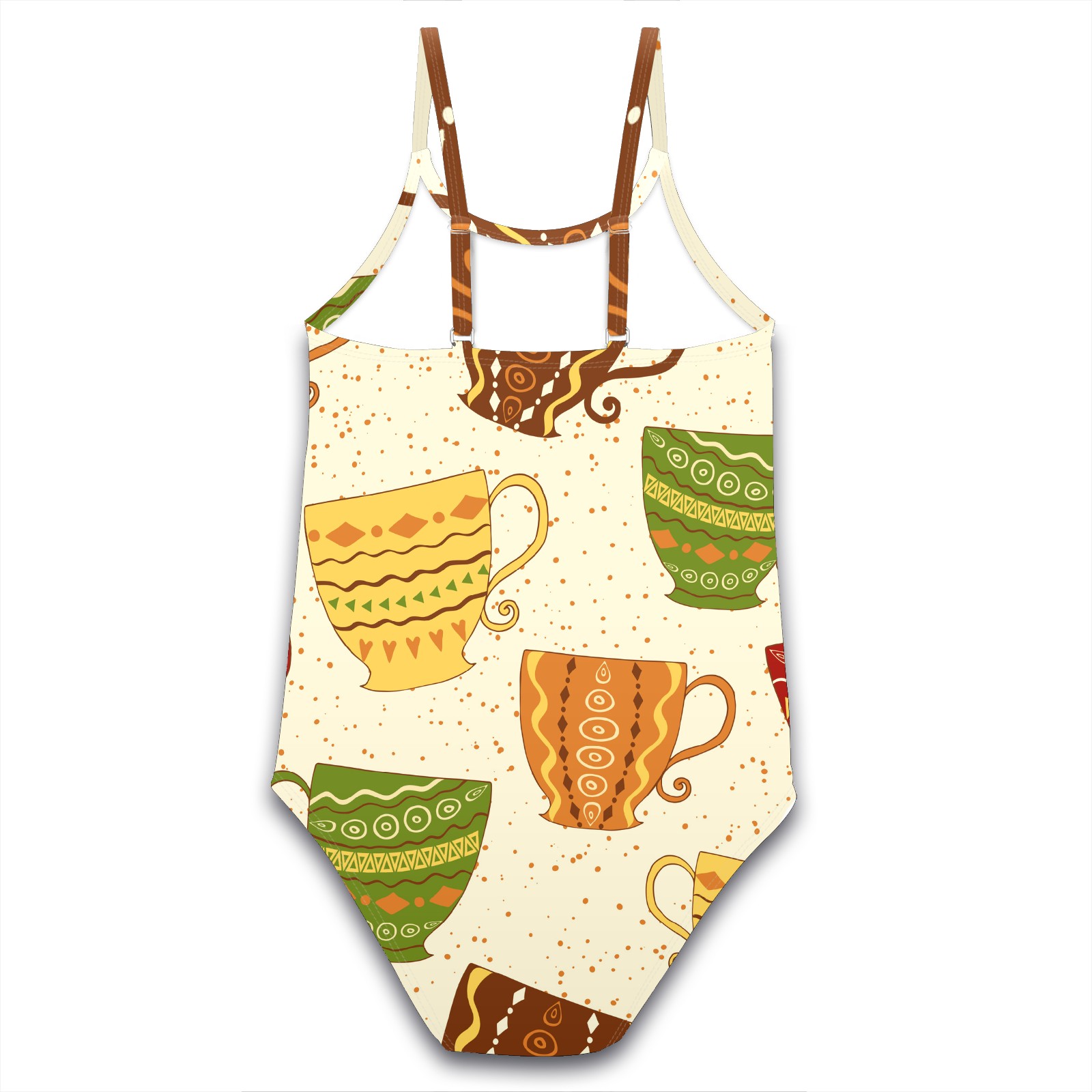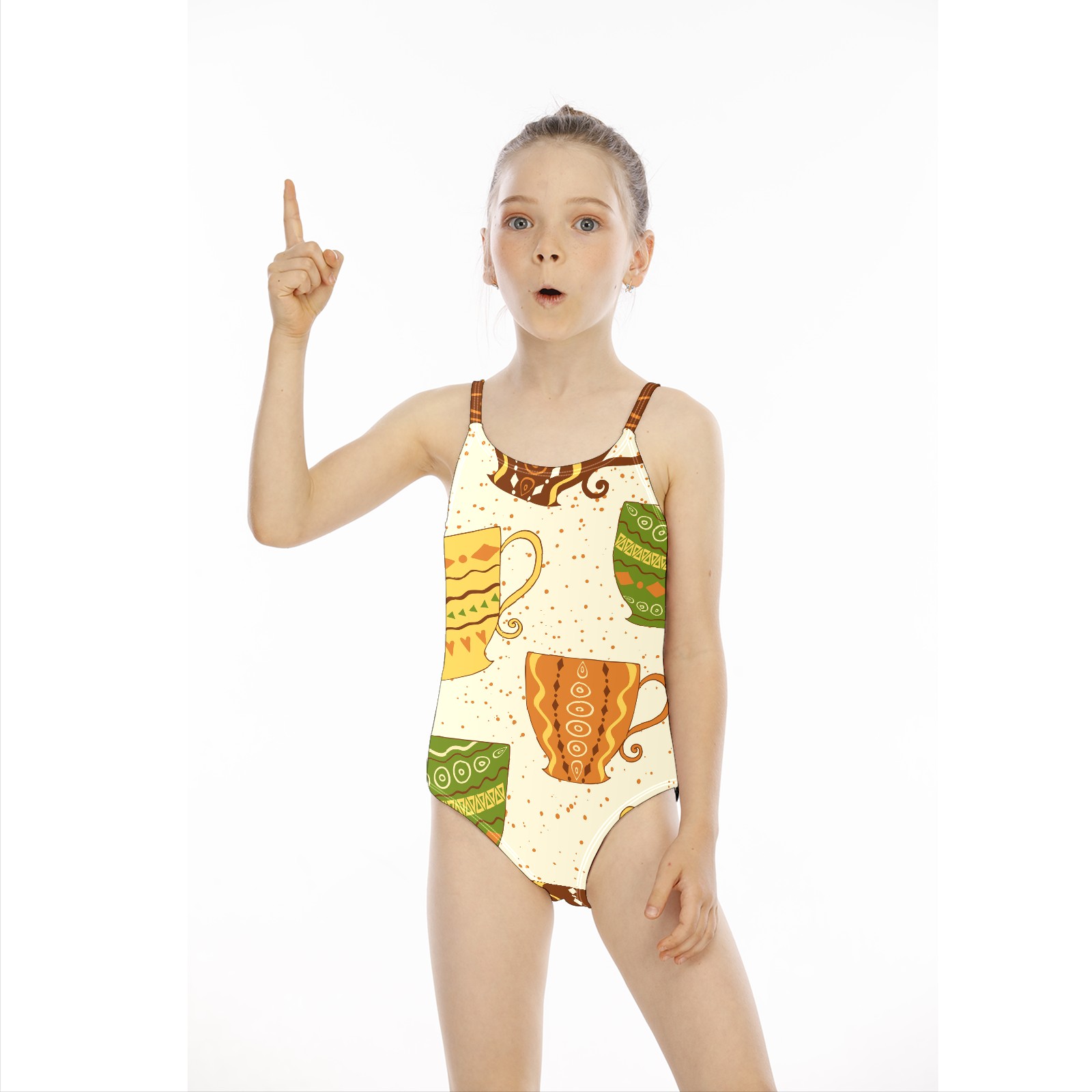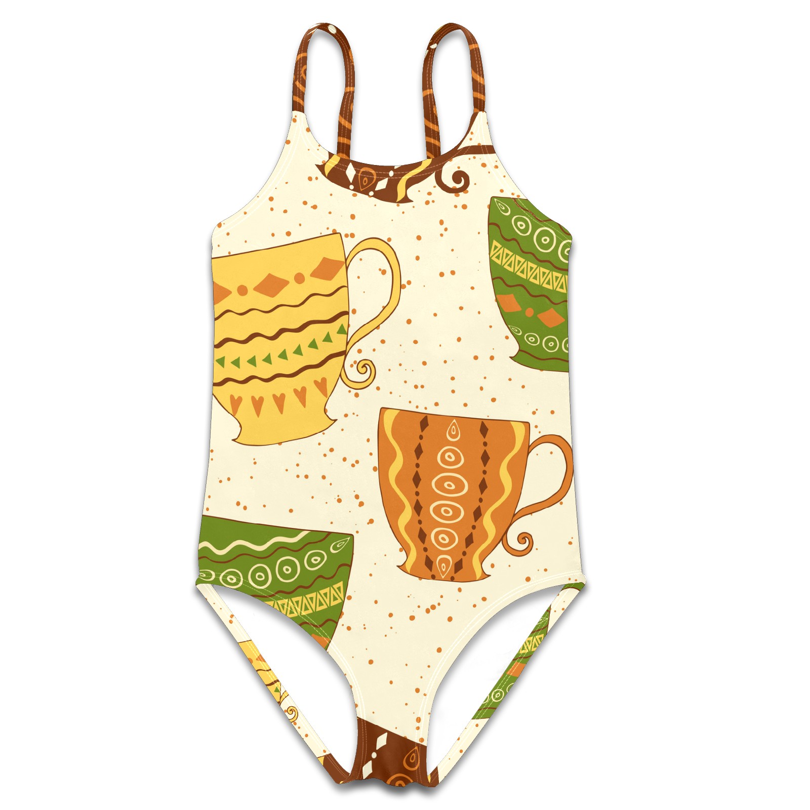 Girls Swimsuits One-Piece Vintage Boho Tea Cup Pattern Beach Swimwear Summer Bathing Suit